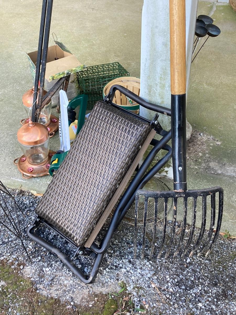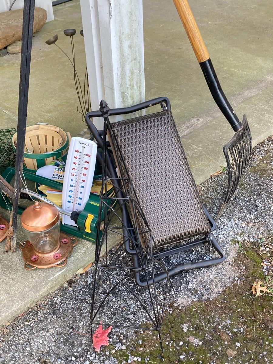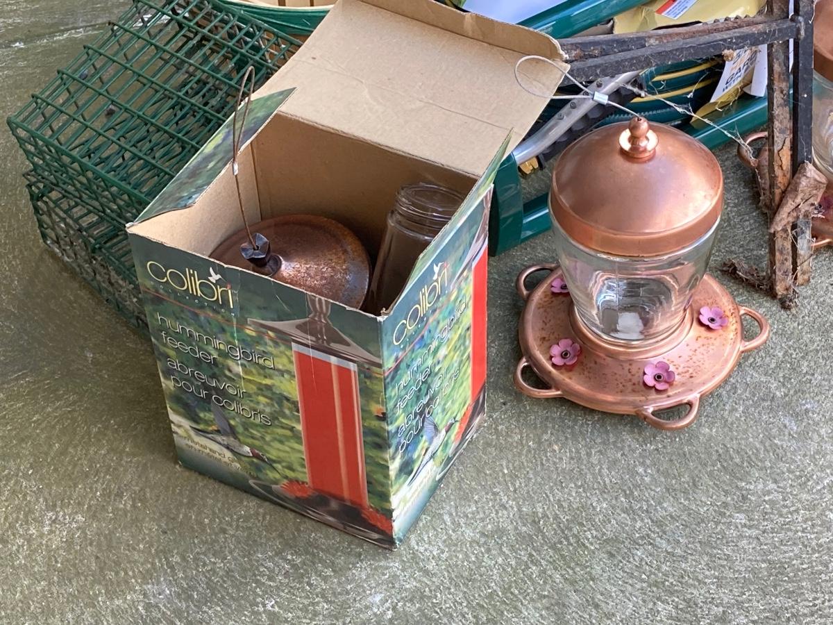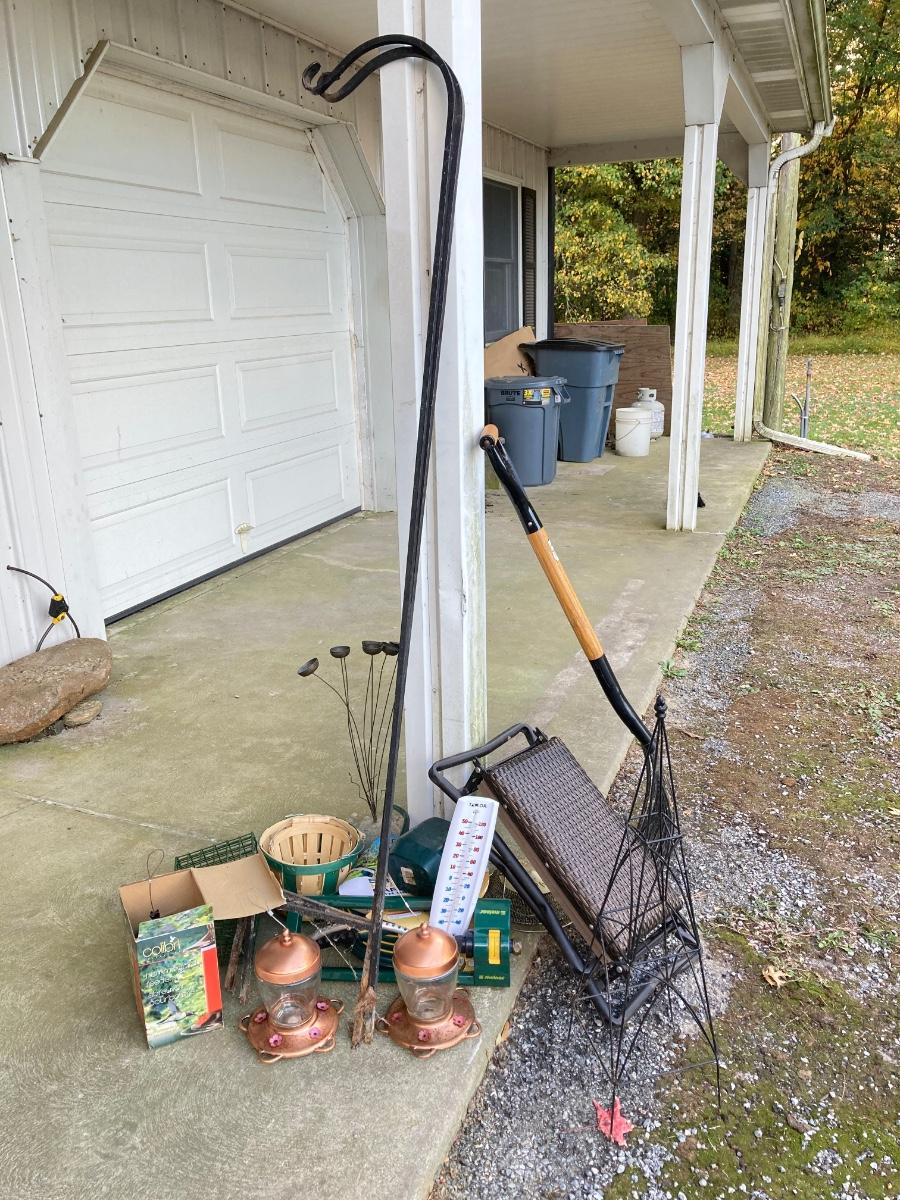 LOT 149: Large Garden Collection - Bird Feeders, Hose, Seat, Shepherd's Hooks, Pitch Fork, Sprinkler and More