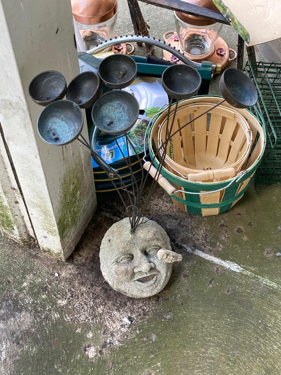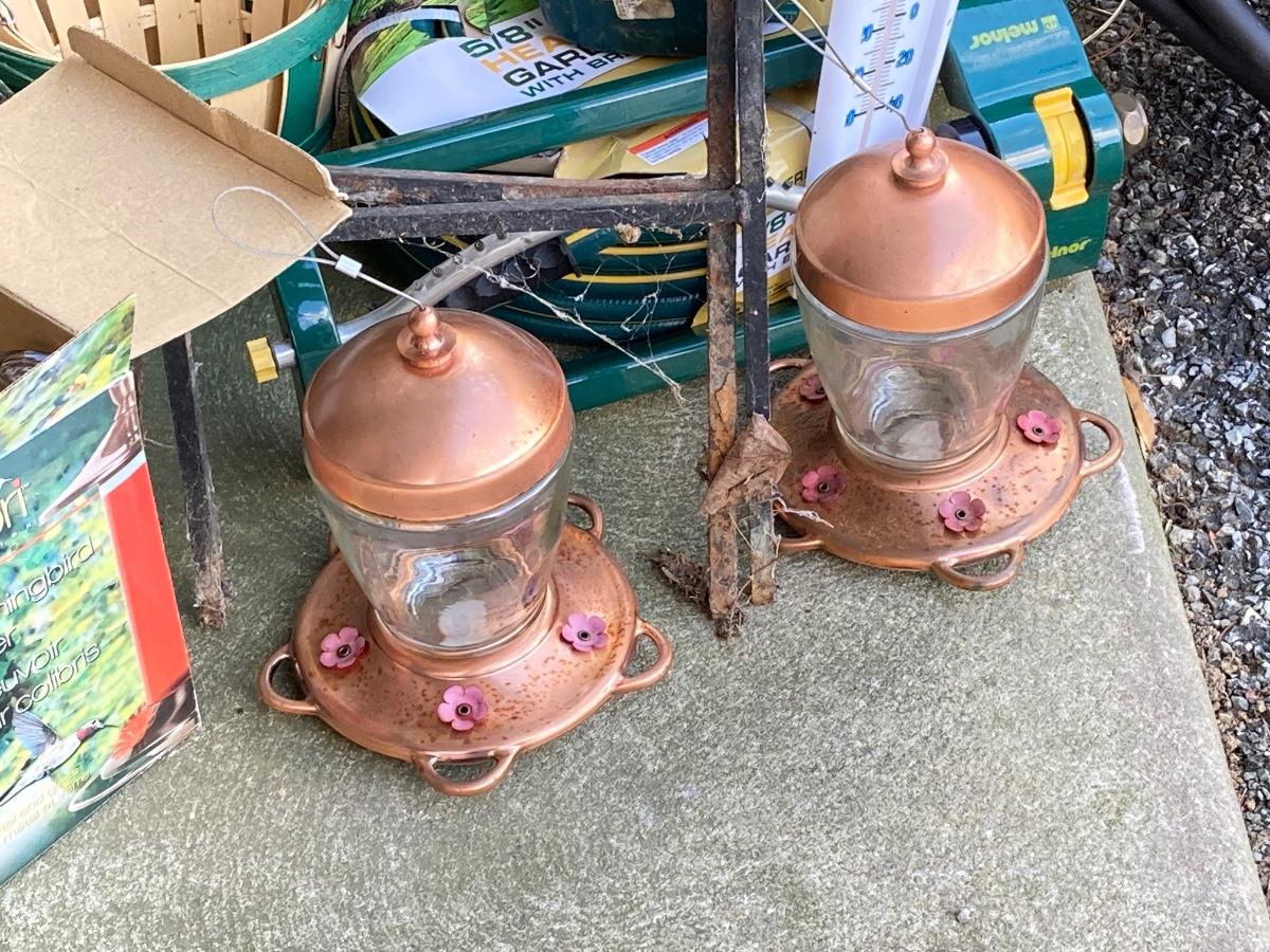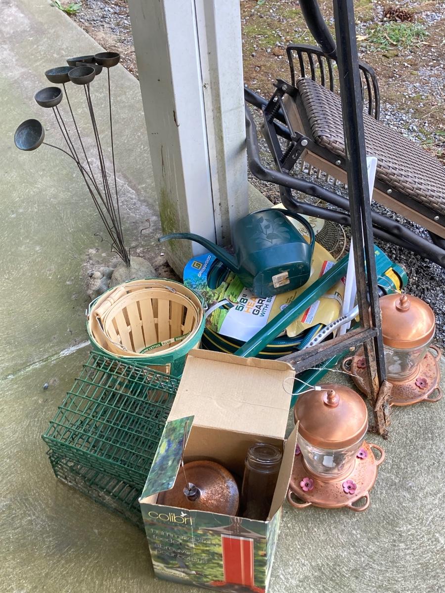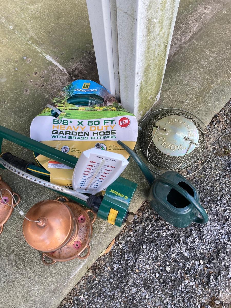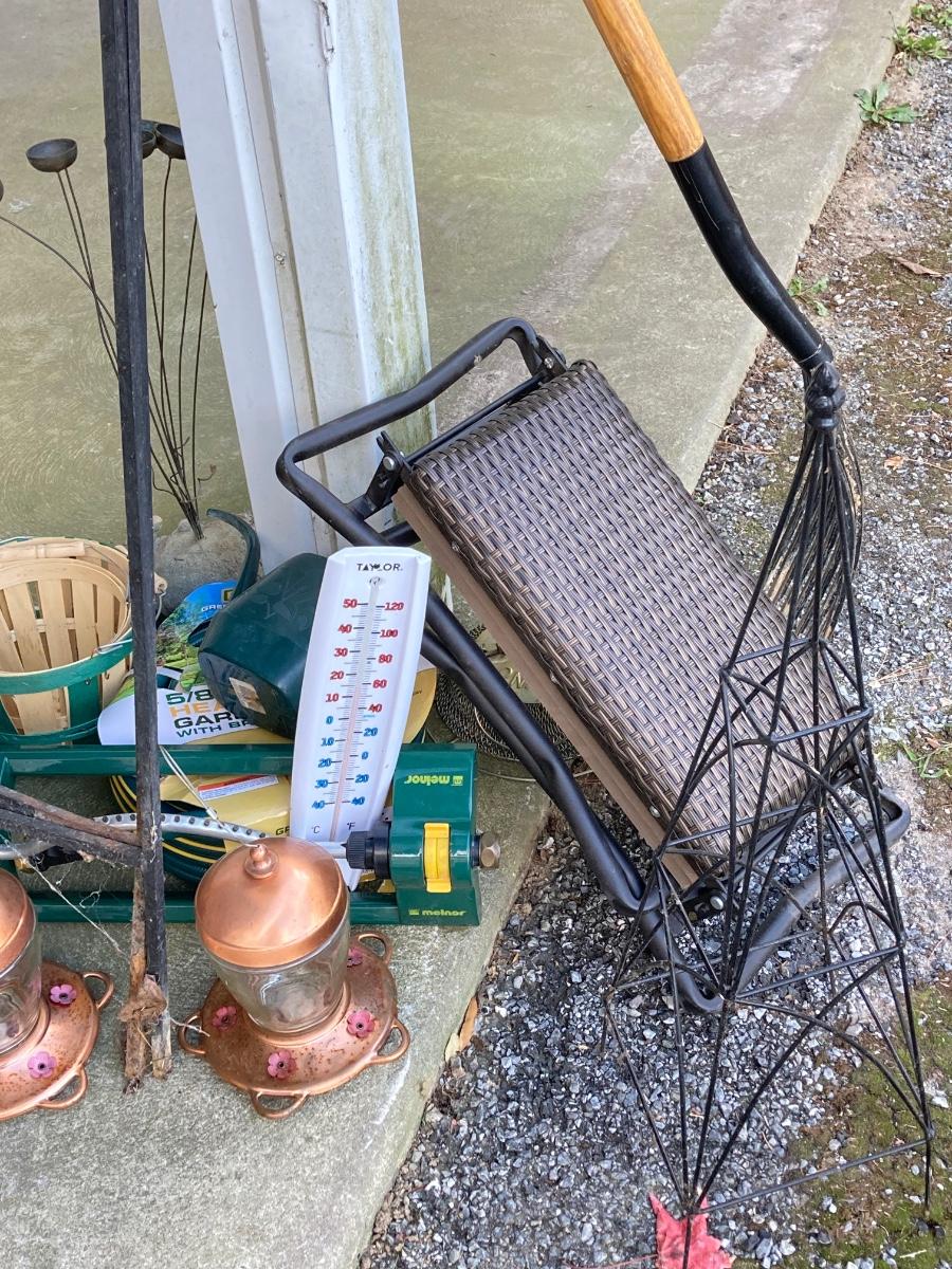 LOT 149: Large Garden Collection - Bird Feeders, Hose, Seat, Shepherd's Hooks, Pitch Fork, Sprinkler and More
