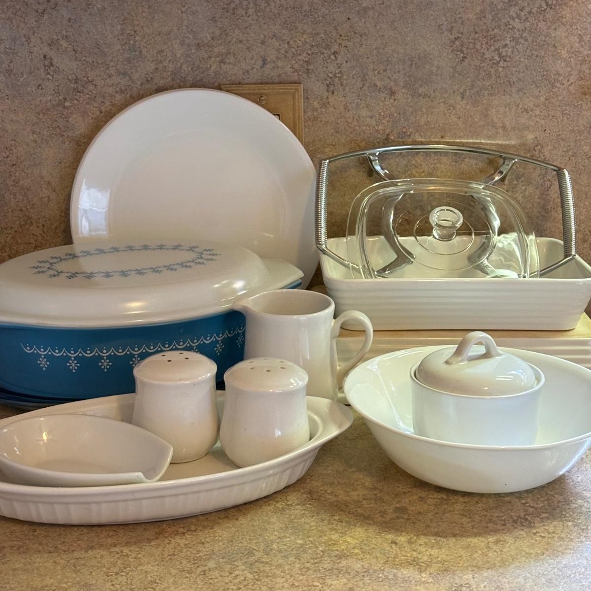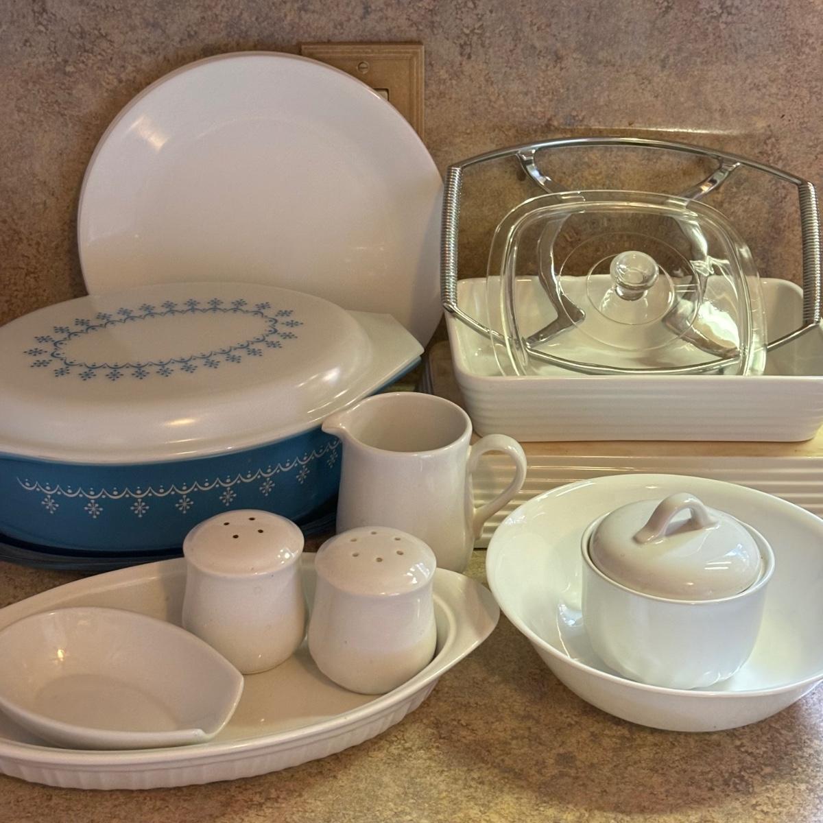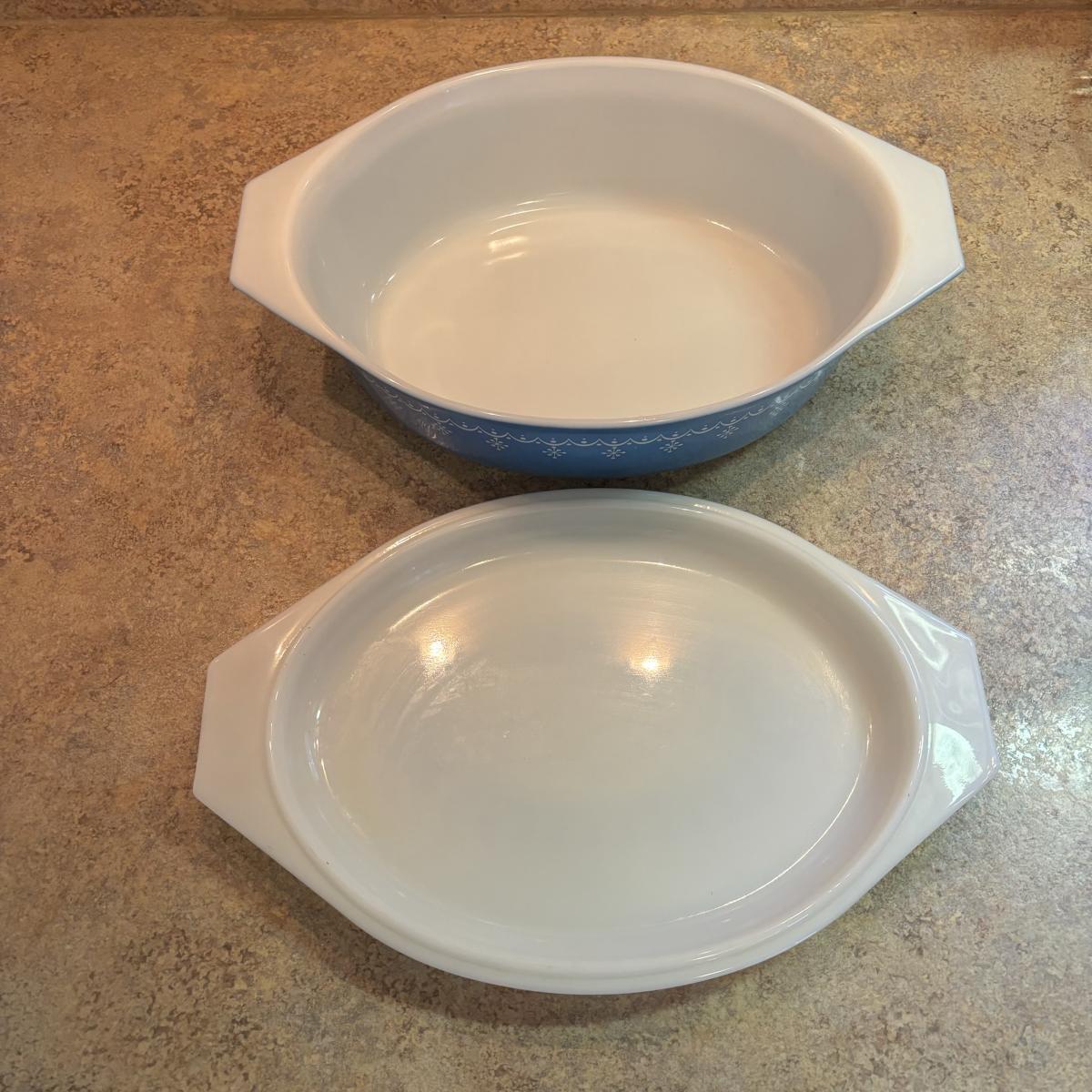 LOT 227: Pyrex Snowflake Garland Oval Dish w/Lid, Corelle, Coring Ware