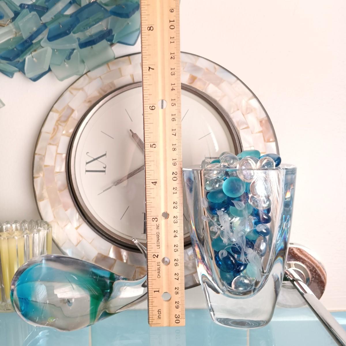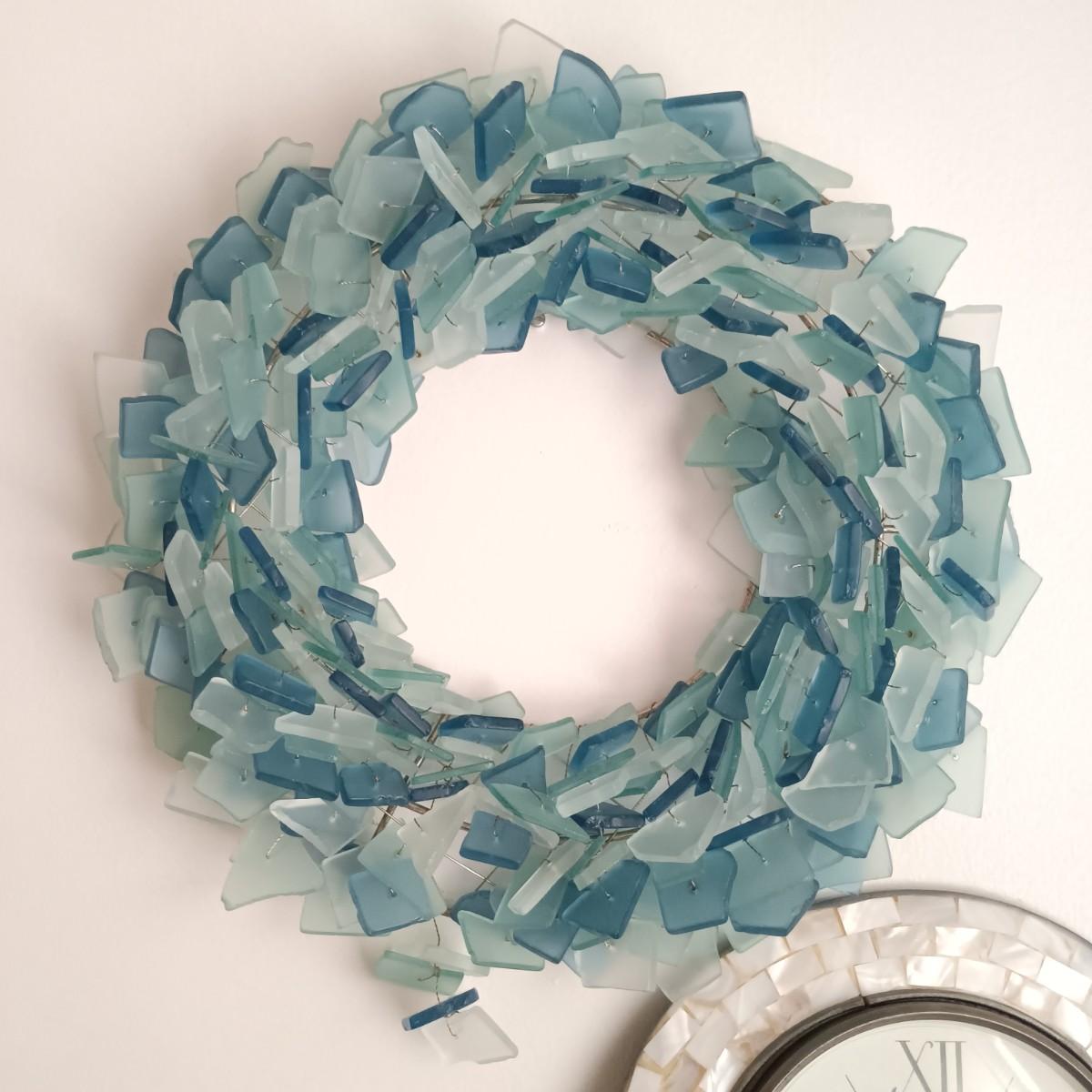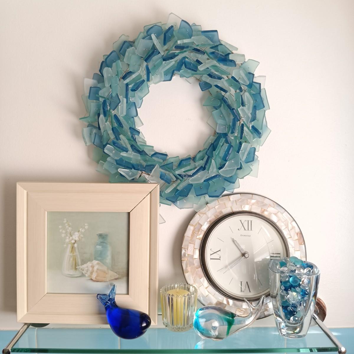 LOT 244: Nautical Themed Decor- Beach Glass Wreath, Glass Whales, Shell Clock & More