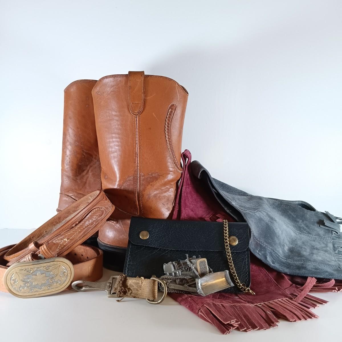 LOT 257: Double H 1608 Leather Cowboy Boots, Bulldozer belt buckle, Children's Fringe Vests, Belts & More