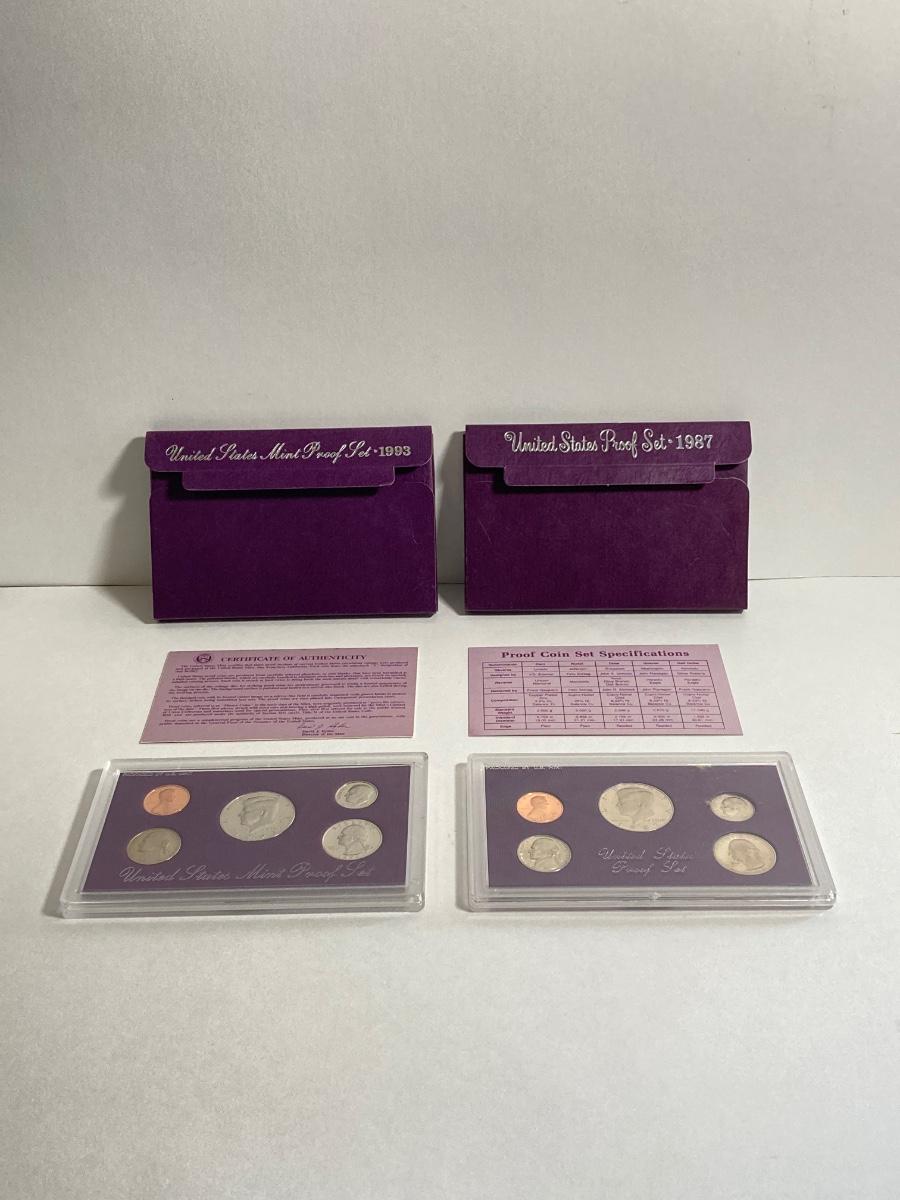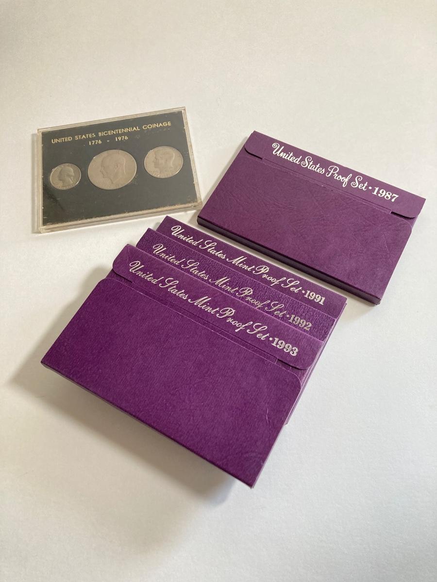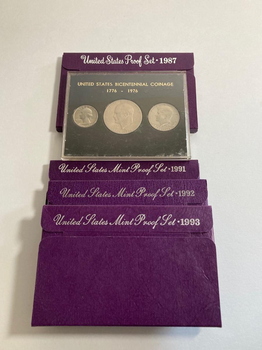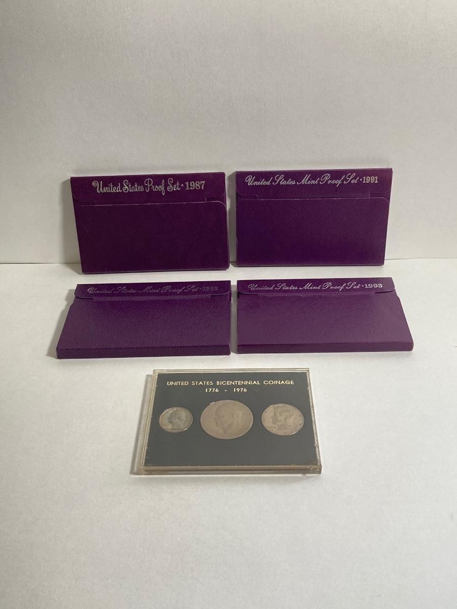 LOT 280: United States Mint Proof Sets - 1987, 1991, 1992, 1993 and Bicentennial Coinage 1776 - 1976 3 Piece Set
