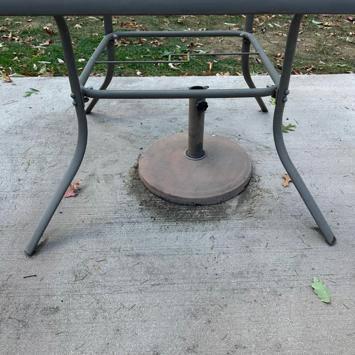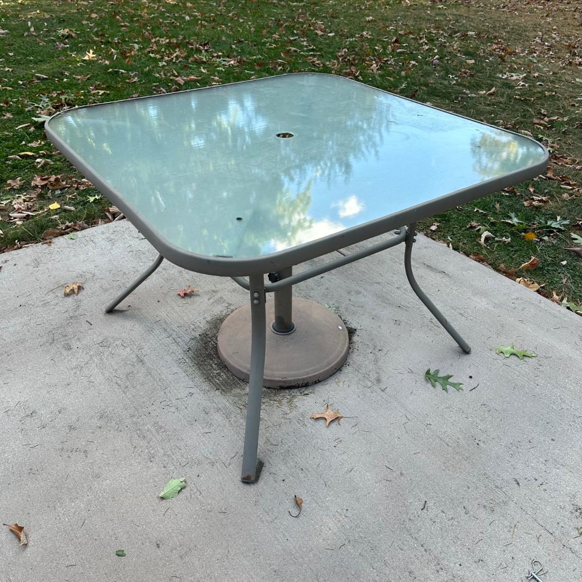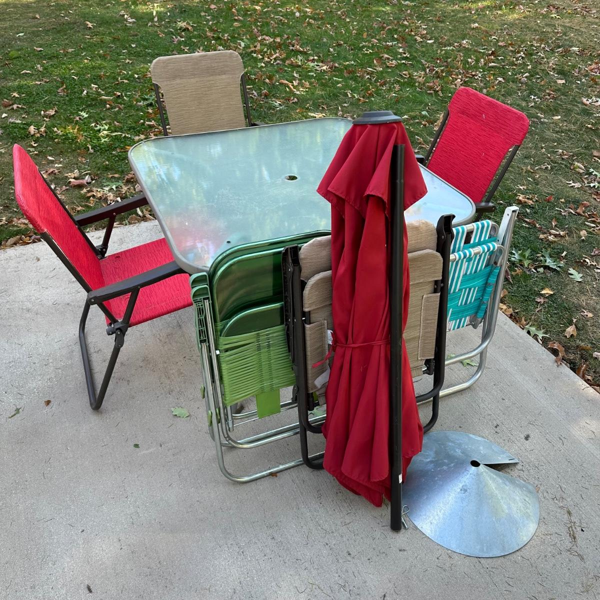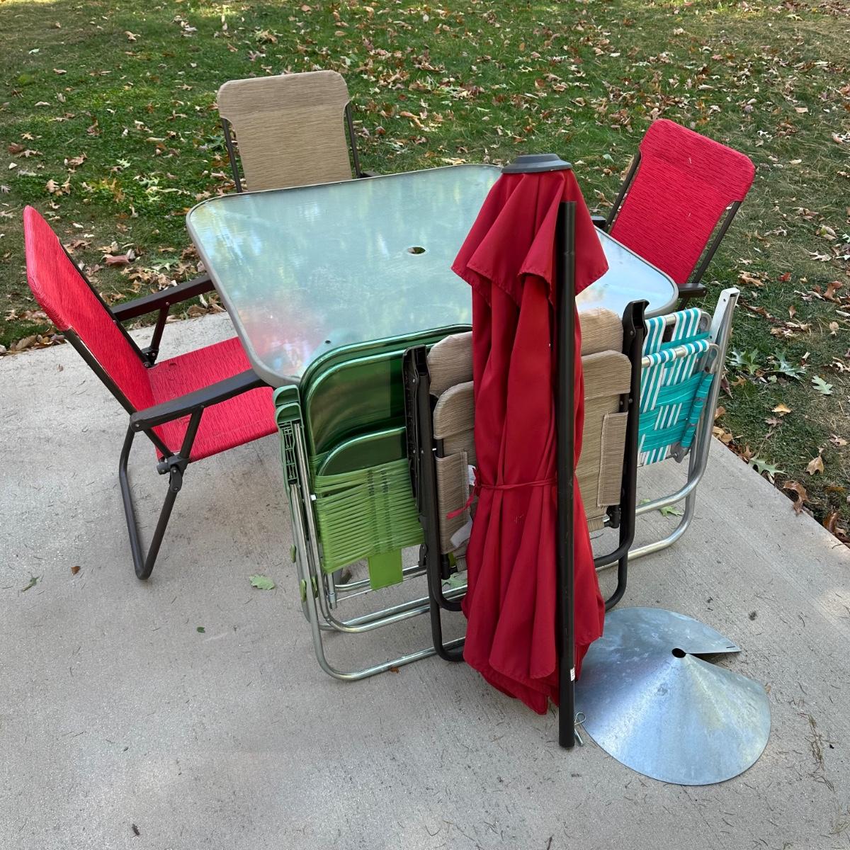 LOT 7S: Outdoor Patio Table w/ Umbrella & Folding Chairs/Beach Chairs
