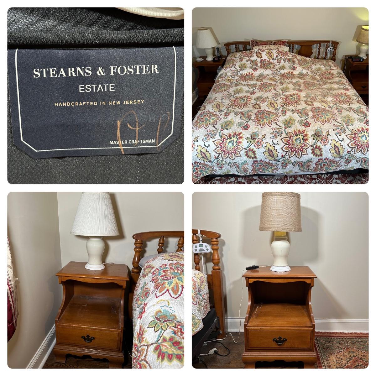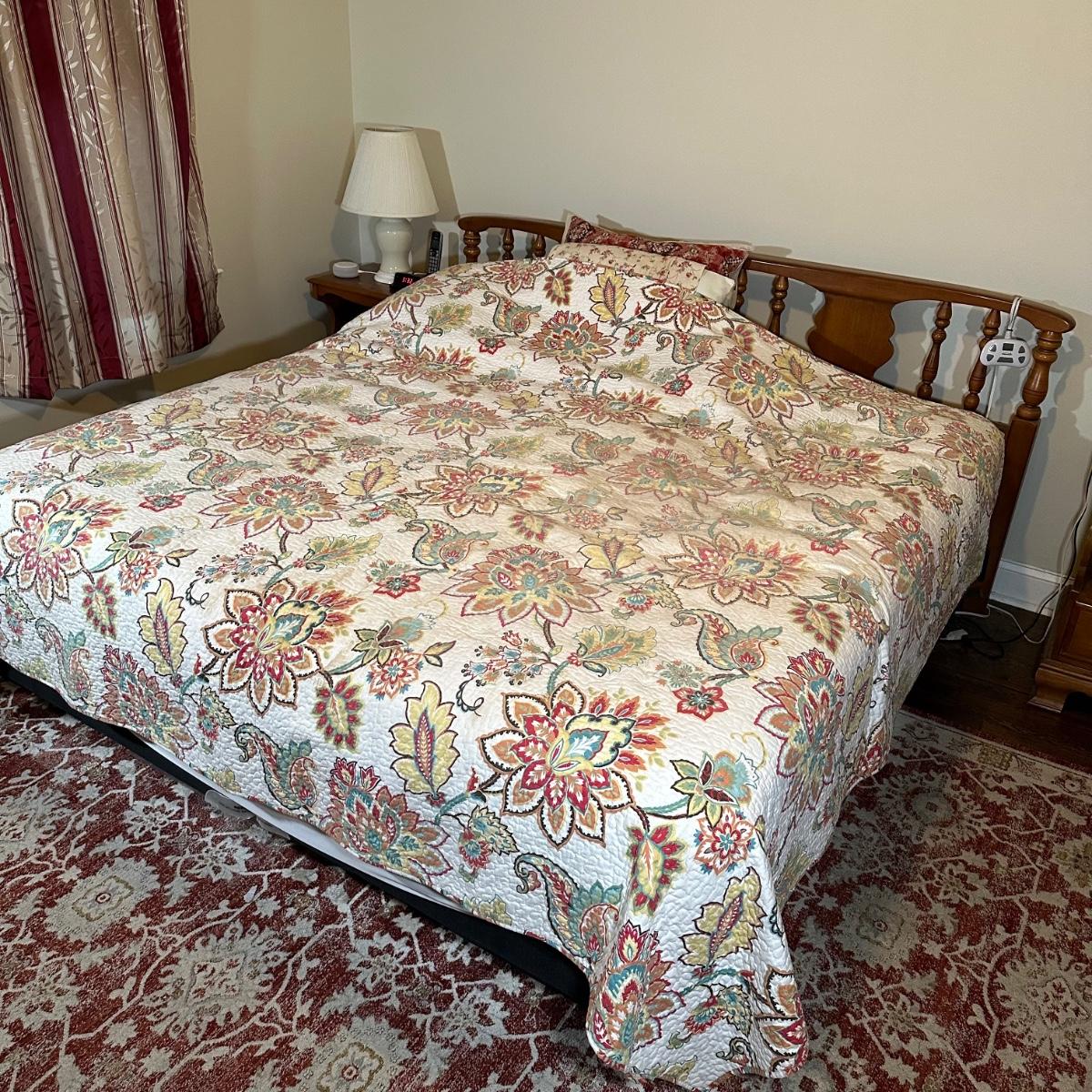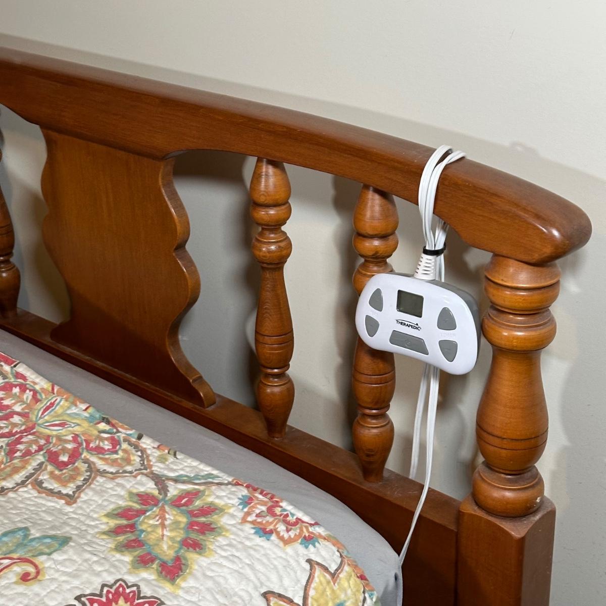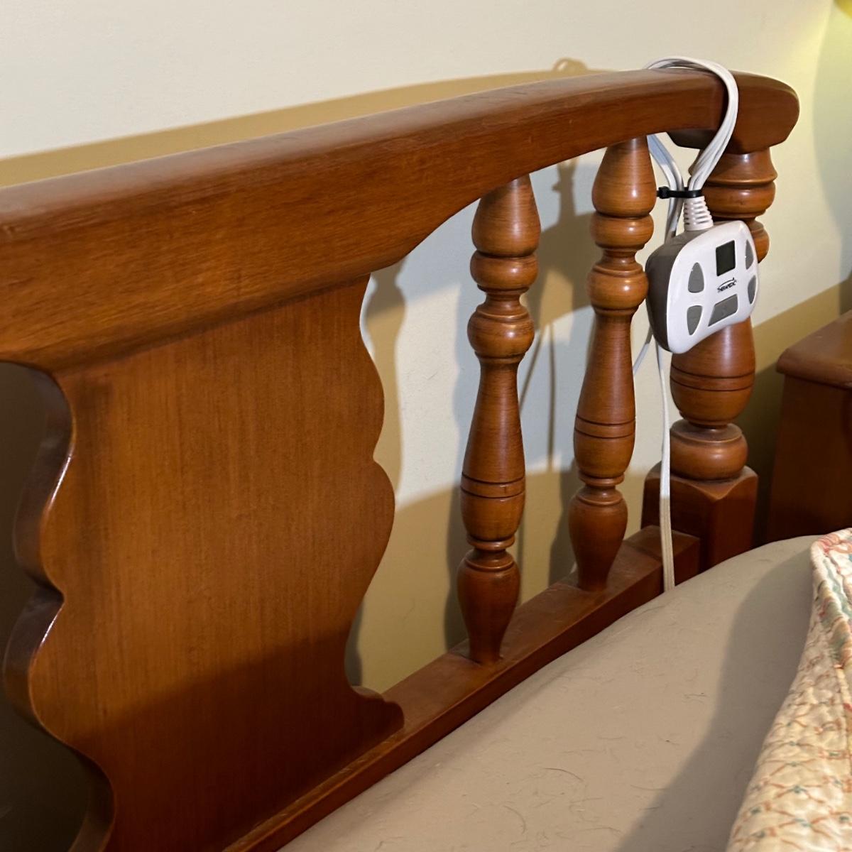 LOT 22Y: King Size Wooden Bed Frame/Headboard w/ Therapedic Electric Headed Blanket & Vintage Sumter Cabinet Co Side Tables & Lamps
