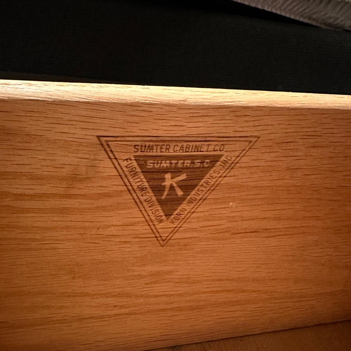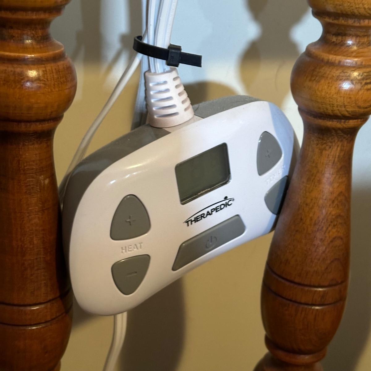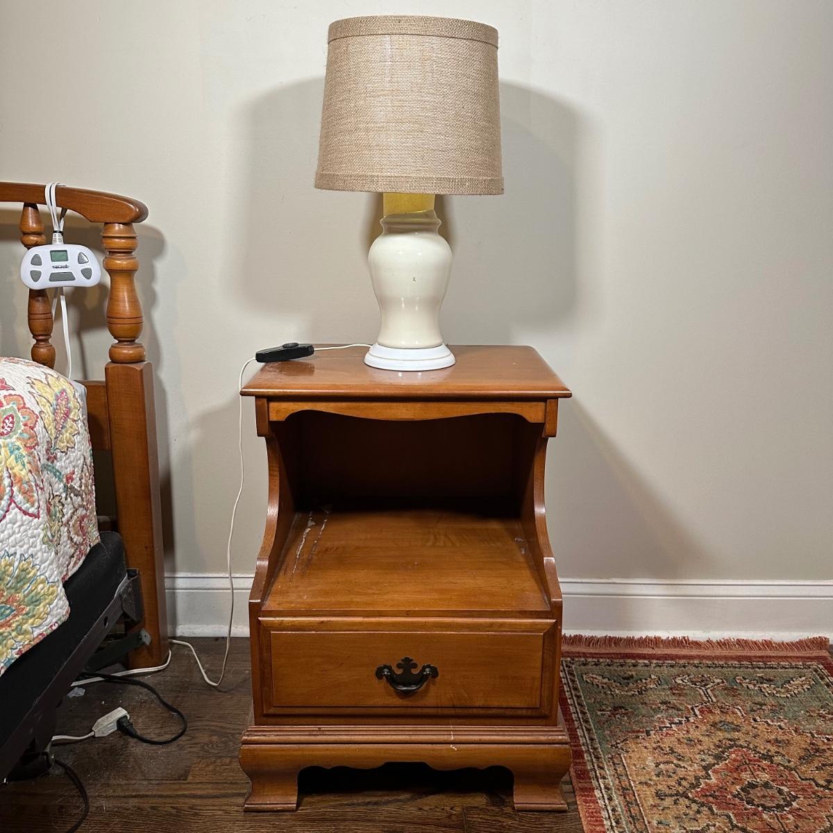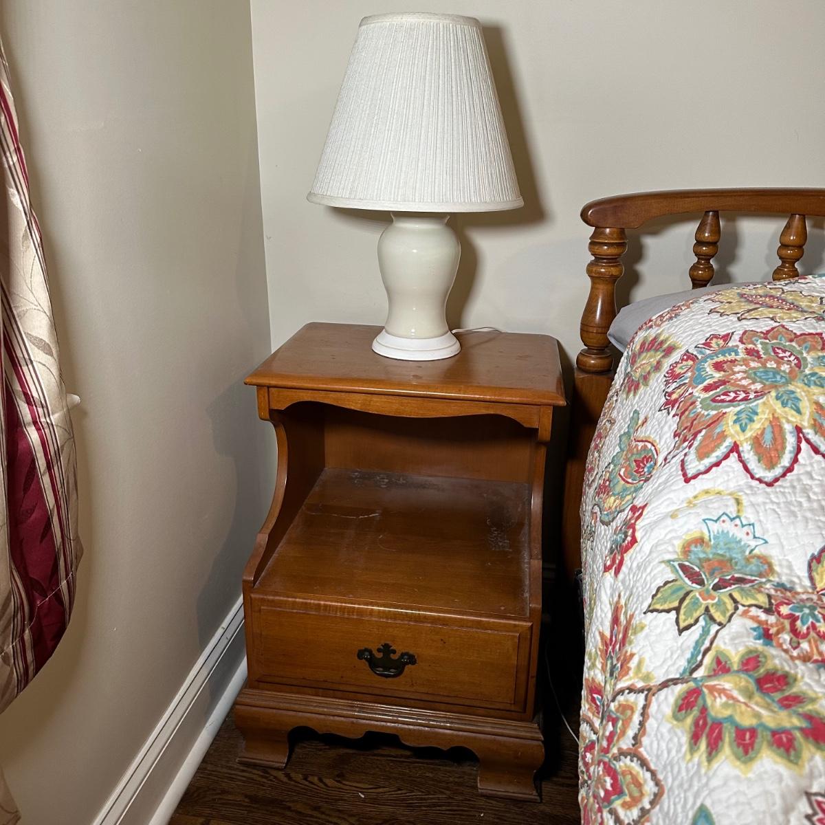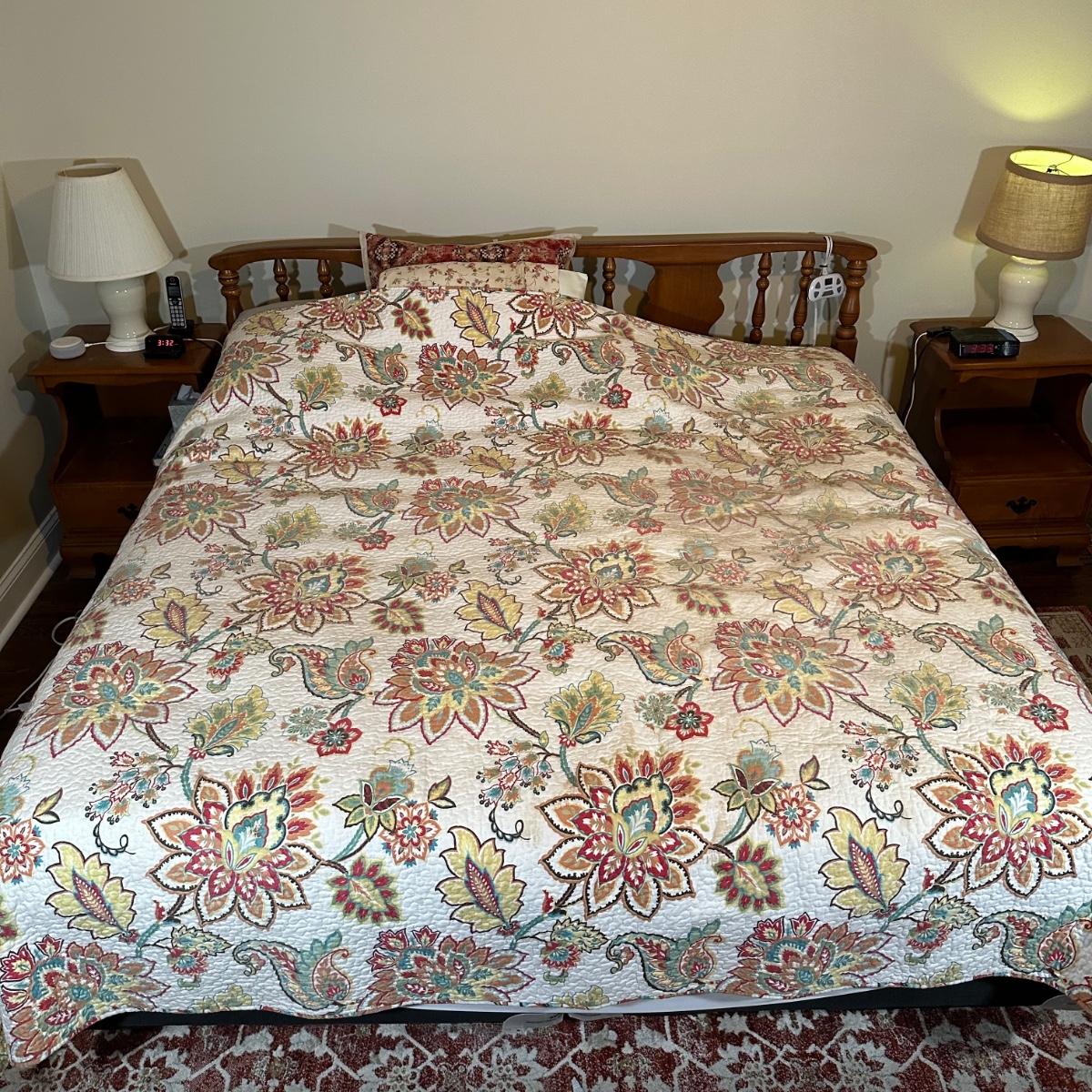 LOT 22Y: King Size Wooden Bed Frame/Headboard w/ Therapedic Electric Headed Blanket & Vintage Sumter Cabinet Co Side Tables & Lamps