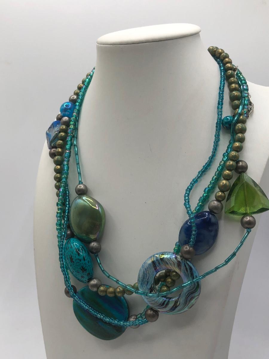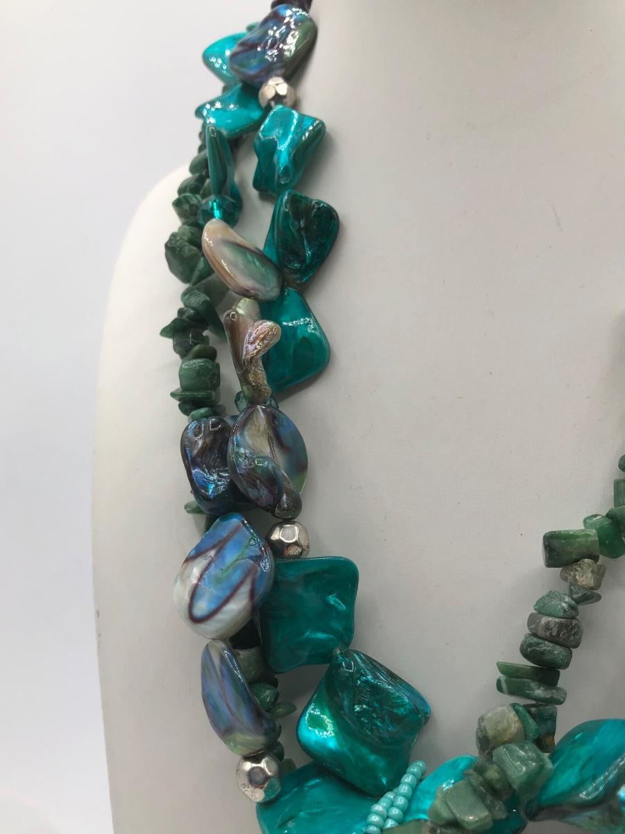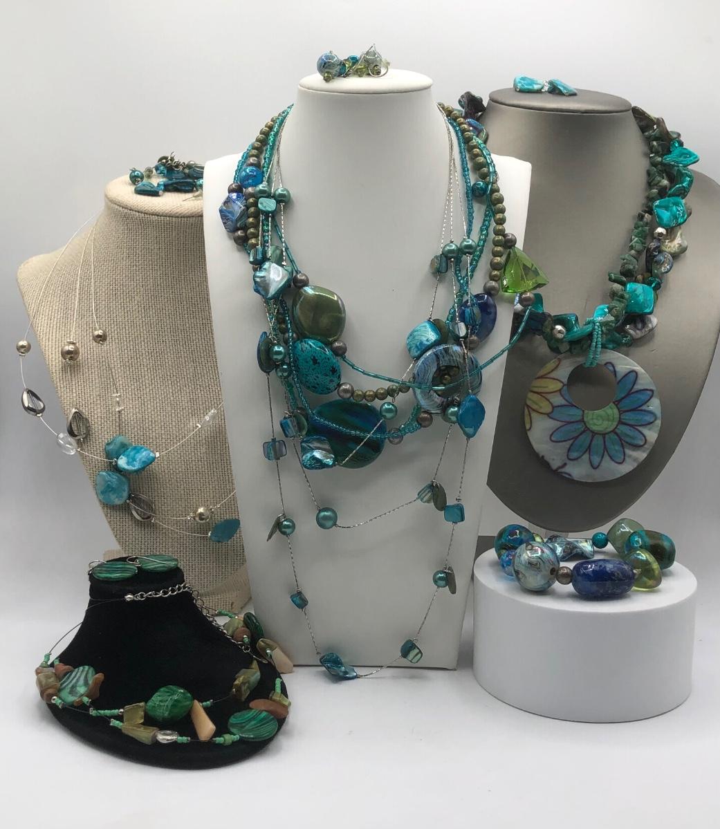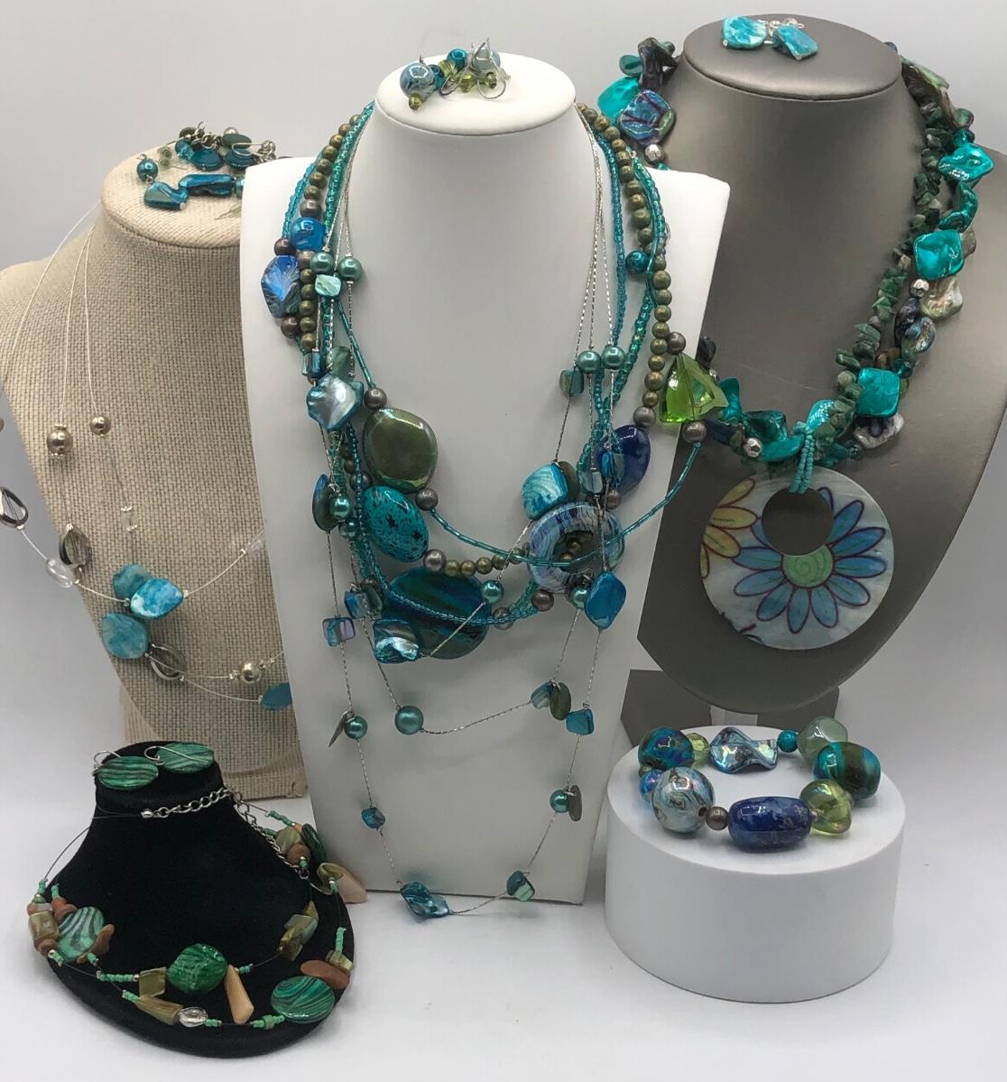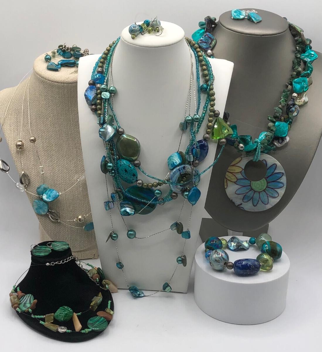 LOT 31J: Beautiful Blue and Green Bead Necklaces w/ Matching Earrings & Stretch Bracelet