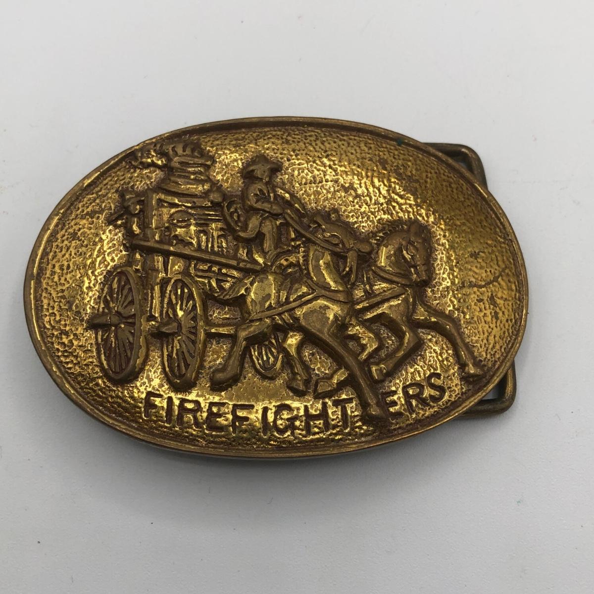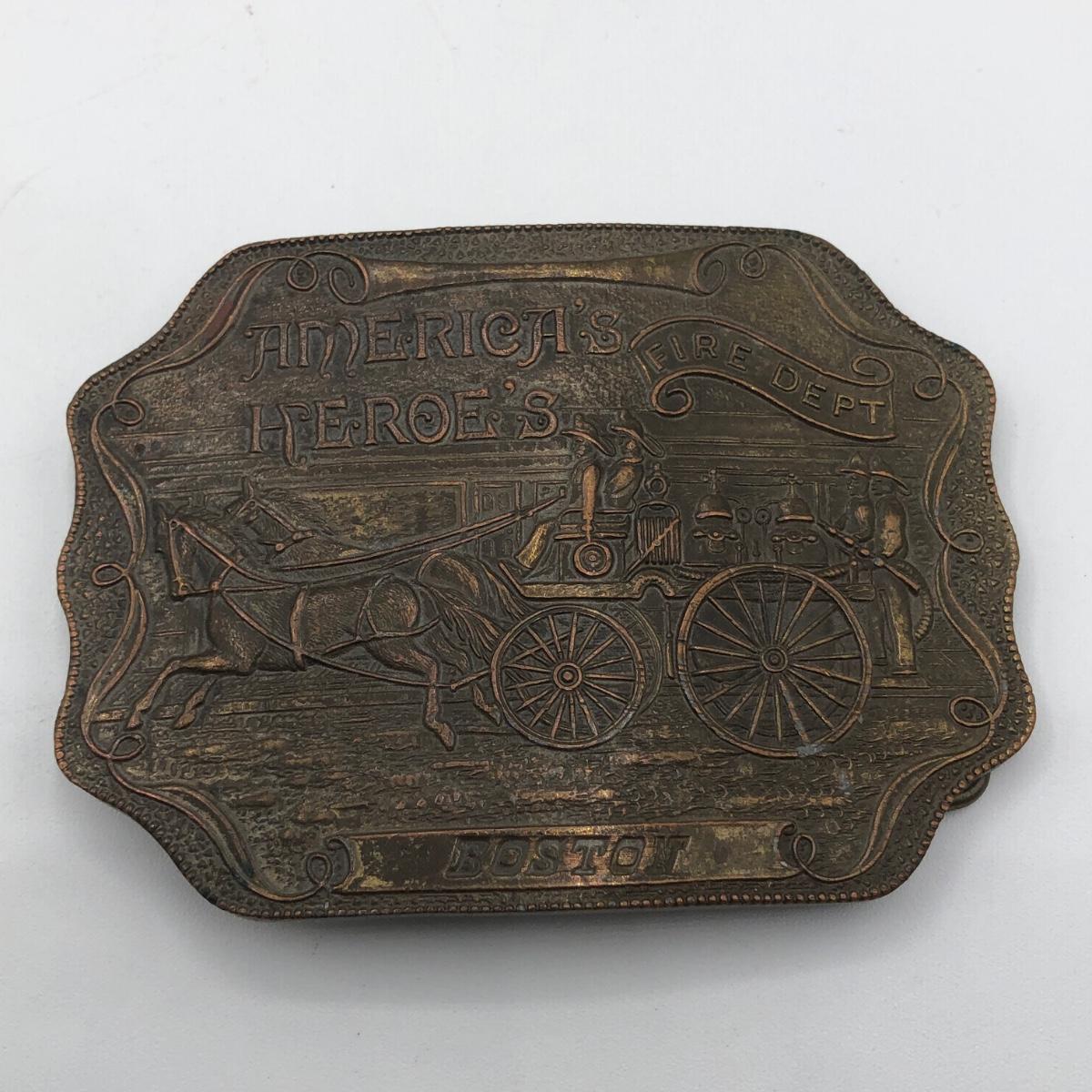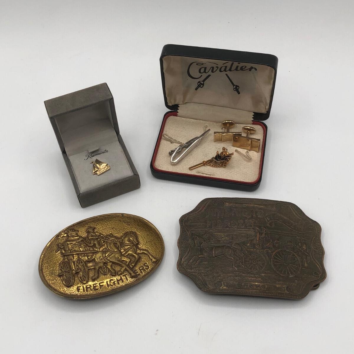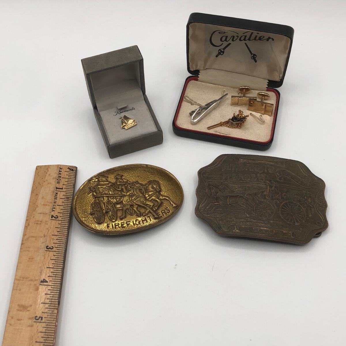 LOT 39J: For the Guys - Vintage Brass Firefighter Belt Buckles, Krementz Sailboat Tie Tack in Box, Shields Tie Clip, Swank Tie Clip & Cufflinks
