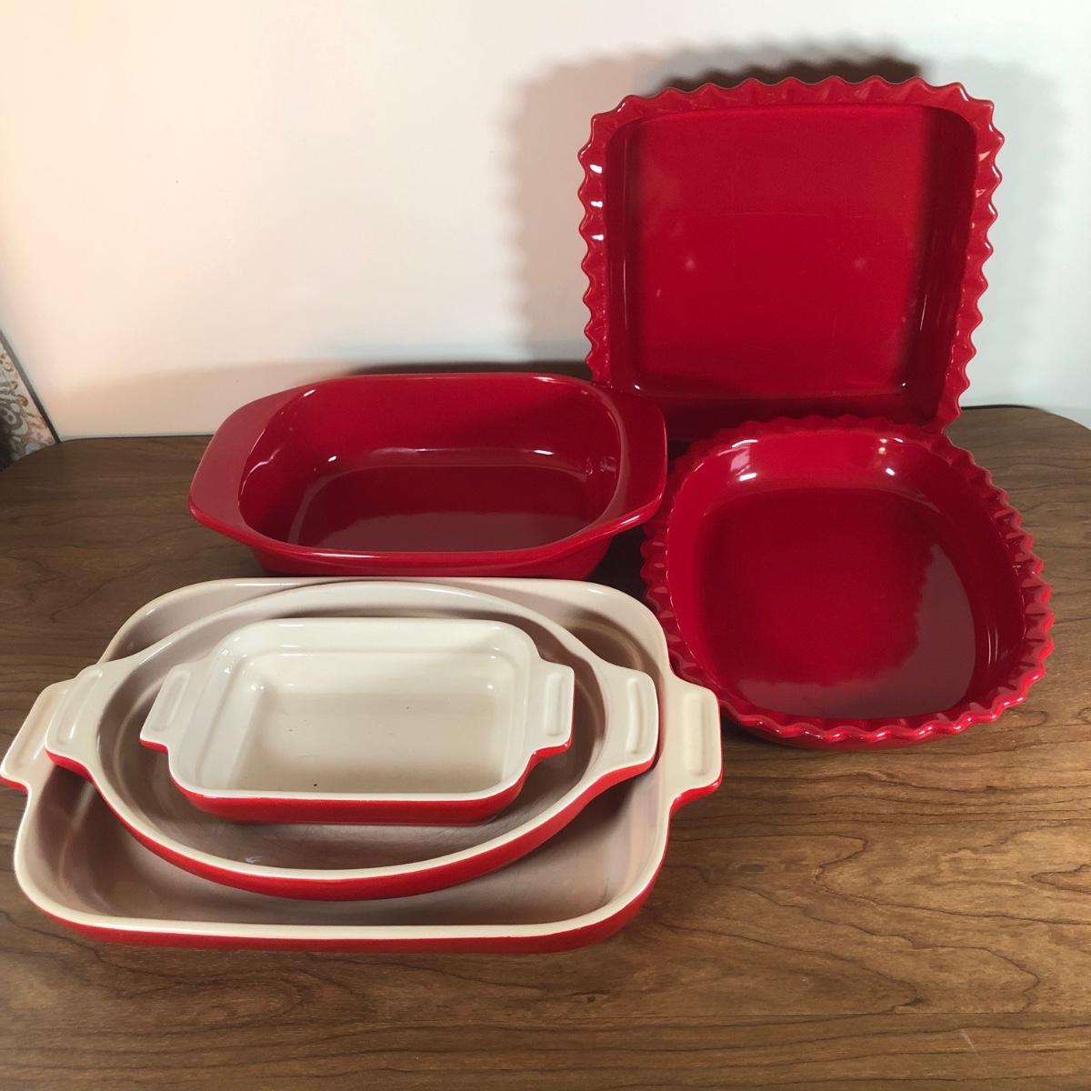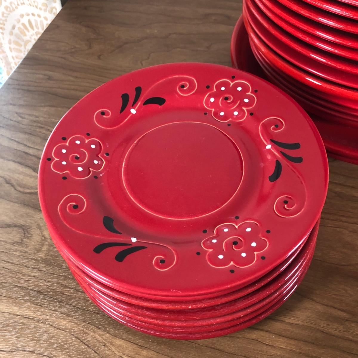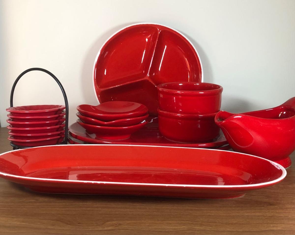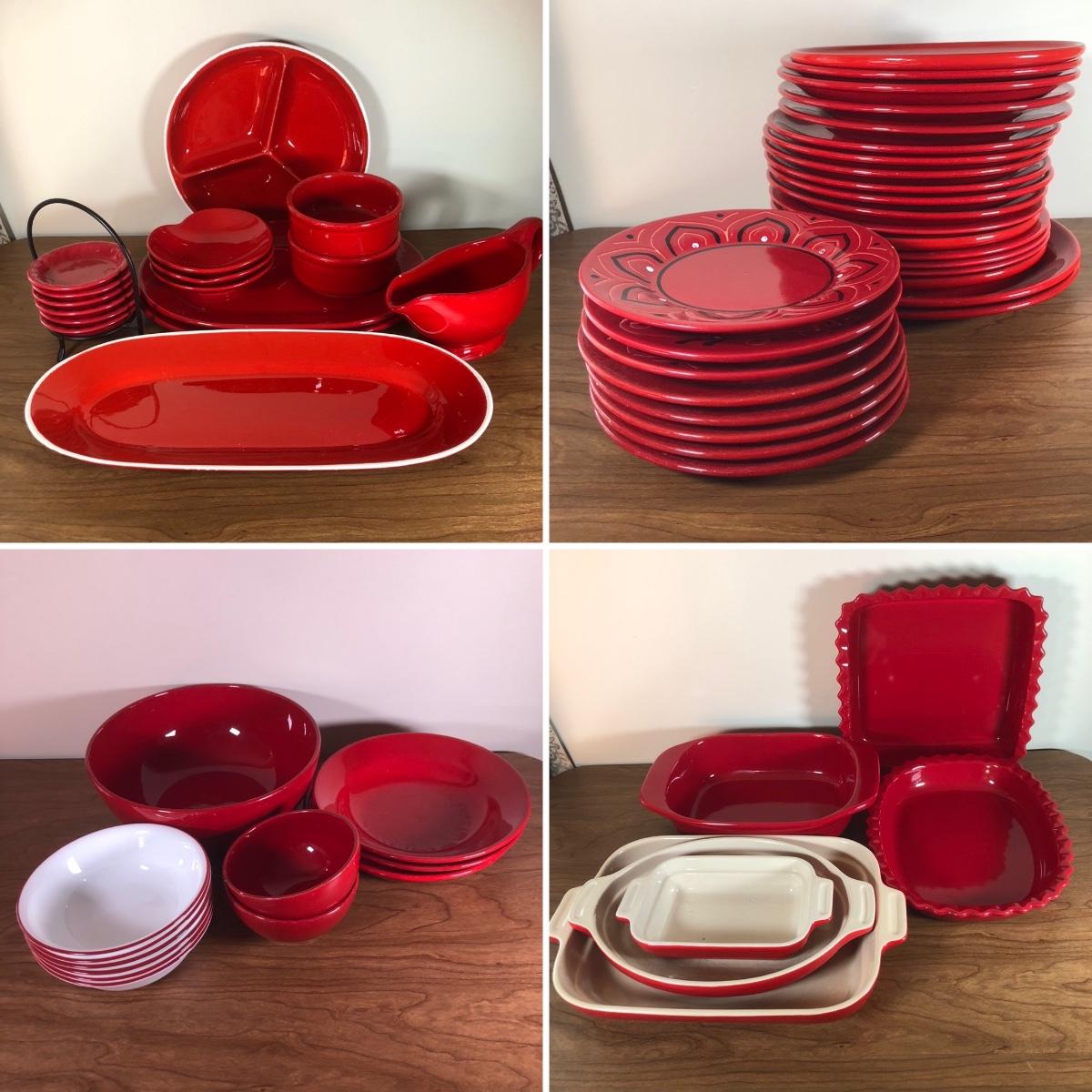 LOT 72L: HUGE Collection of Red Dishes, Baking Dishes & Serving Pieces - Deruta Italy Hand Painted, Pagnossin Ironstone Italy, Chantal, Olive & Thyme, Table Tops Gallery French Baroque & More