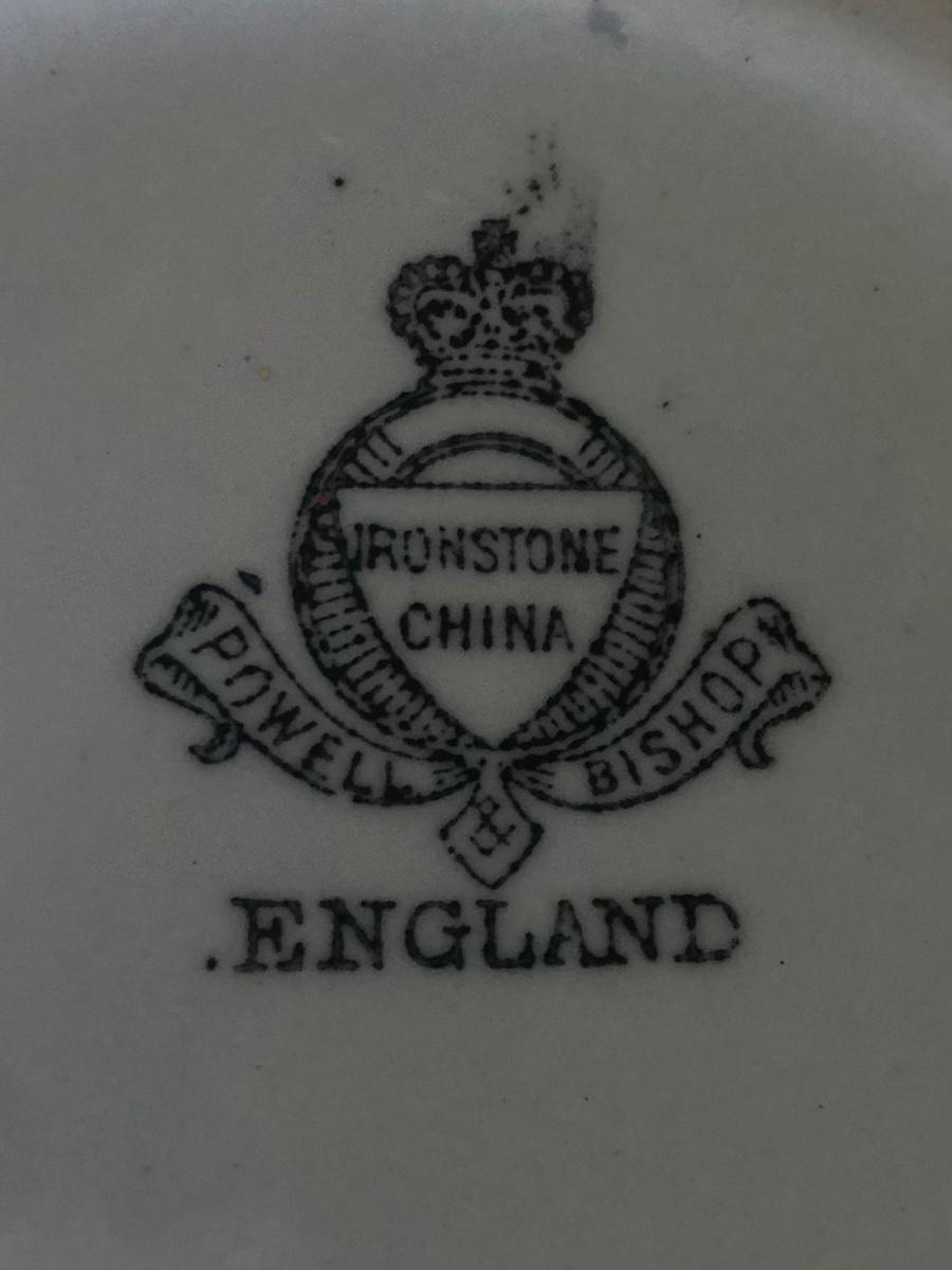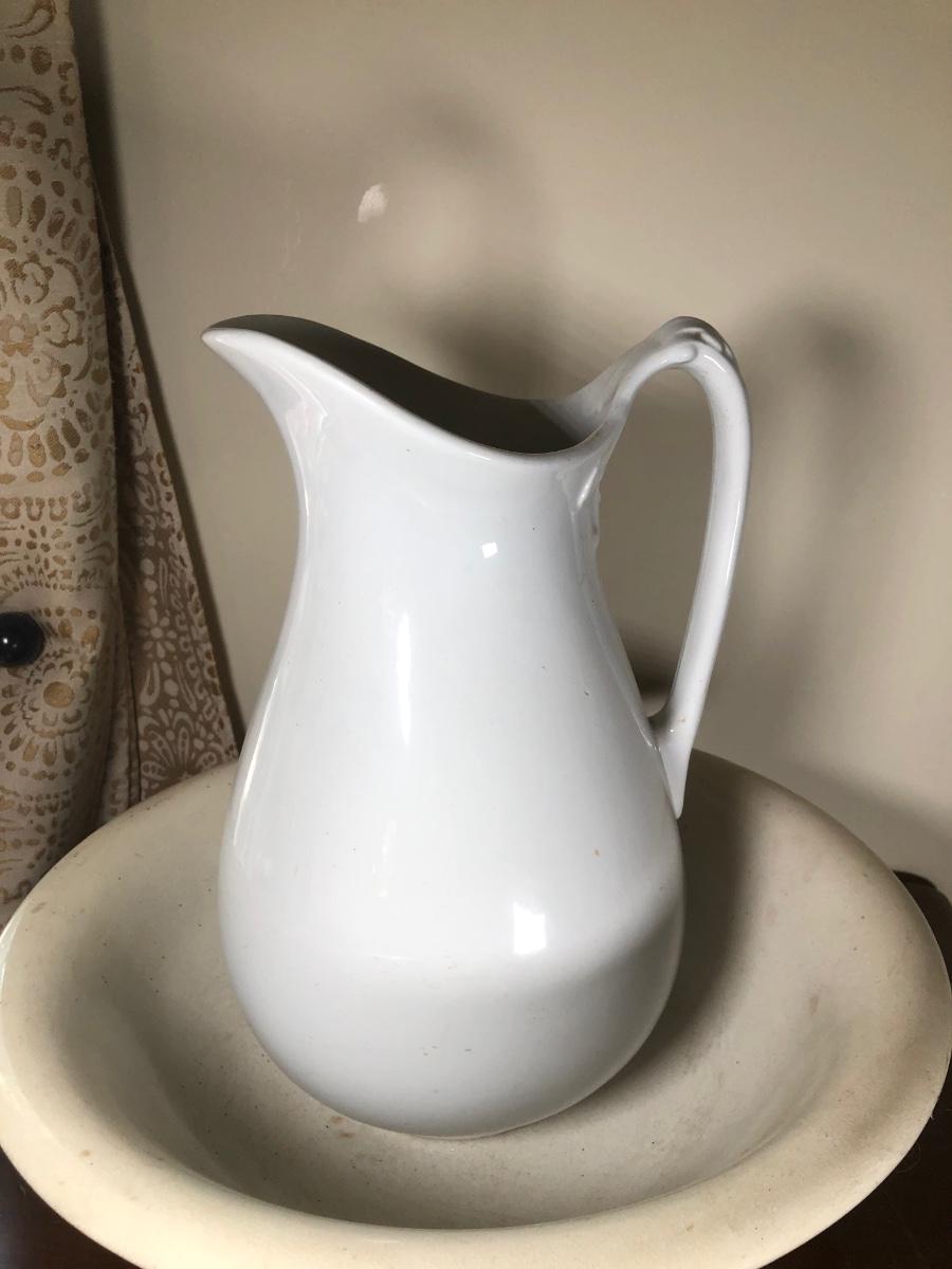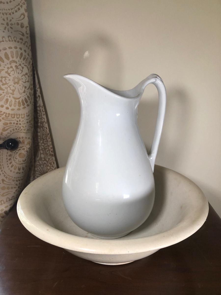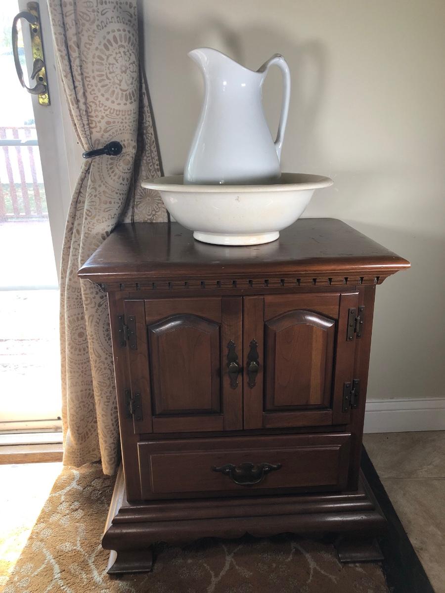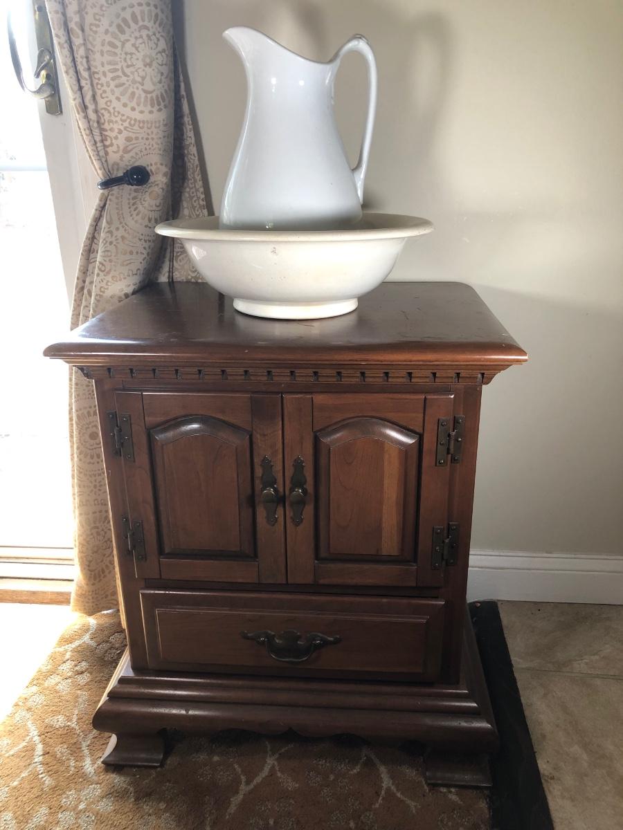 LOT 76D: Vintage Dark Wood Wash Stand w/ D&D Basin & Powell & Bishop Ironstone Pitcher / Ewer