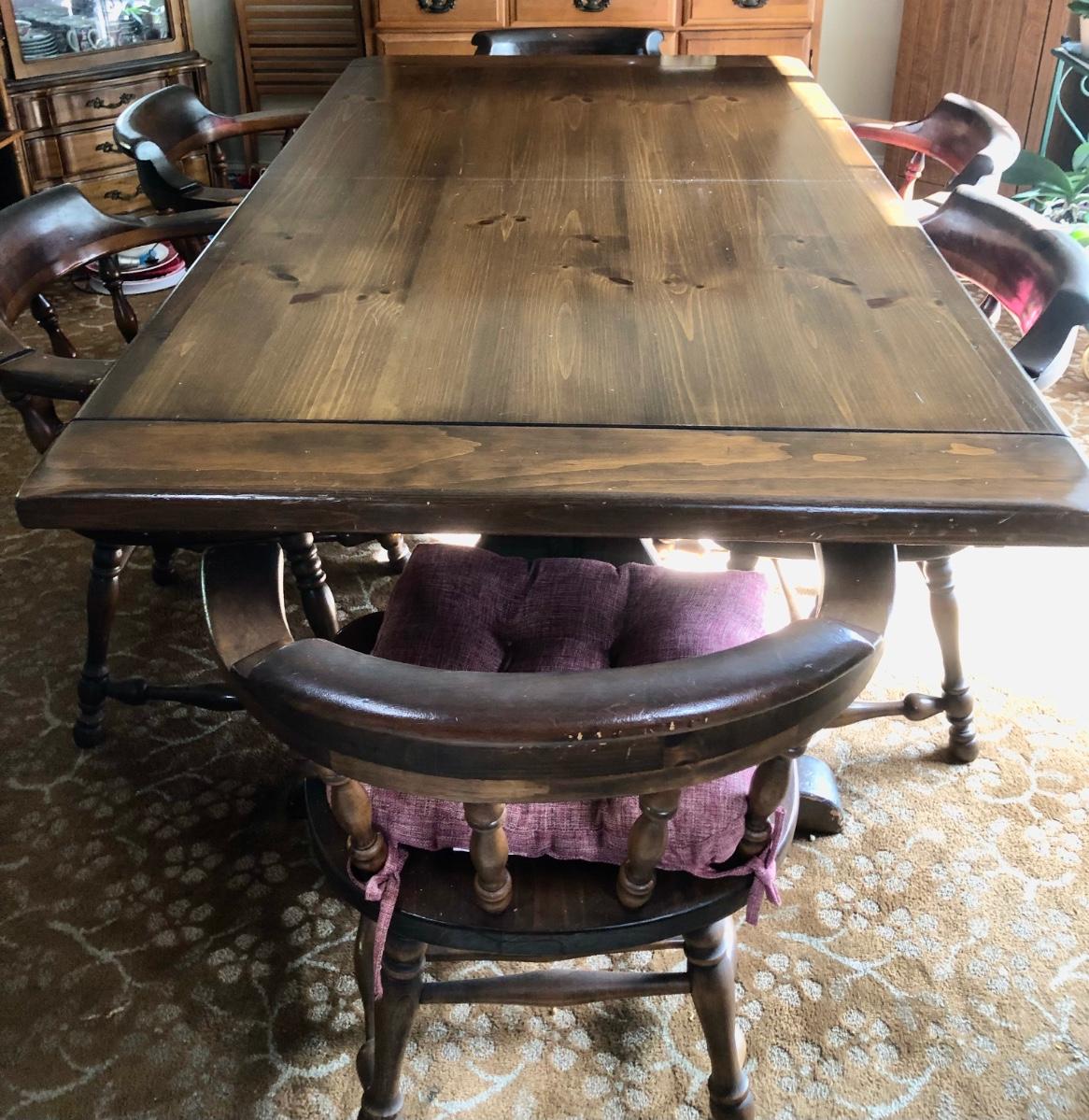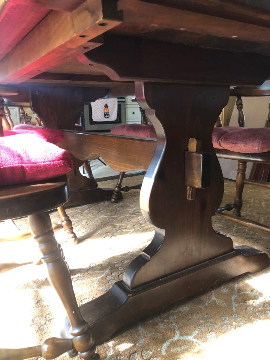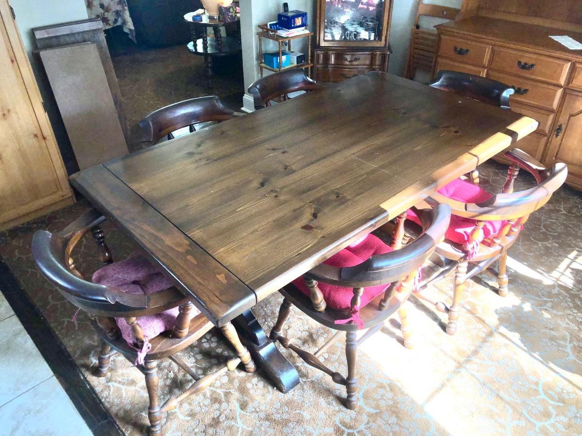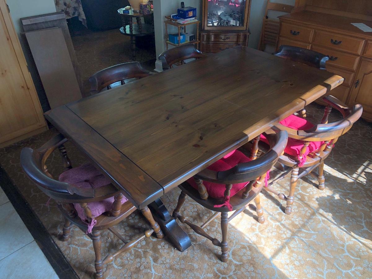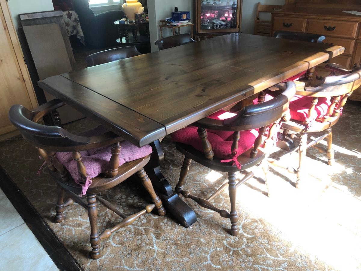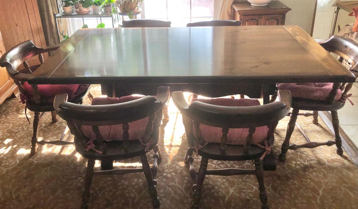 LOT 79D: Vintage 1967 Colonial Style Dining Table w/ 2 15" Leaves, Protective Pads & 6 Matching Chairs