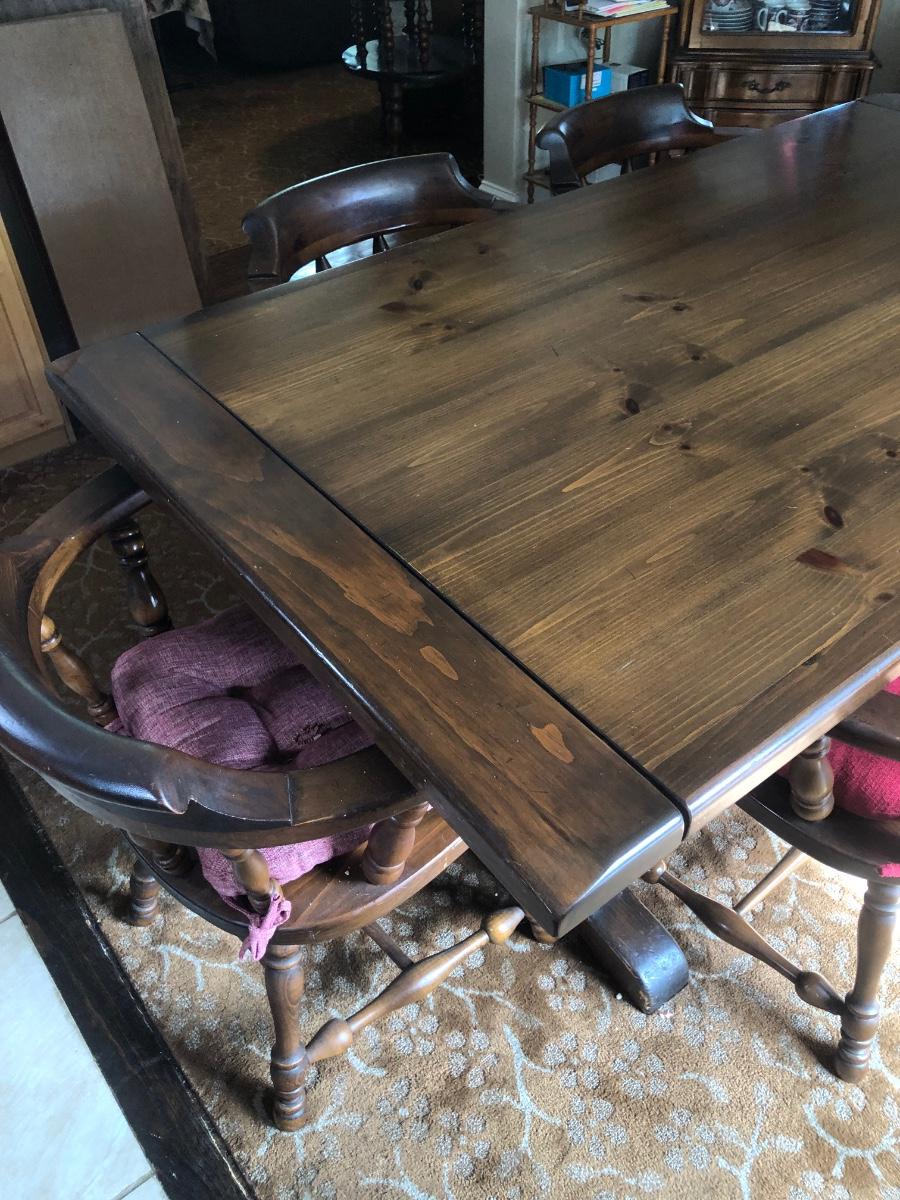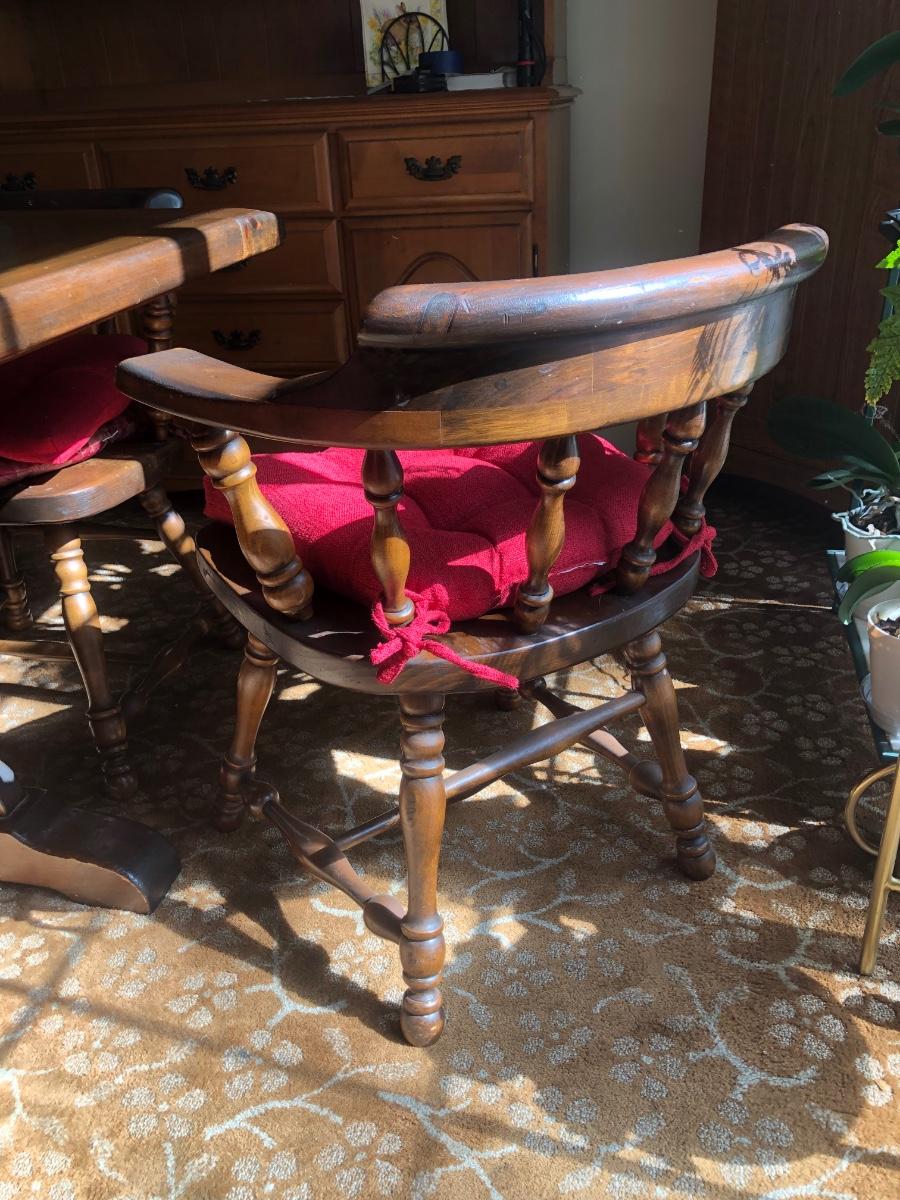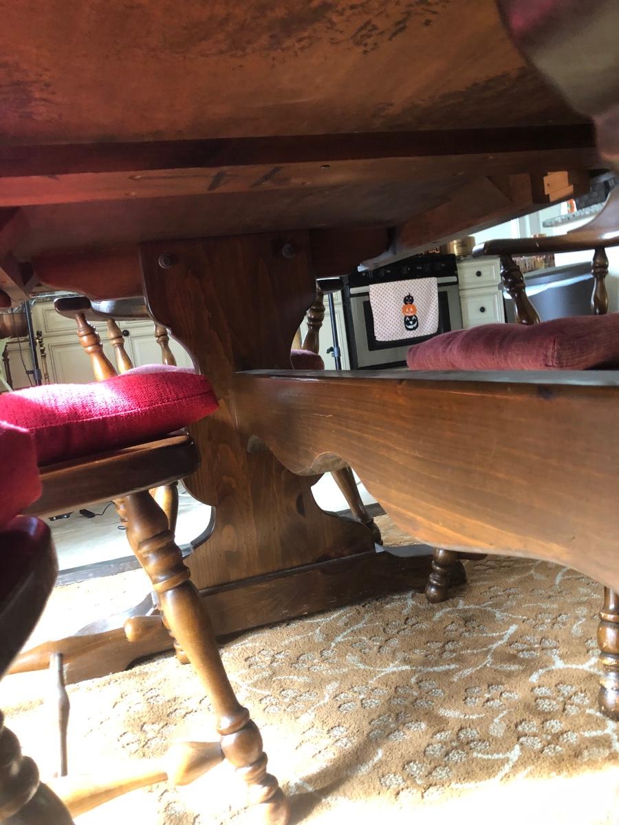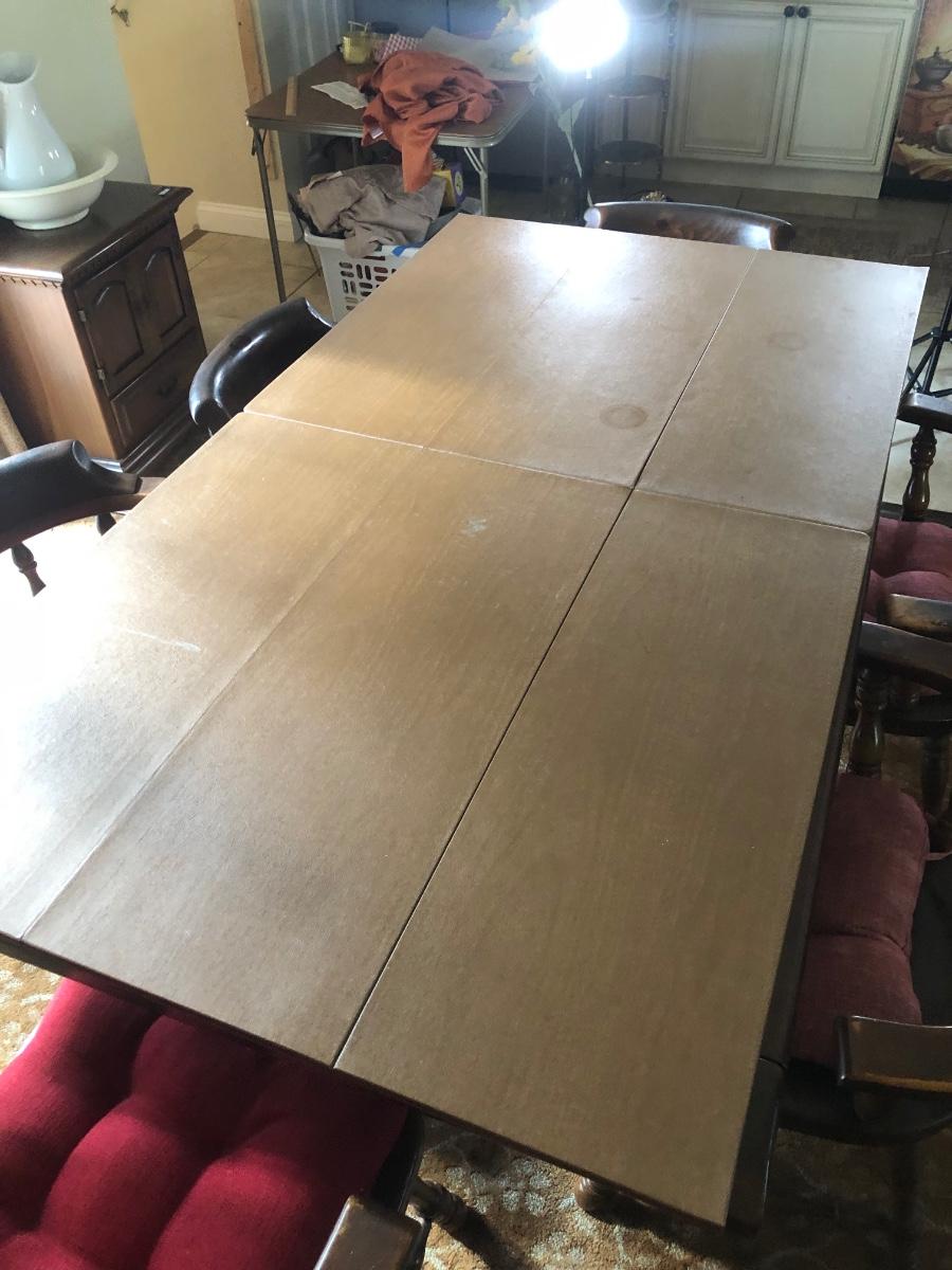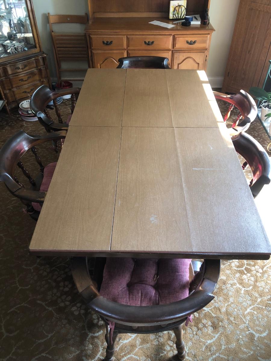 LOT 79D: Vintage 1967 Colonial Style Dining Table w/ 2 15" Leaves, Protective Pads & 6 Matching Chairs