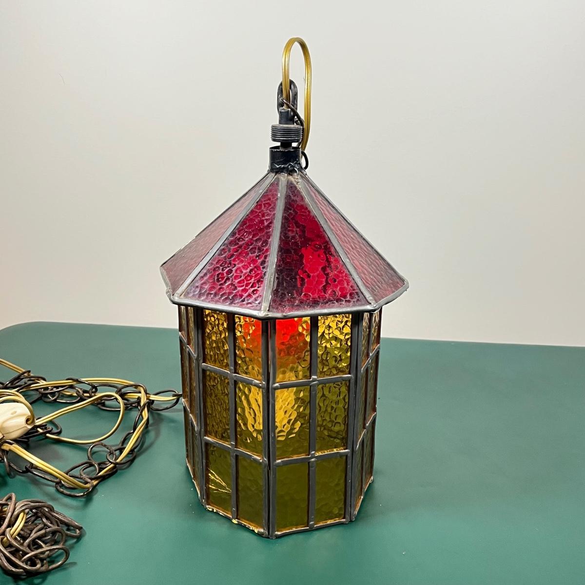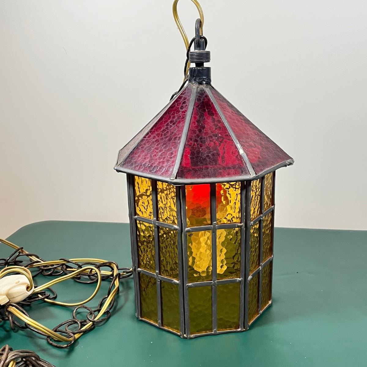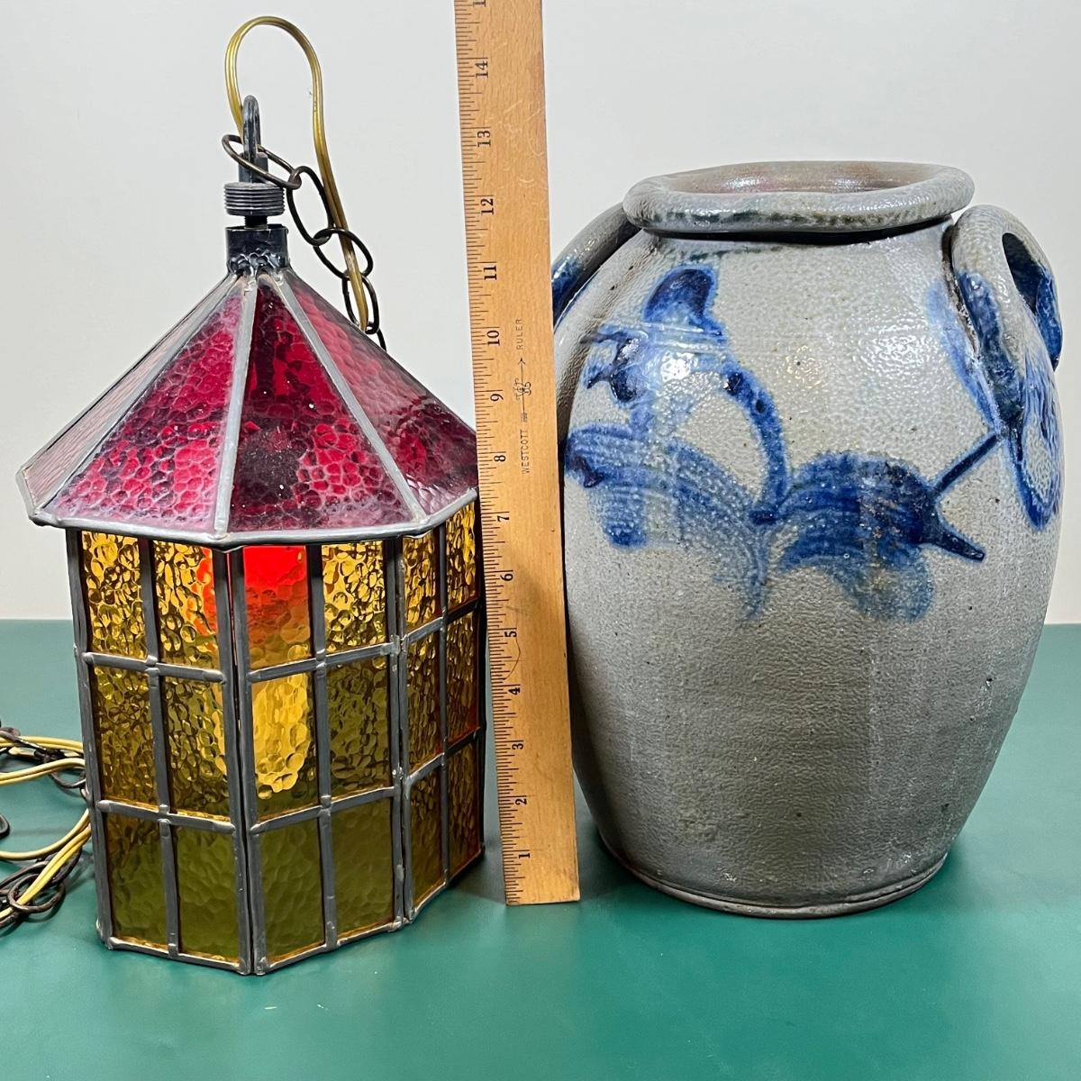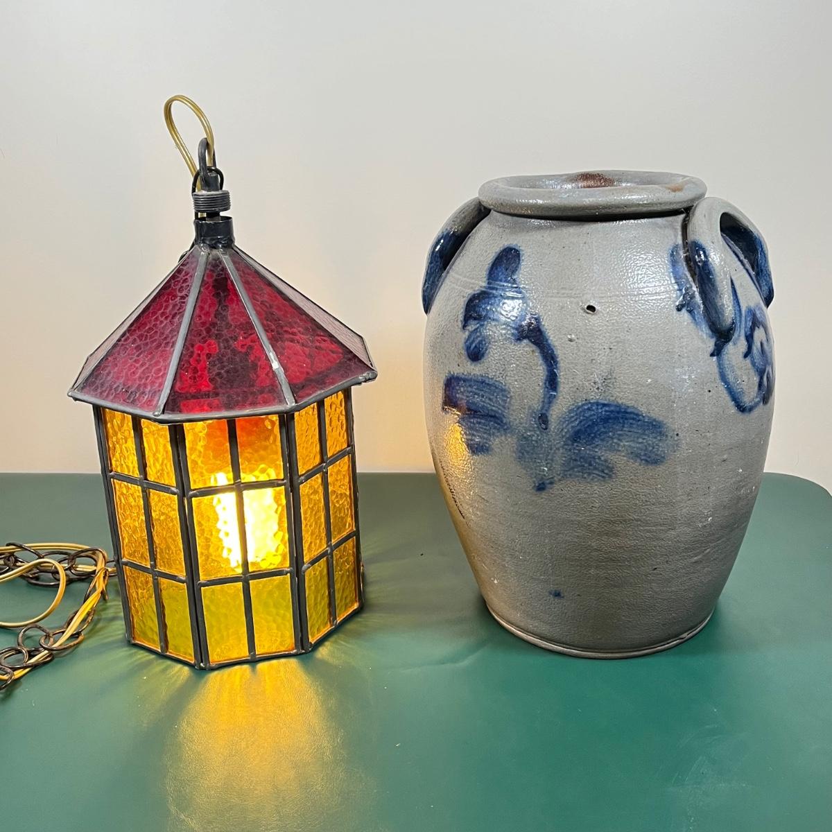LOT 107B: Hanging Glass Lamp and Vintage Stoneware Crock