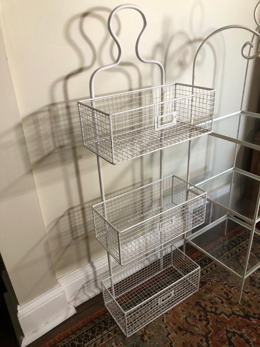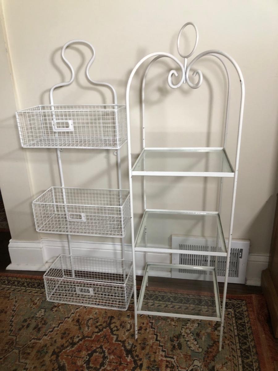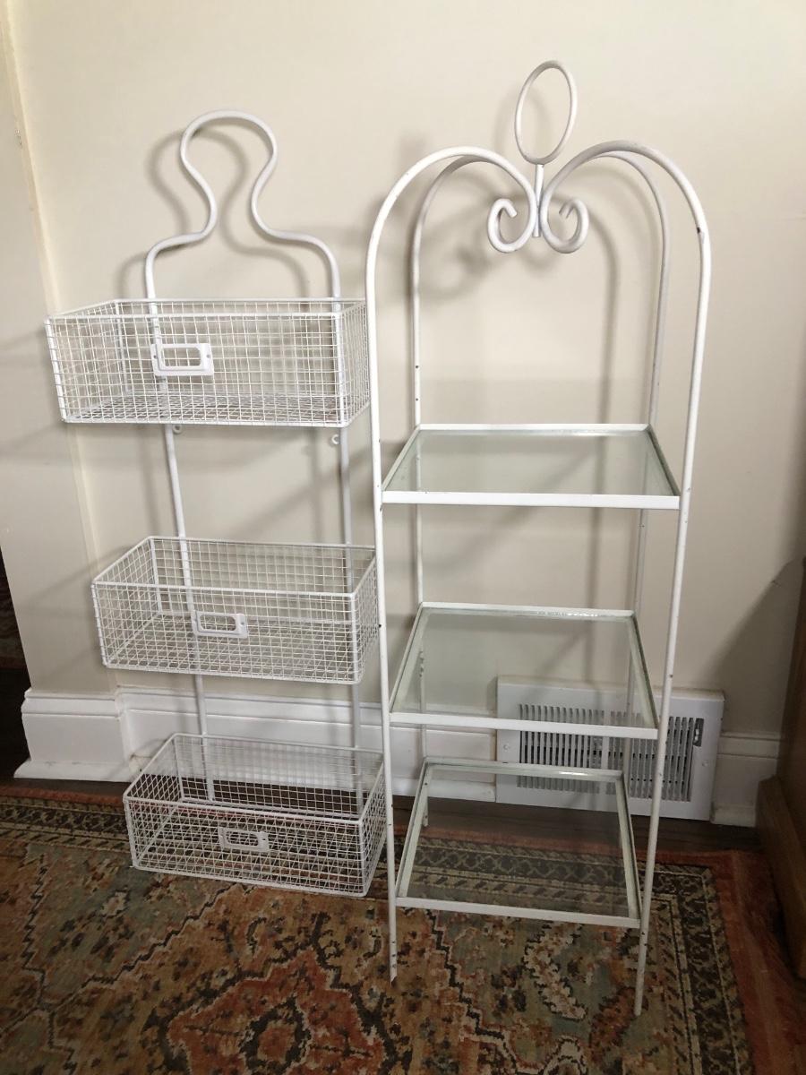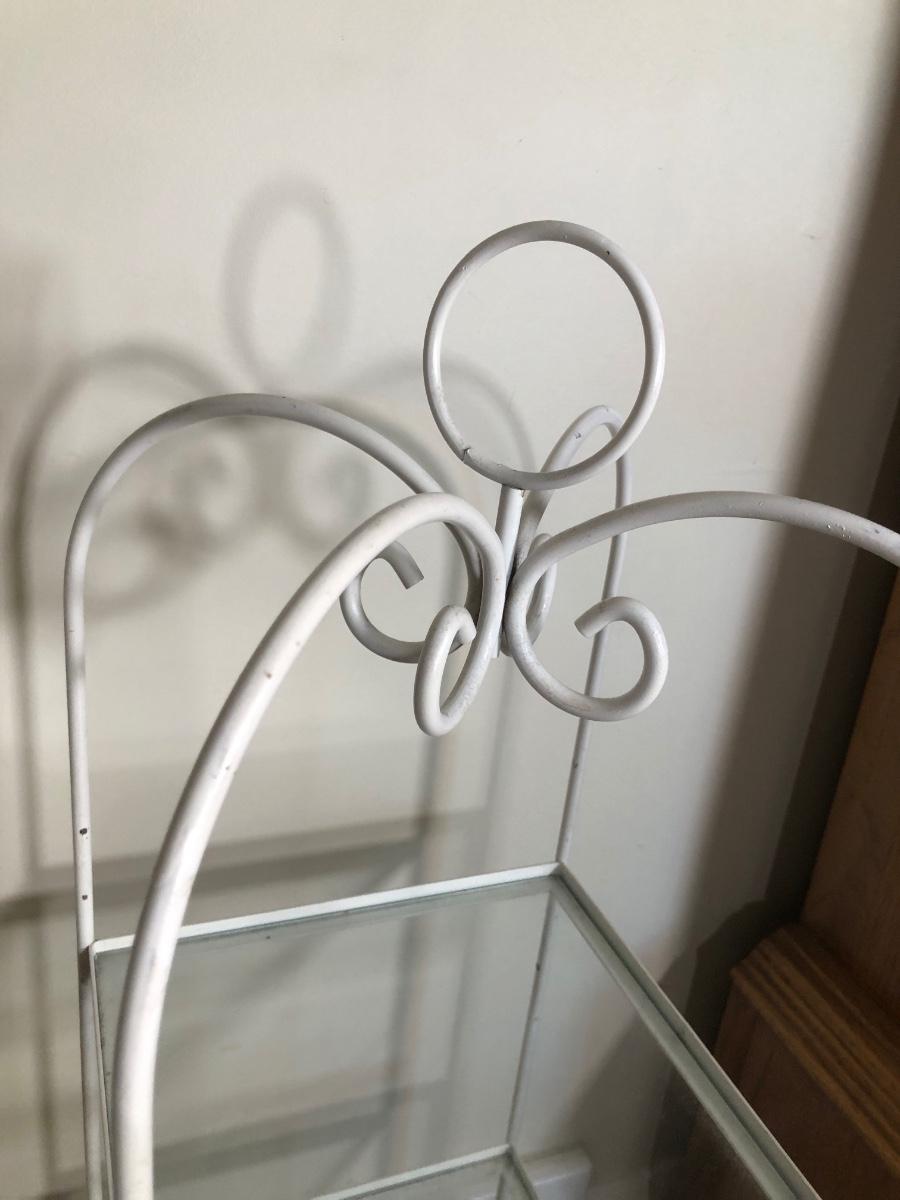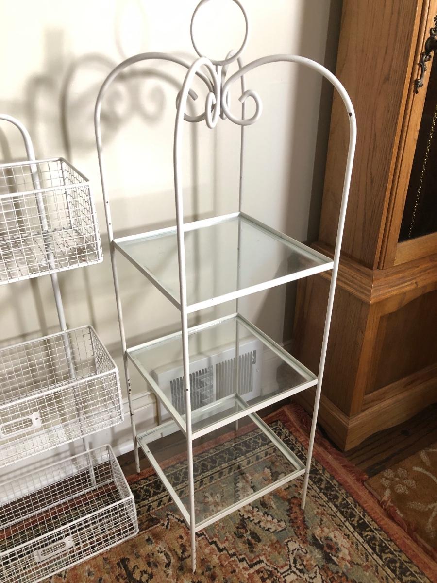 LOT 179L: White Metal Plant Stand w/ Glass Shelves & White Metal Office Storage Shelf