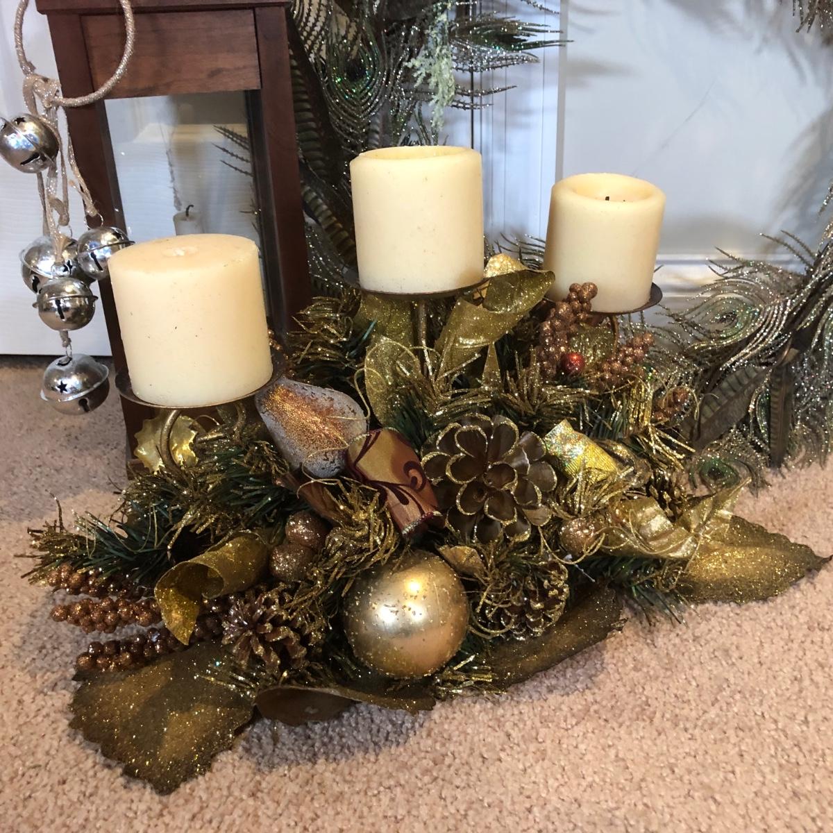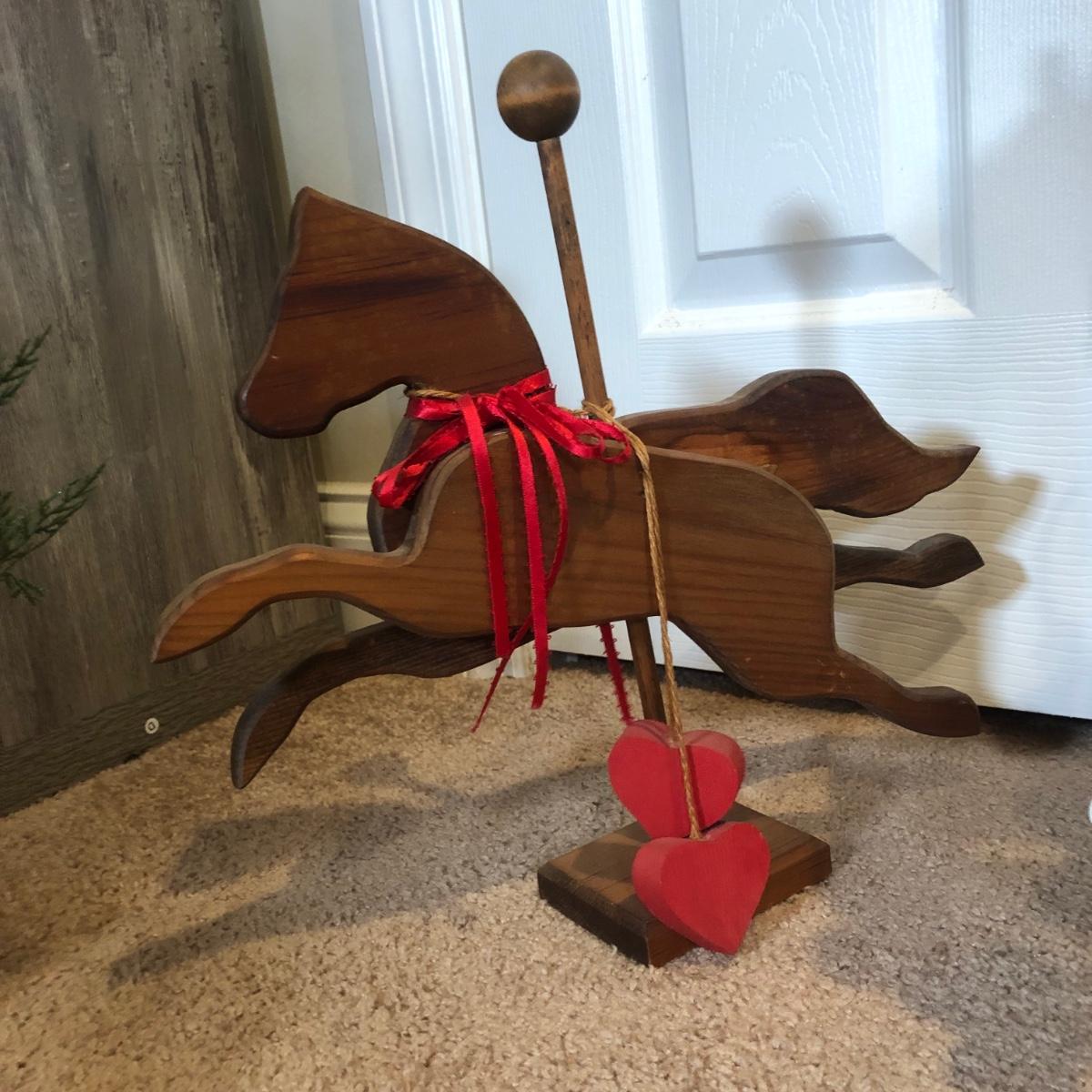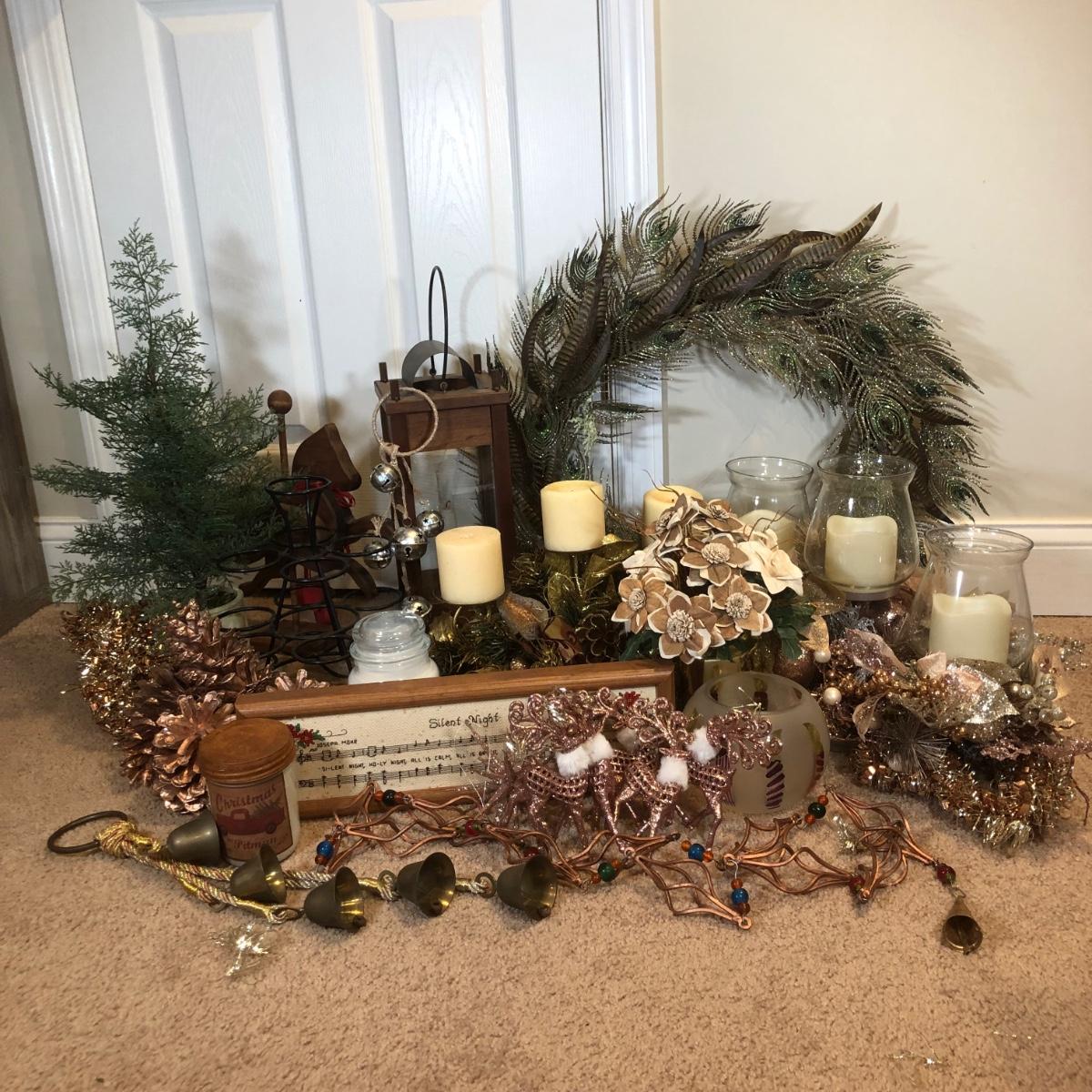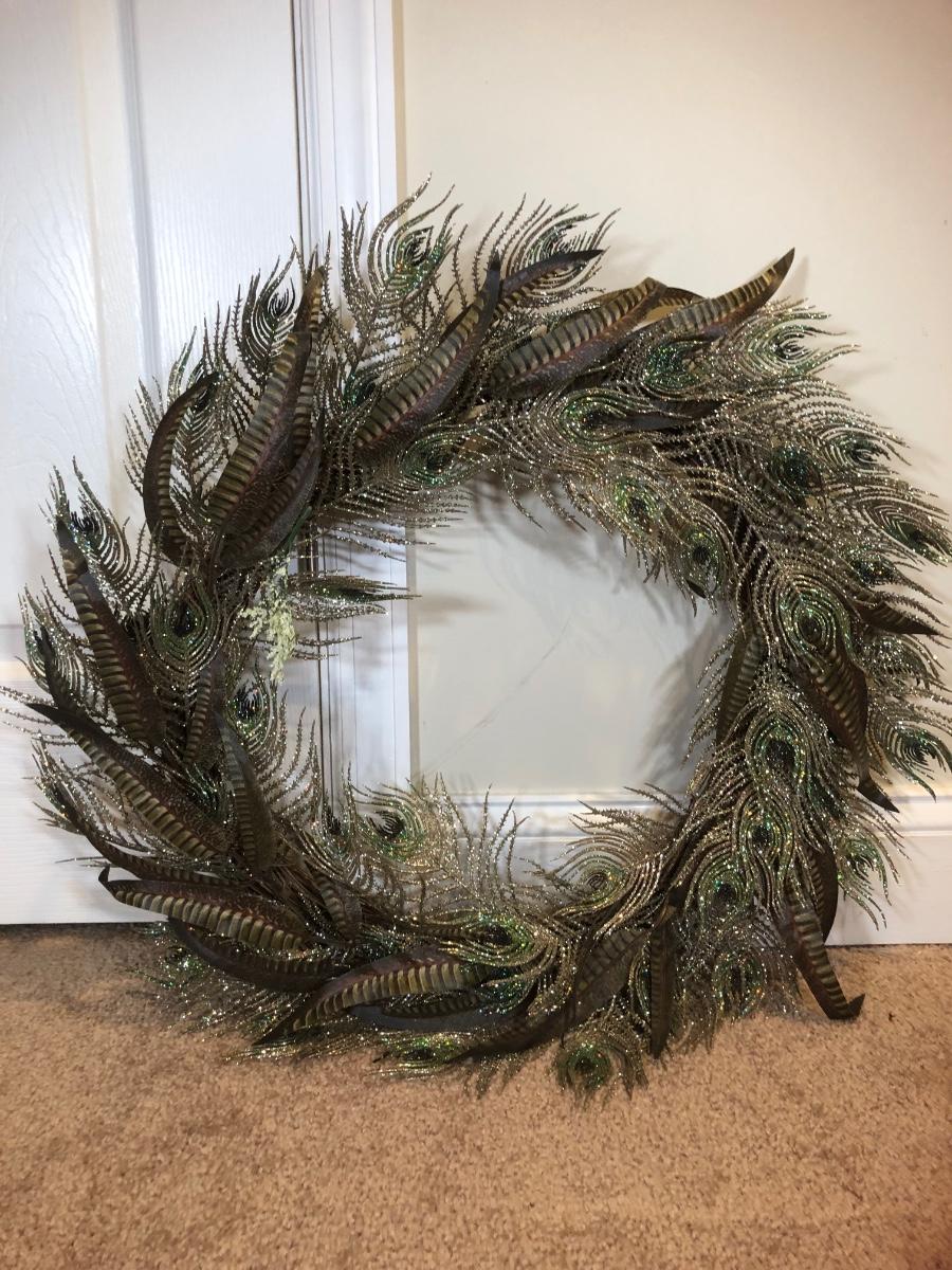 LOT 180B: Large Christmas Home Decor Collection - Vintage Wooden Carousel Horse, Peacock Feather Wreath, Centerpieces, Metal Garland & More