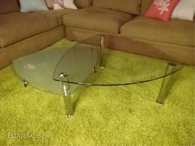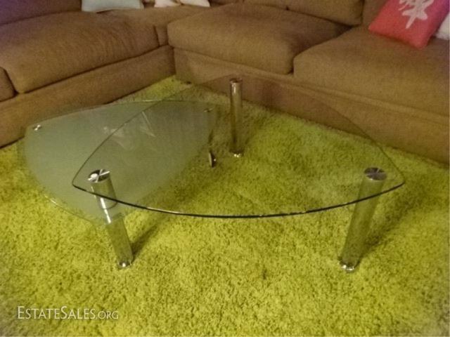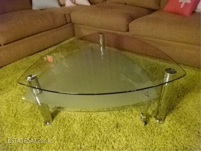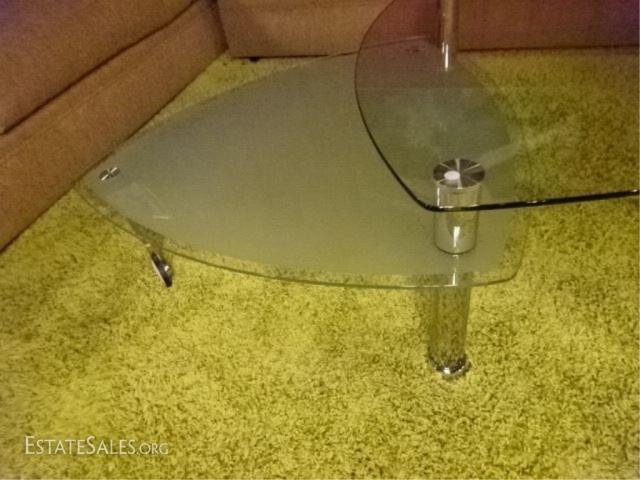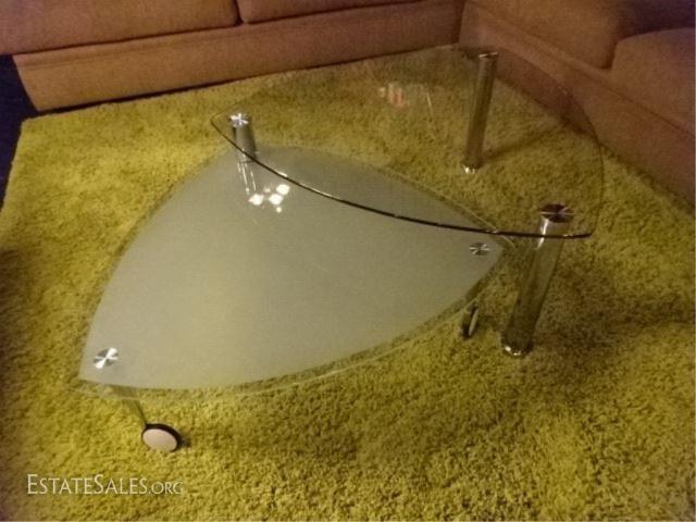 LOT 107A: MODERN CHROME AND GLASS COFFEE TABLE, 2 TIERS, FROSTED BOTTOM TIER IS WHEELED AND CAN REST UNDER TRIANGULAR TABLE OR PIVOT TO EXTEND TABLE (SEE PHOTOS), VERY GOOD CONDITION, APPROX 5'W WHEN FULLY EXTENDED, 3 FT WIDE WHEN CLOSED