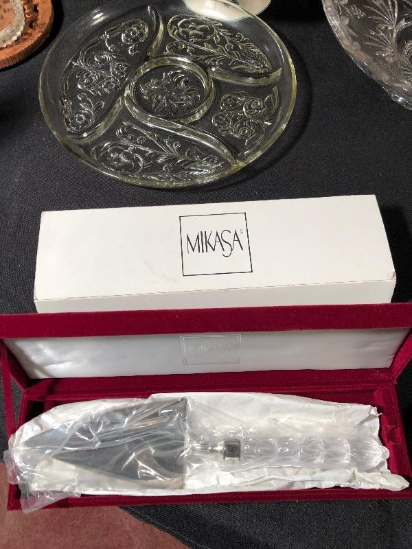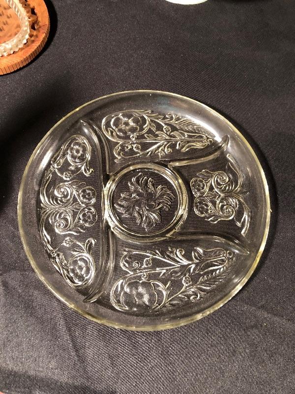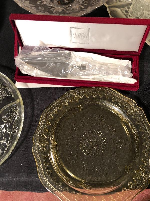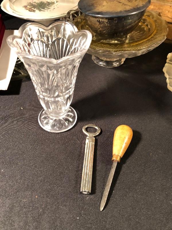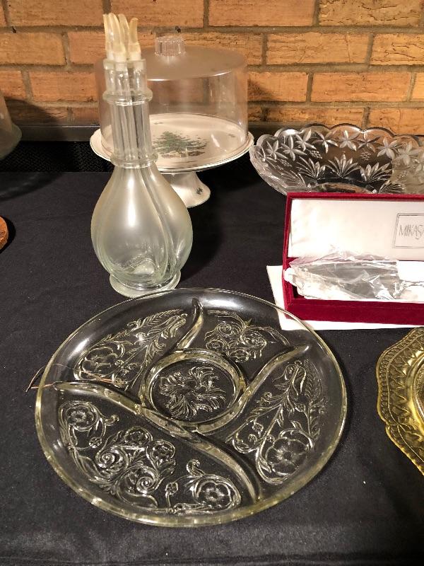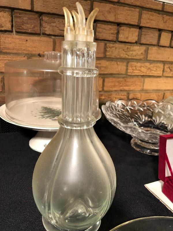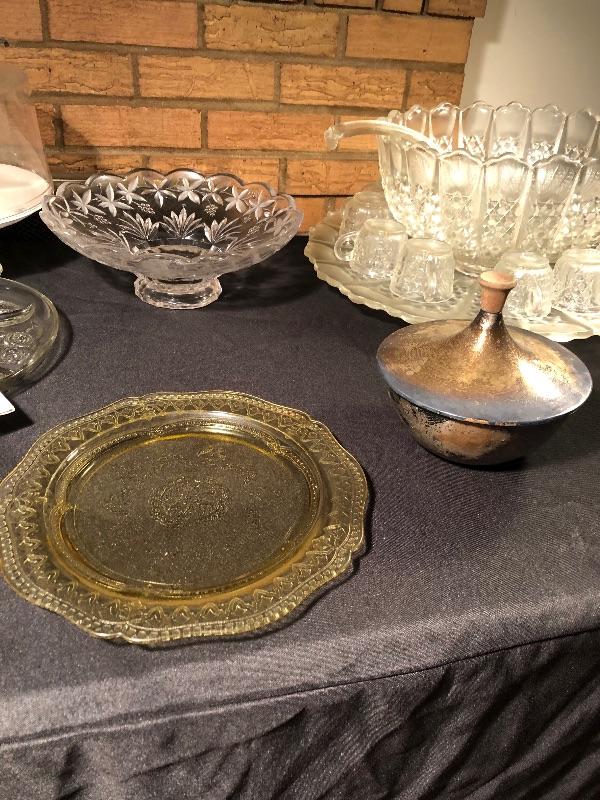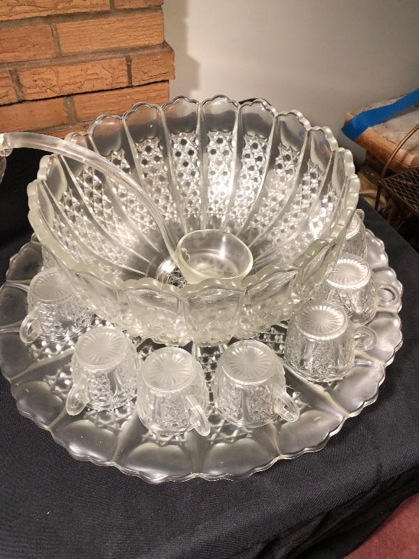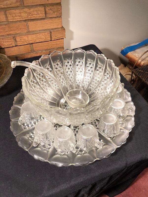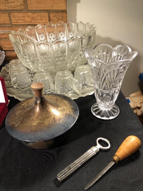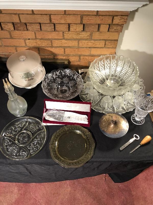 Lot 107-Vintage Glass Punch Bowl Service, Decanter, Cut/Etched Glass and Silver Serving Ware