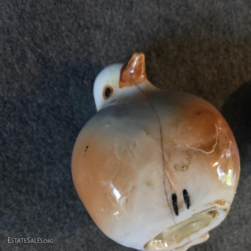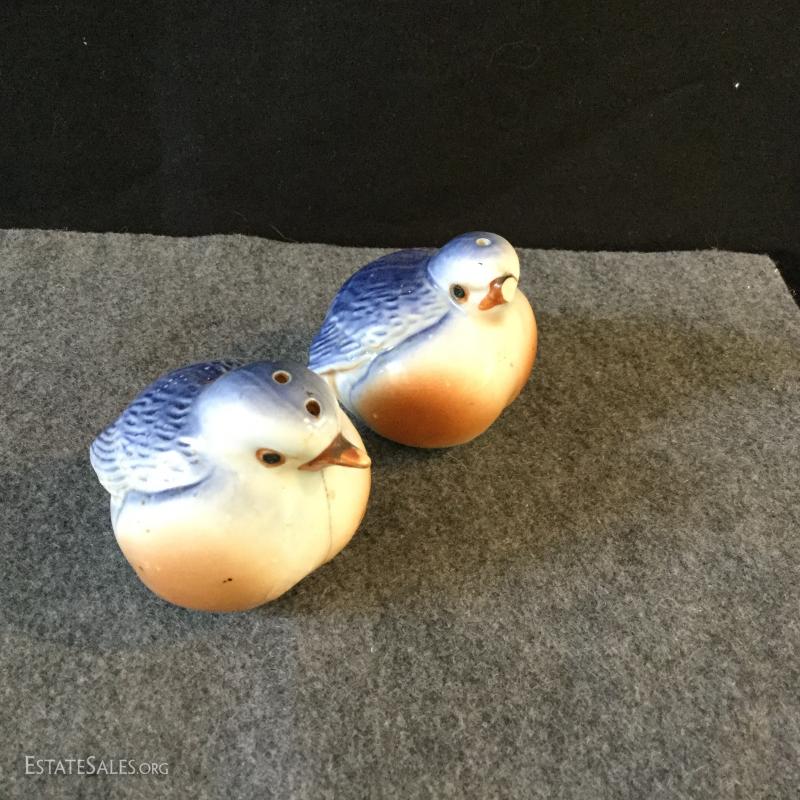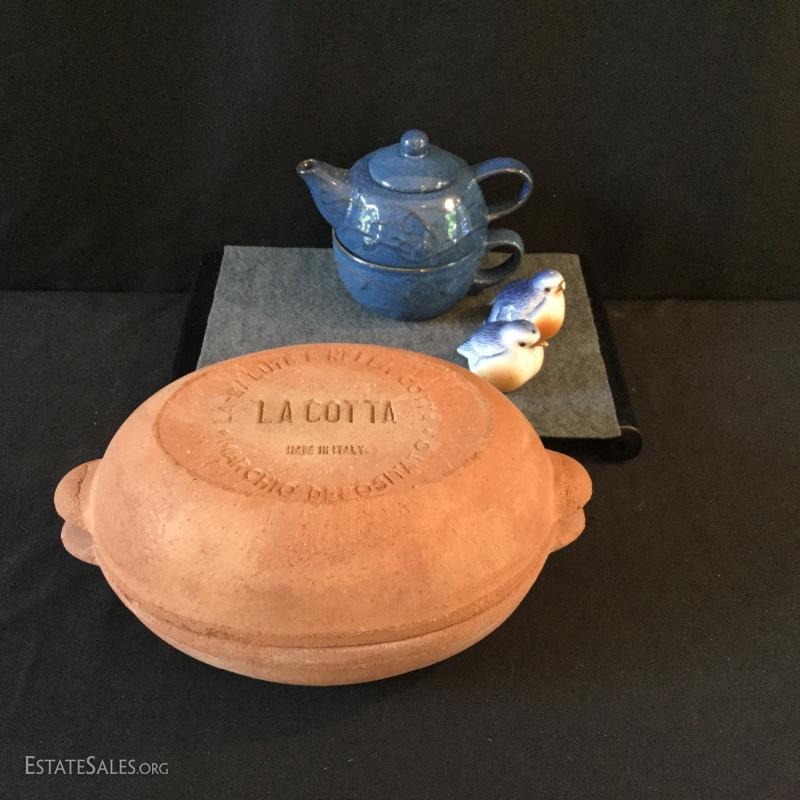 La Cotta covered dish (13"l x 8"w x 6"h) from Italy, Pier-One tea pot and bird salt and pepper shakers. One bird has been repaired and there's a small chip in terra cotta. Shipping available or local pick up in Flat Rock, NC.