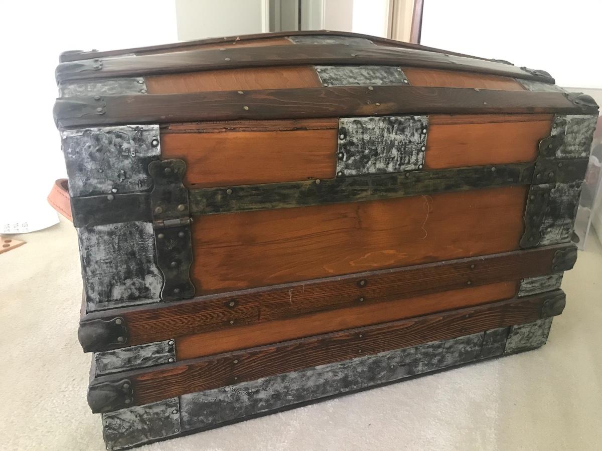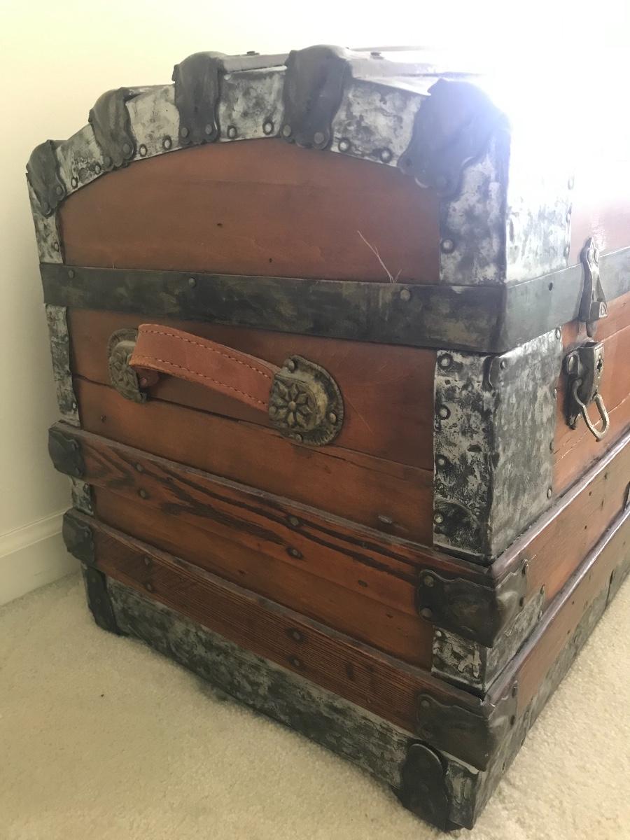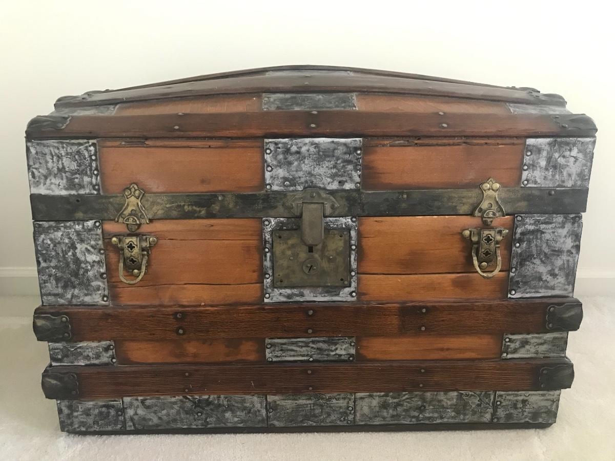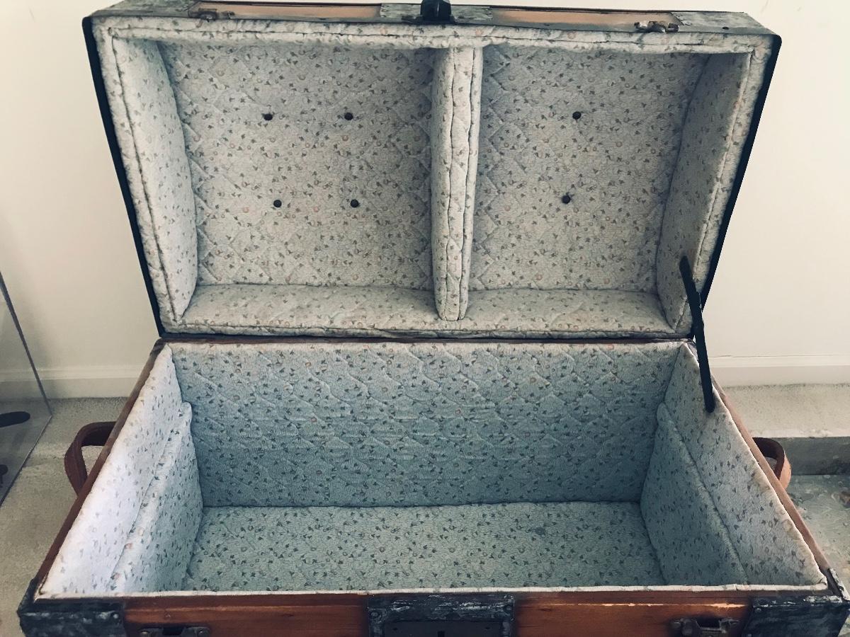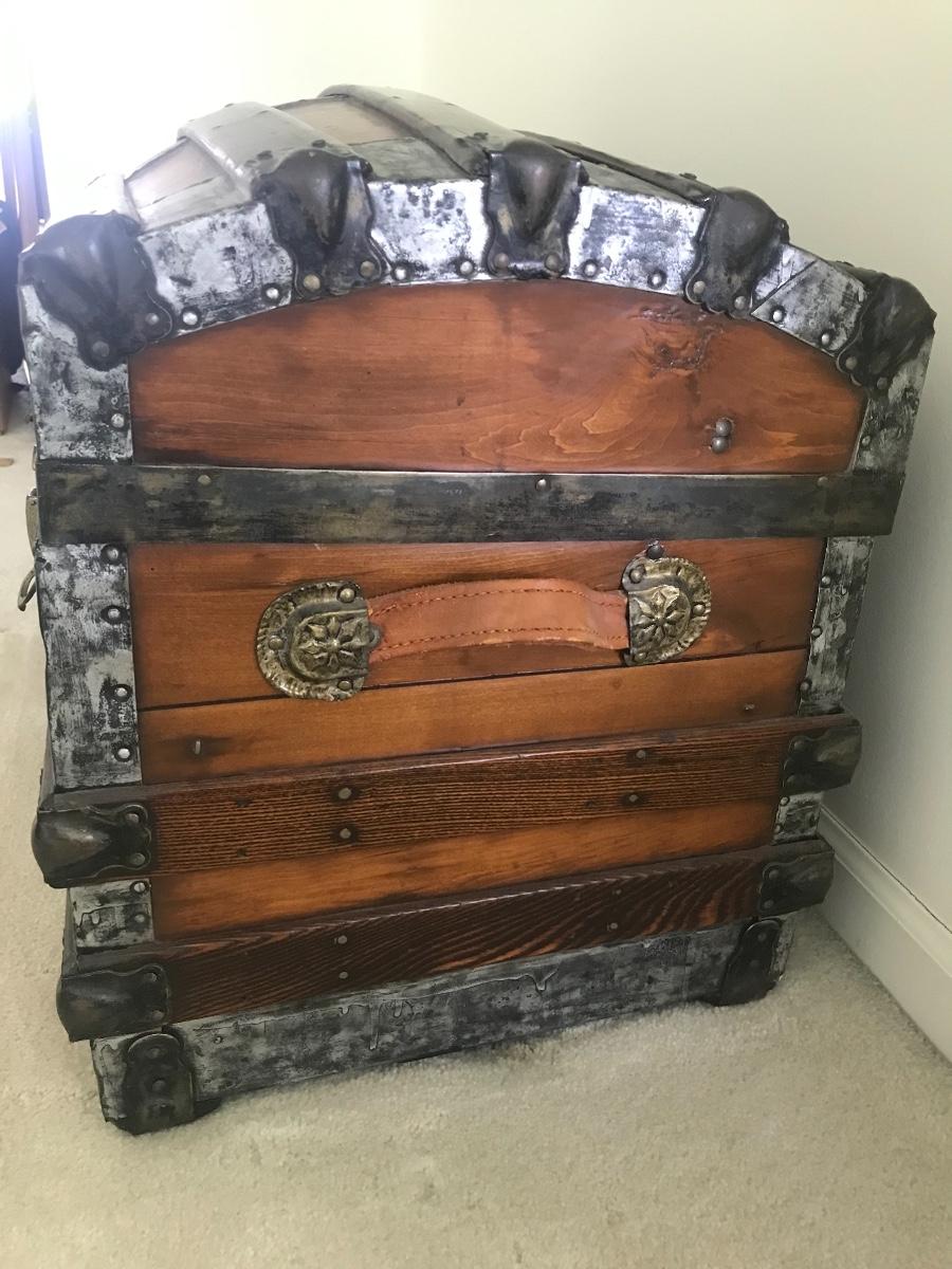 The client was an artist and loved antique trunks. She rescued them, and brought them back to life with repairs to metalwork, and padding inside for storage. This piece is gorgeous with the curved wood, and the industrial look! Function and design! Wooden trunk with leather handles and metal locks. Inside has the insert. 28.5x15x20. Please see all pictures for content of the lot, condition of the lot, and measurements if taken. Pictures are the best representation of the items listed and items are untested unless indicated in description. Thank you for looking and have fun bidding!