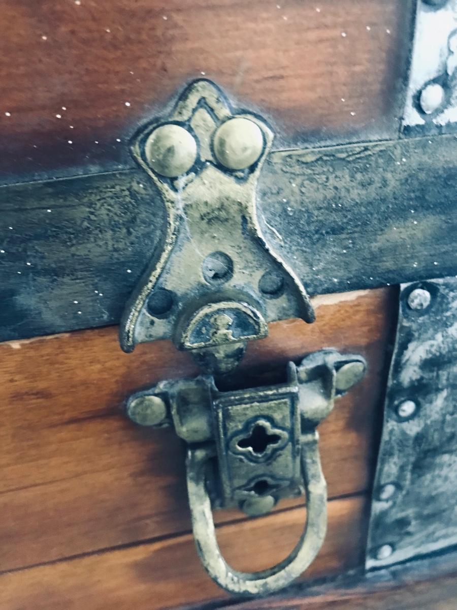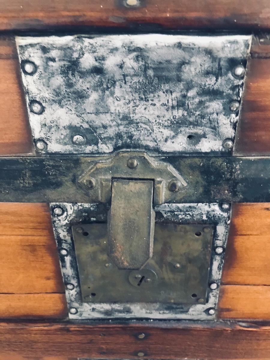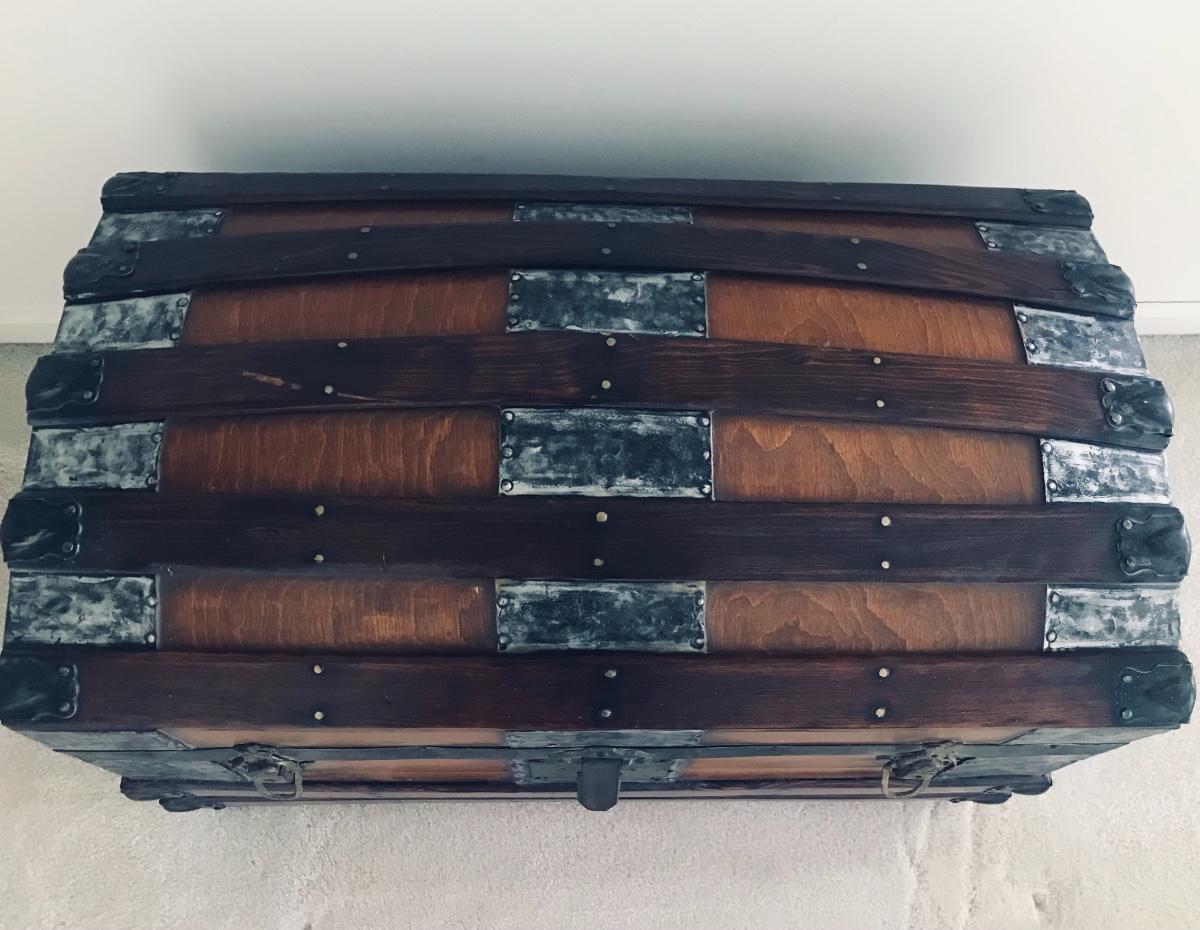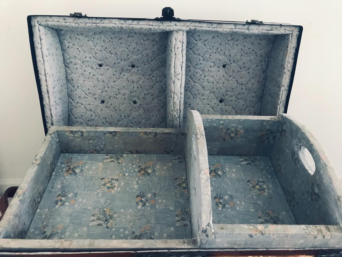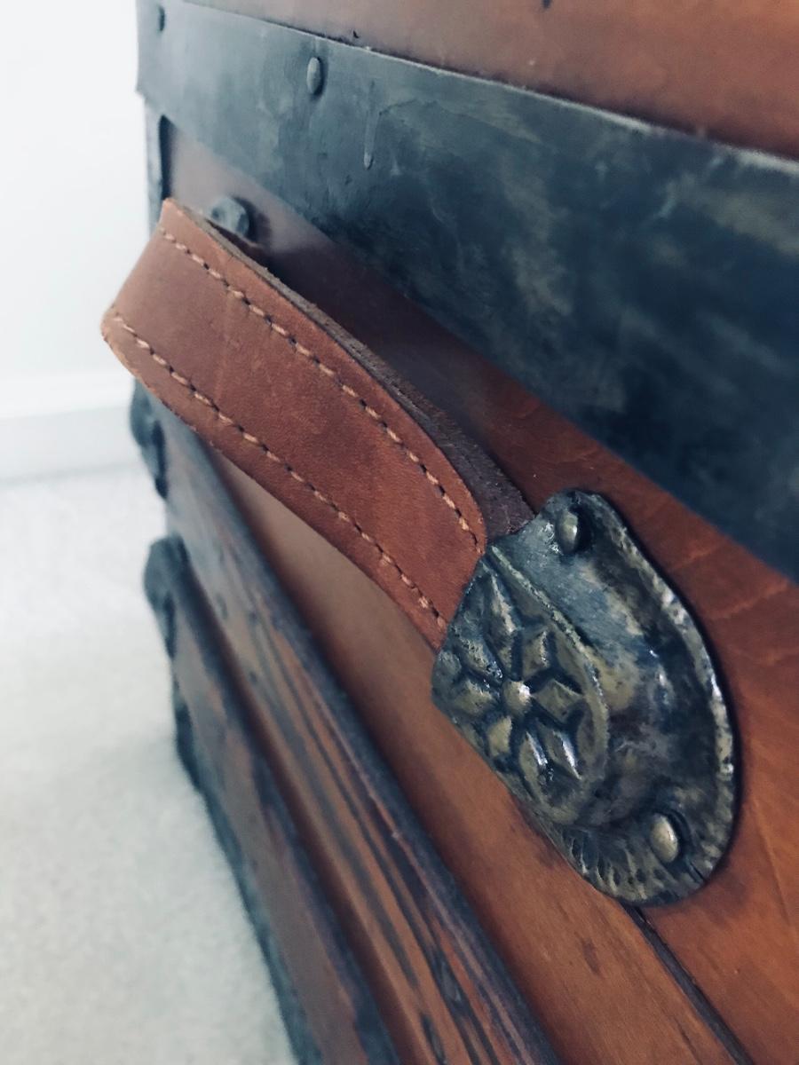 The client was an artist and loved antique trunks. She rescued them, and brought them back to life with repairs to metalwork, and padding inside for storage. This piece is gorgeous with the curved wood, and the industrial look! Function and design! Wooden trunk with leather handles and metal locks. Inside has the insert. 28.5x15x20. Please see all pictures for content of the lot, condition of the lot, and measurements if taken. Pictures are the best representation of the items listed and items are untested unless indicated in description. Thank you for looking and have fun bidding!