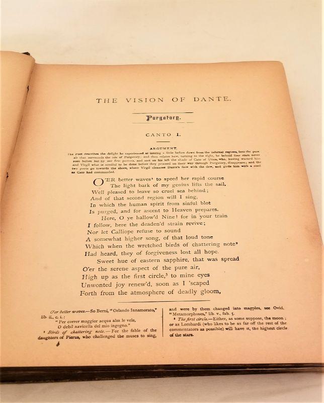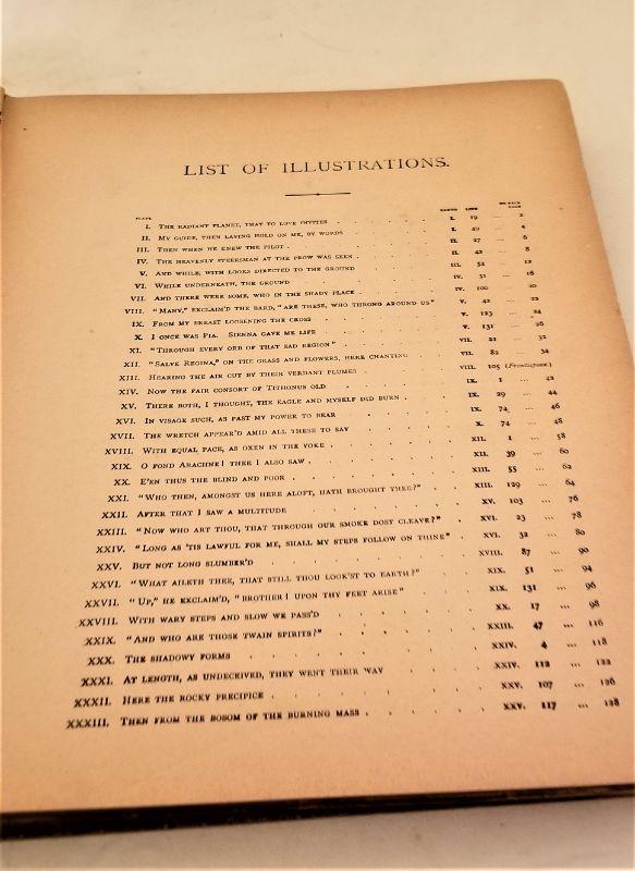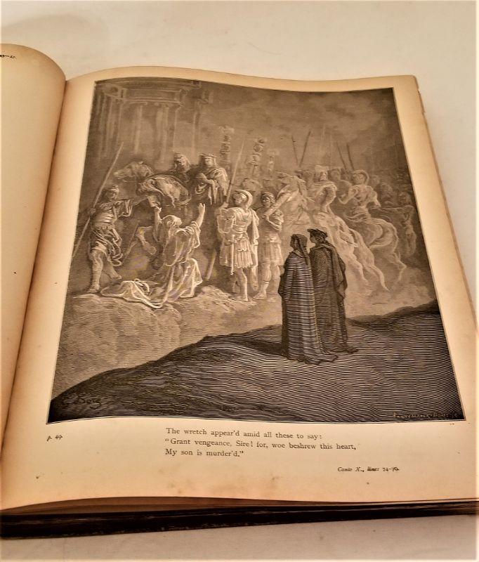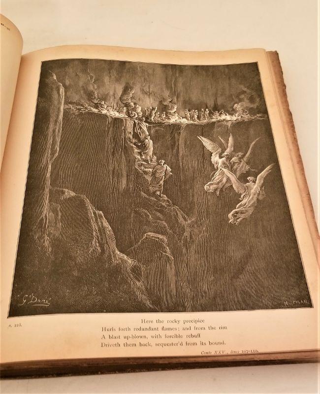 A classic by Dante Alighieri, illustrated by Gustave Dore, translated by the Rev. Henry Cary. An impressive and scarce book for the serious collector. Published 1885 - over 50 illustrations. Measures 12" x 10". Cover a bit loose but inside in great antique condition. The engravings alone would be worth at least $10 - $15 each.