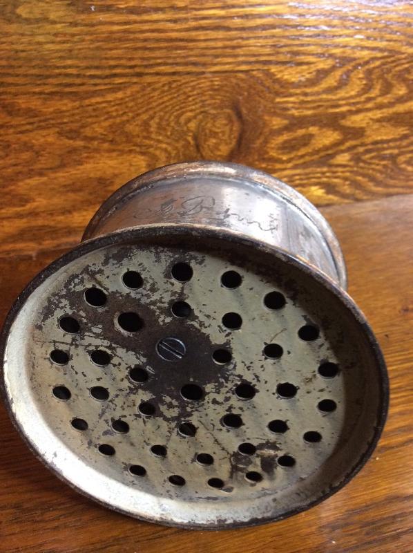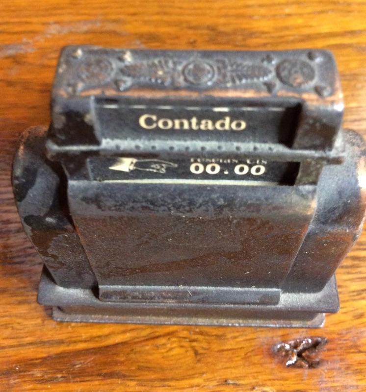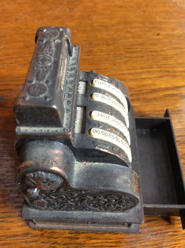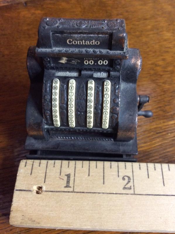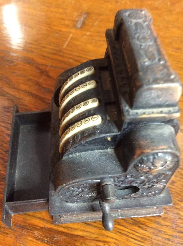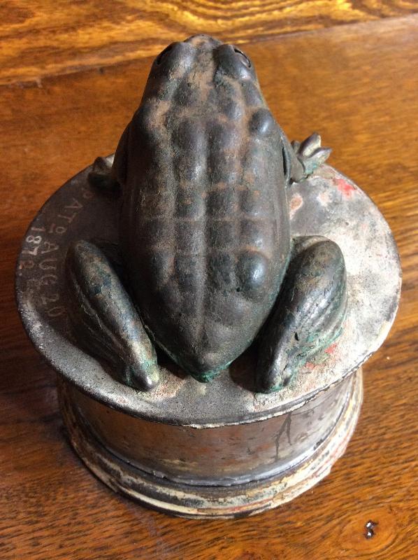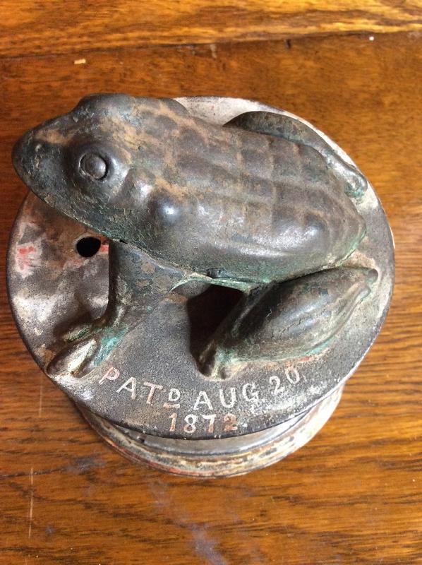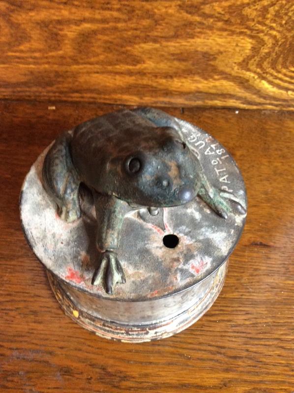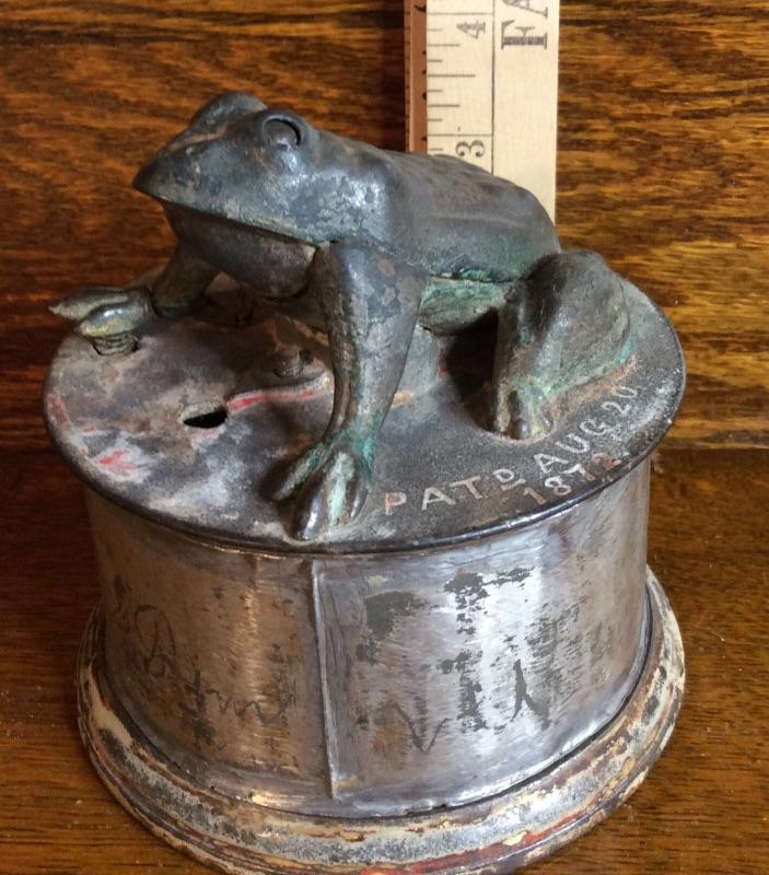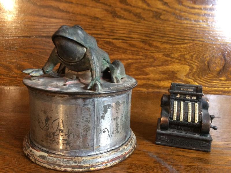This is an antique cast iron frog bank that has been made from parts of an original J& E Stevens Cast iron frog bank, pat. Aug 20, 1872. This has been made from the original base and top, but the center cage has been replaced with galvanized tin. The mechanical mechanism of the frog is you press his hand, his mouth opens and he swallows the coin. Works and As is. Also, a Play Me cash register metal toy pencil sharpener.