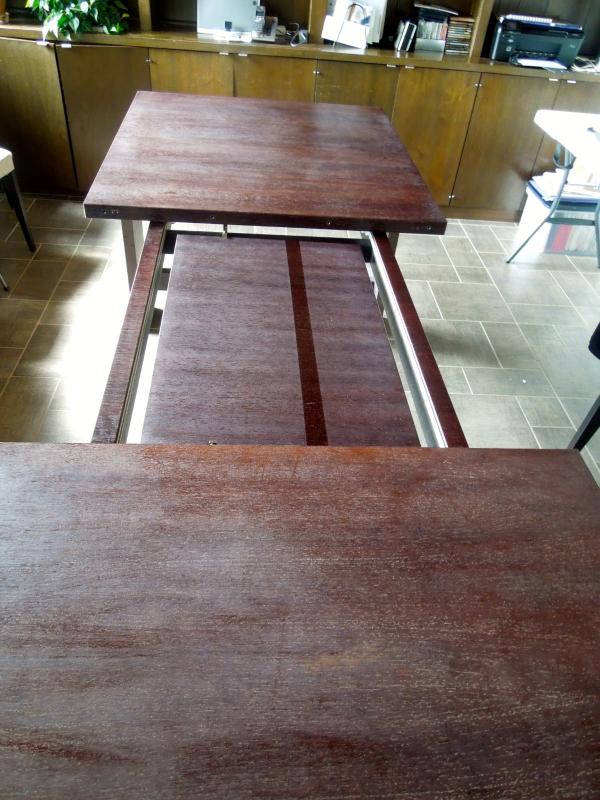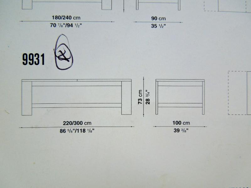 Table designed by Antonio Citterio for Maxalto of B&B ITALIA. Made of Wenge wood with a chocolate finish. Table pulls apart and the extra extension leaf is stored on hinges underneath that can easily be enabled. Extends from 86" to 118" (See diagram of specs in photo). Some edges show worn finish. No gouges. Basket on table in photo sold separately. Have original receipt. Table retails for over $3000. Chairs $640 each at market price.