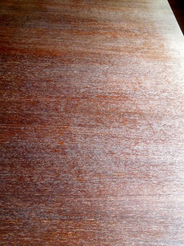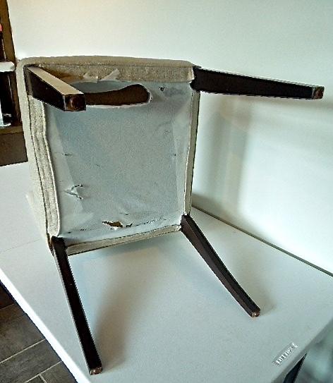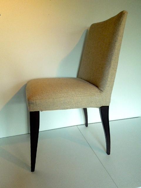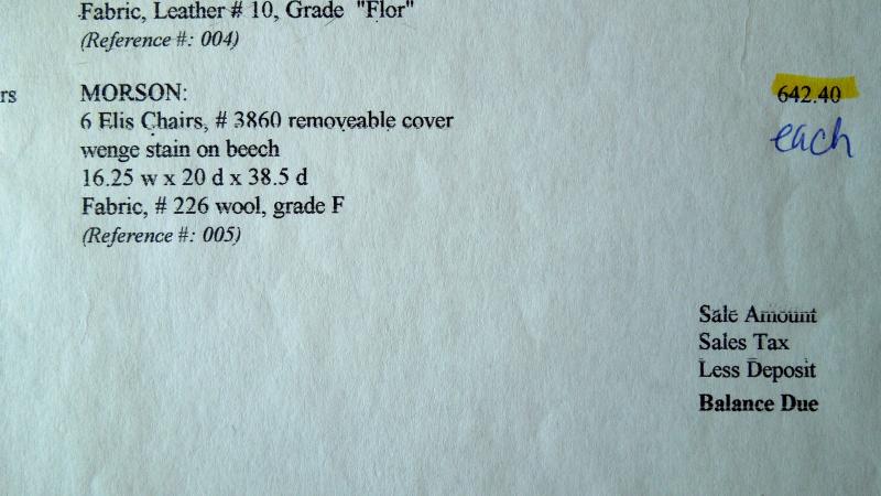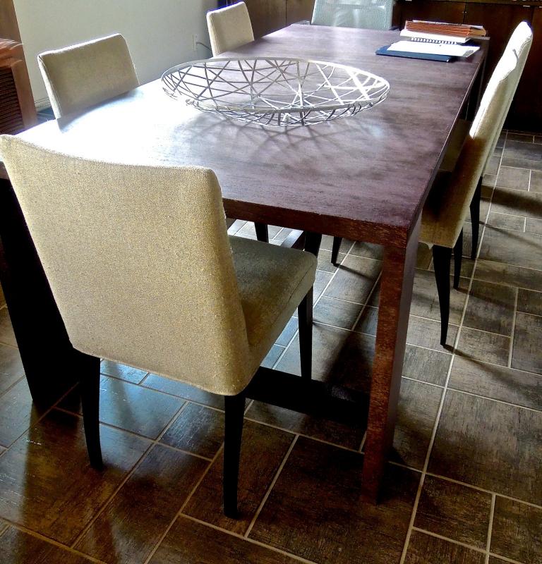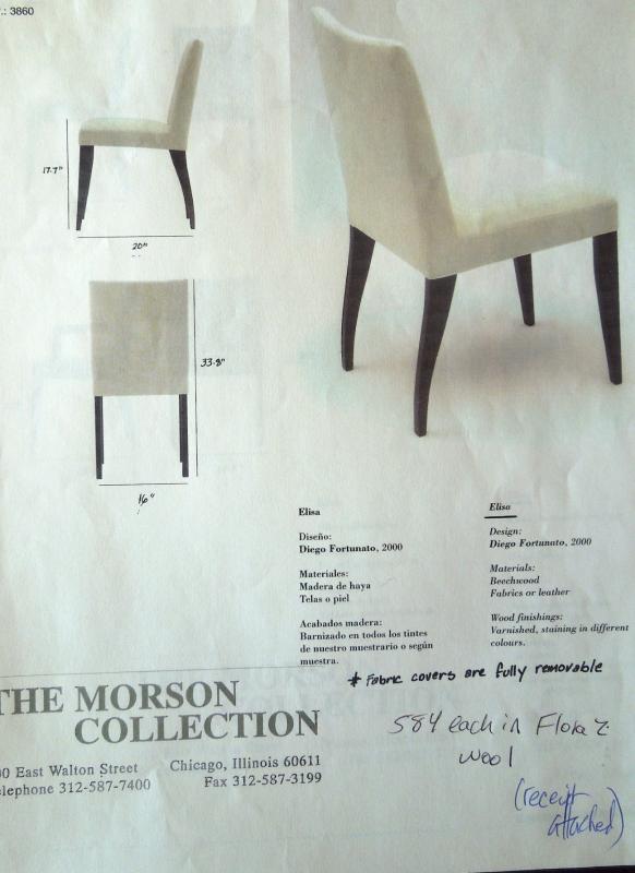 Additional note on chairs: These are 6 Morson Collection "Elis" parson style chairs designed by Diego Fortunato. These are covered in light gray wool upholstery over beechwood frame and are fully removable (attached with strips of velcro. Some minor pulls and small stains in fabric. Only five shown in photo, but there are 6. Bring help please to remove and disassemble.