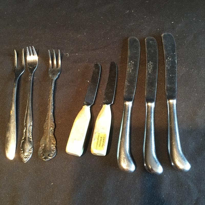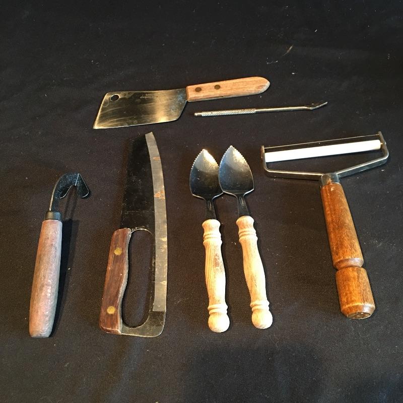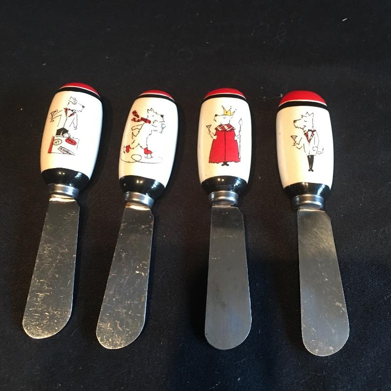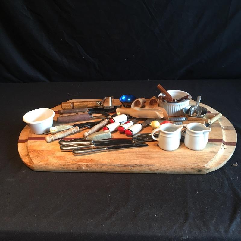 Be ready for your next party with this nice selection of accoutrements for your charcuterie board that includes a pair of Irish marble handled knives, four dog design knives wood handled knives and cheese cutter, mini scoops in wood and metal, small cleaver, wooden charcuterie board and more. Board measures 13” x 22” x 1”.