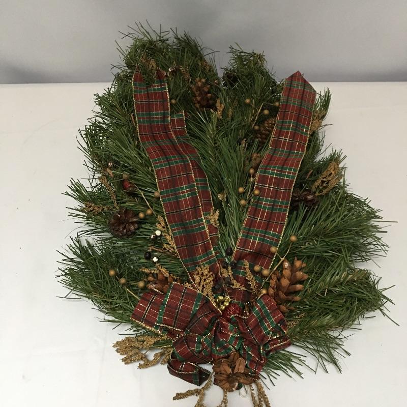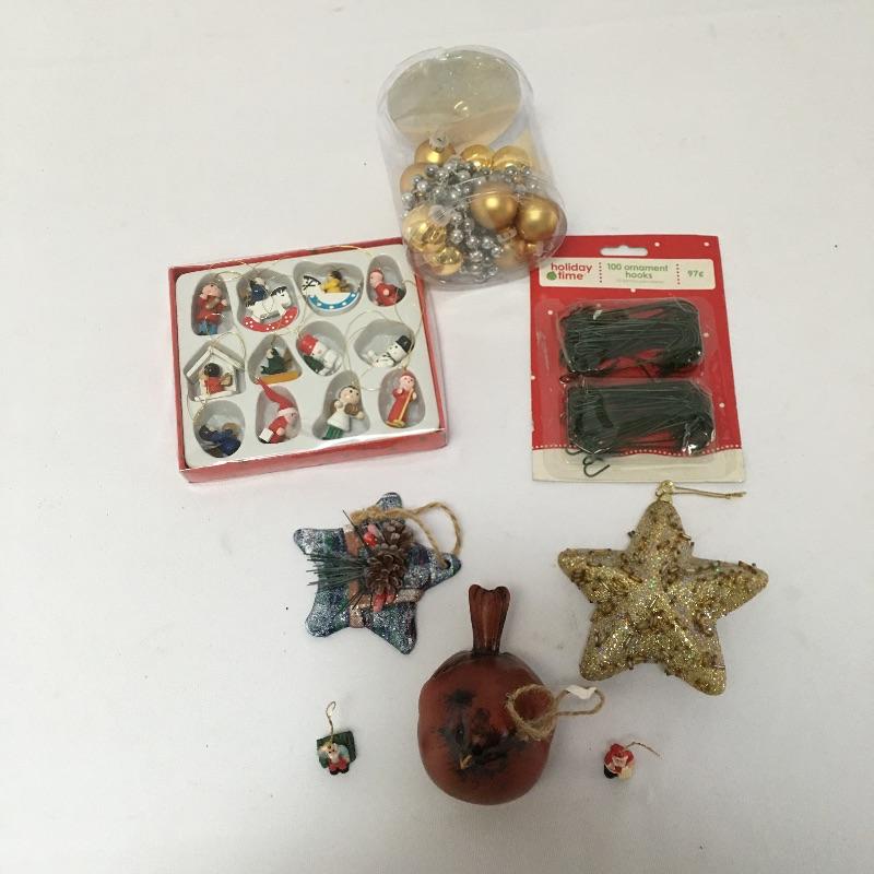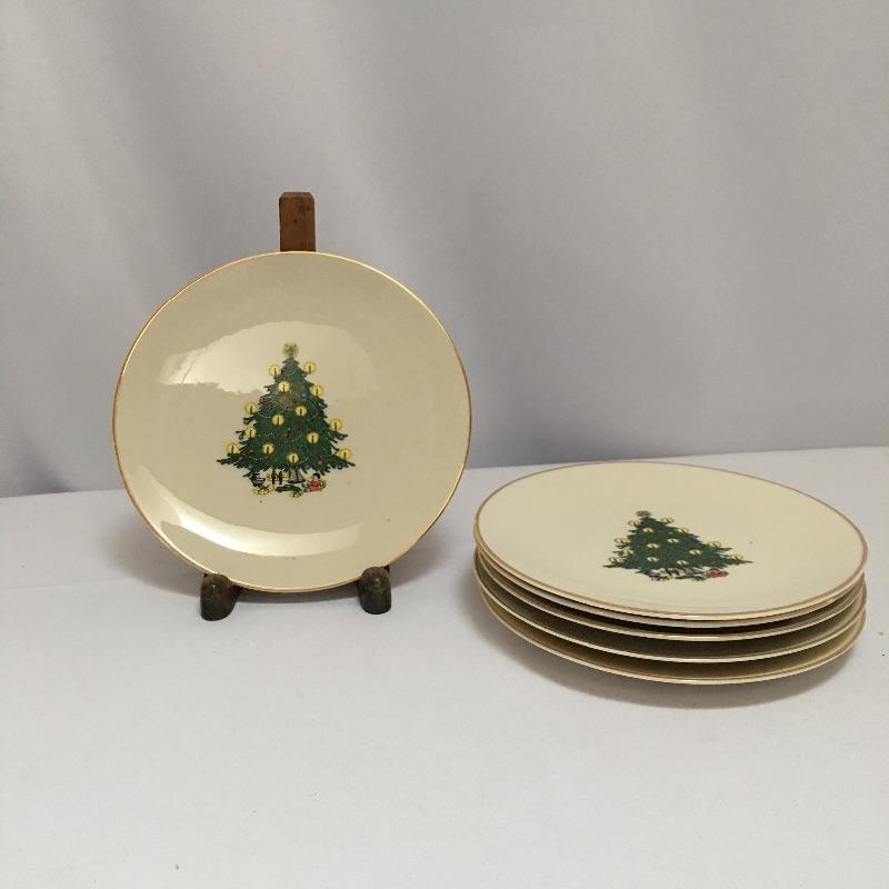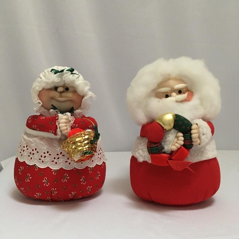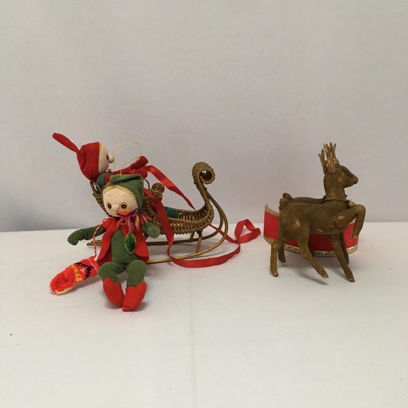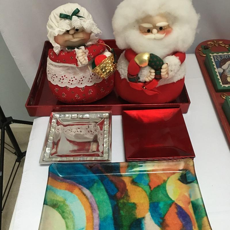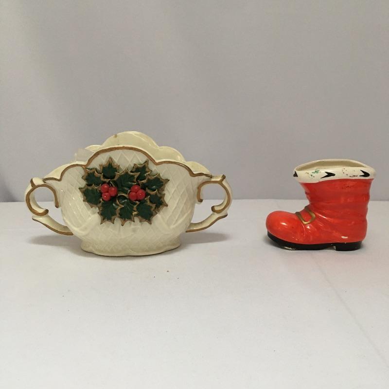 Christmas lot includes four strings of vintage lights, three tops sized P/M, wreath, pinecone tree, pair of elves, Mr and Mrs Claus, tray, six salad plates an two dinner plates by B.C. Clark, Mother of Pearl inlaid plate, Lefton boot and more. Round wreath measures 17”D.