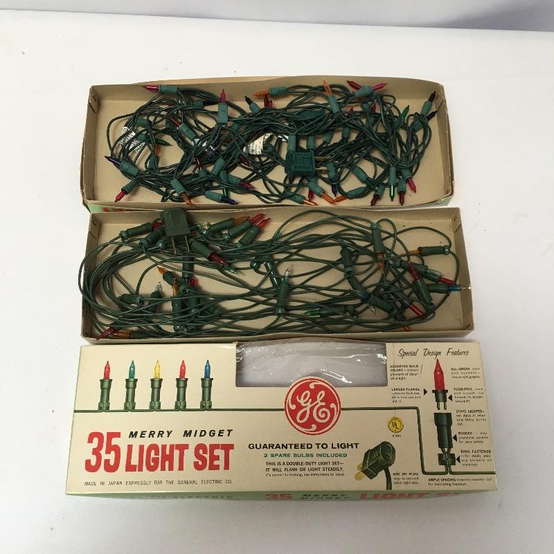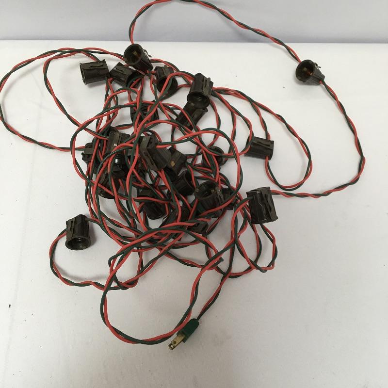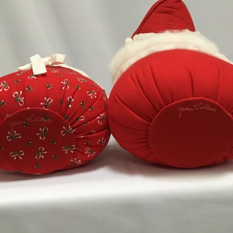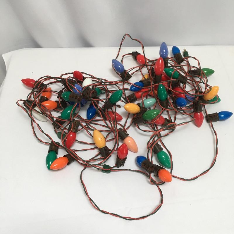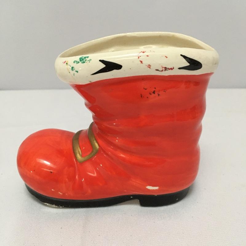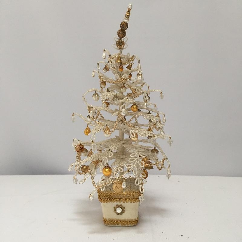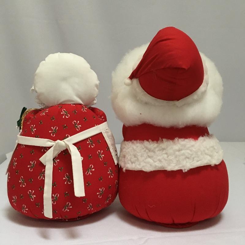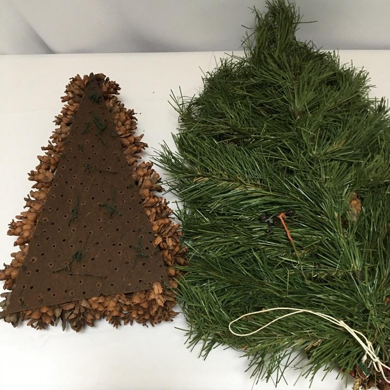 Christmas lot includes four strings of vintage lights, three tops sized P/M, wreath, pinecone tree, pair of elves, Mr and Mrs Claus, tray, six salad plates an two dinner plates by B.C. Clark, Mother of Pearl inlaid plate, Lefton boot and more. Round wreath measures 17”D.