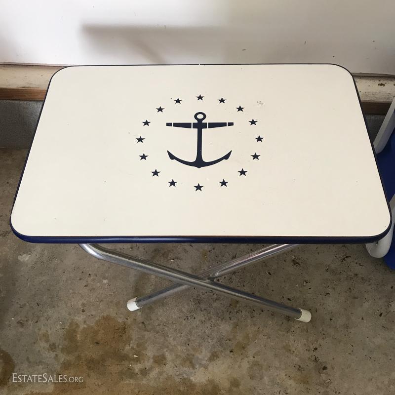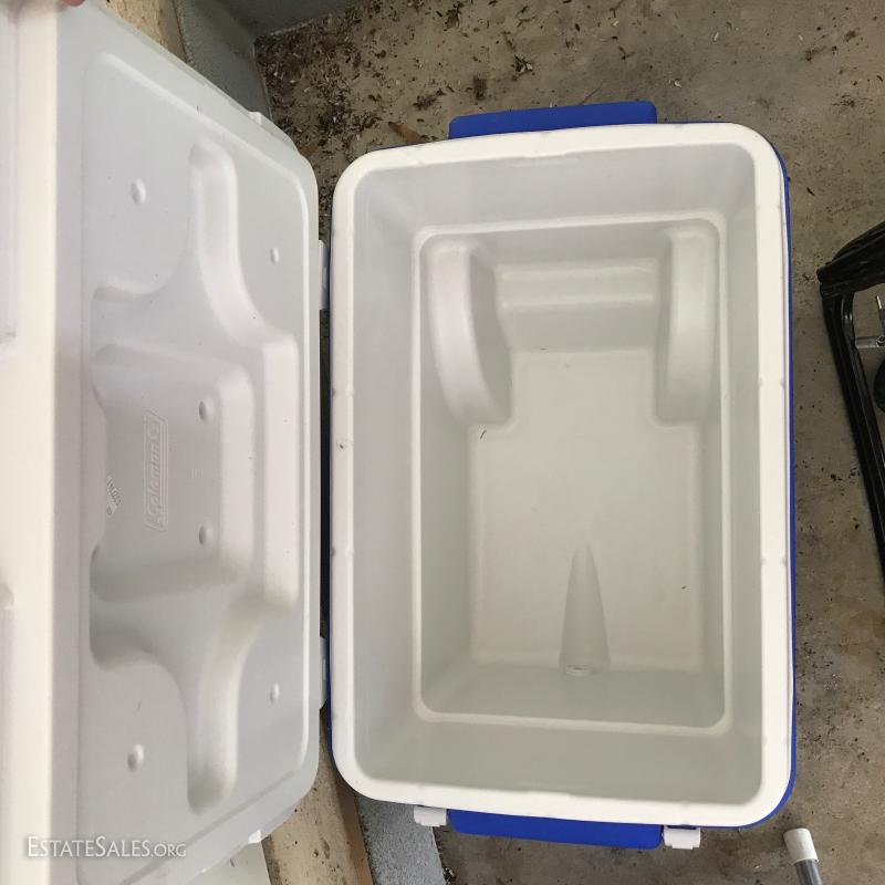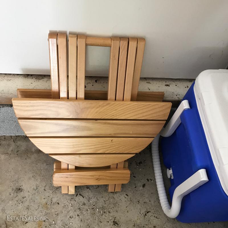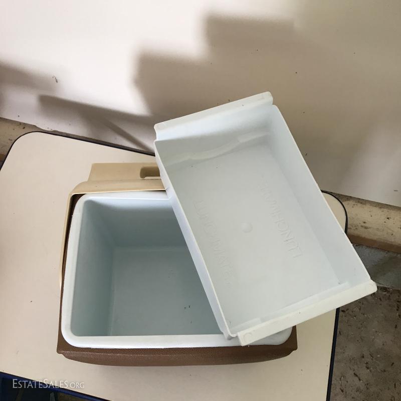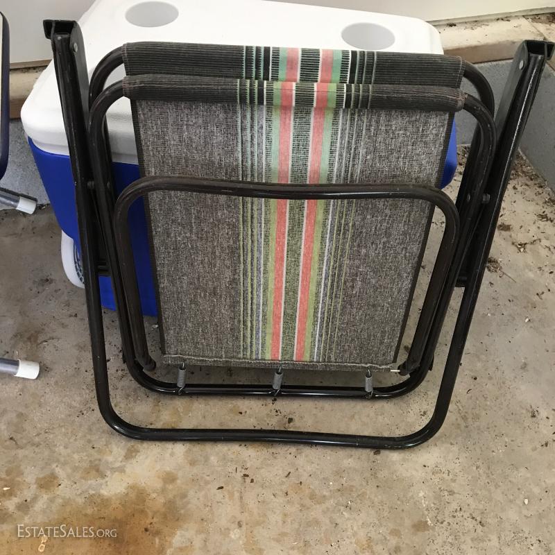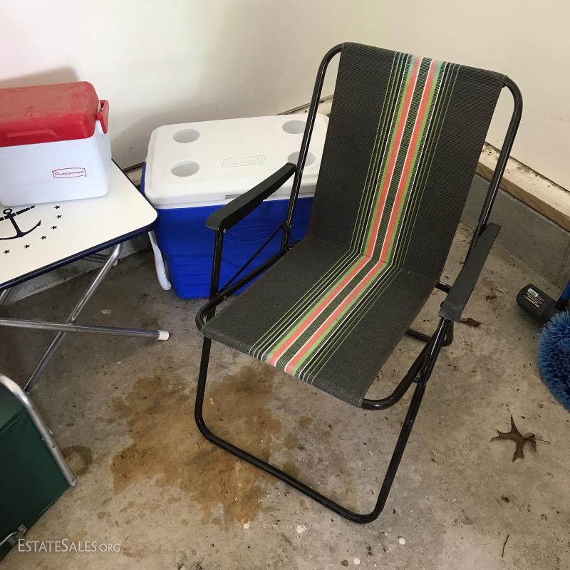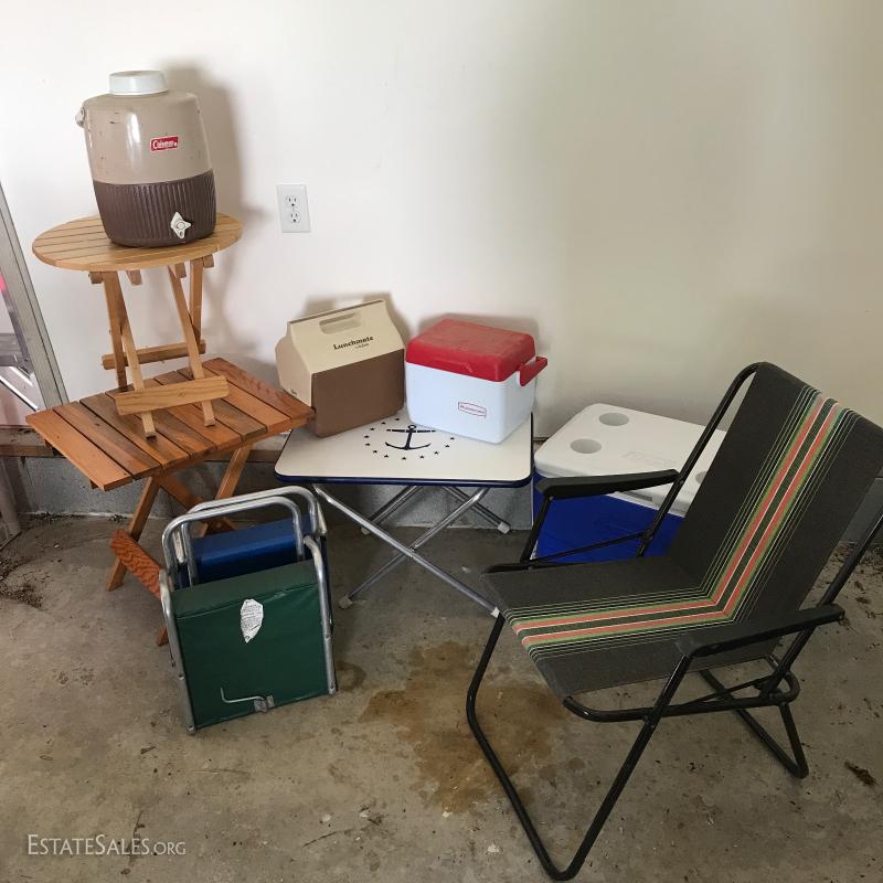 Small vintage playmate lunch cooler in brown and tan (still has the food tray), vintage Coleman large thermos (brown and tan metal and plastic), larger Coleman blue roller cooler (like new), two stadium chairs, spring-close folding chair with canvas seat, three folding wood tables (one round), one metal and one Formica folding nautical table. This lot is available for local pick up in Mills River, NC only.