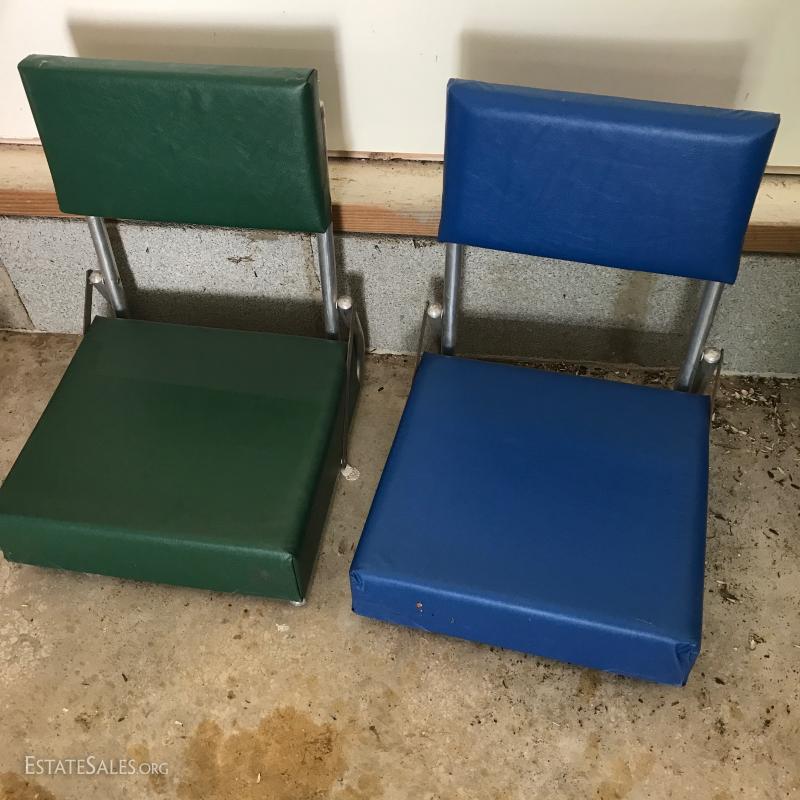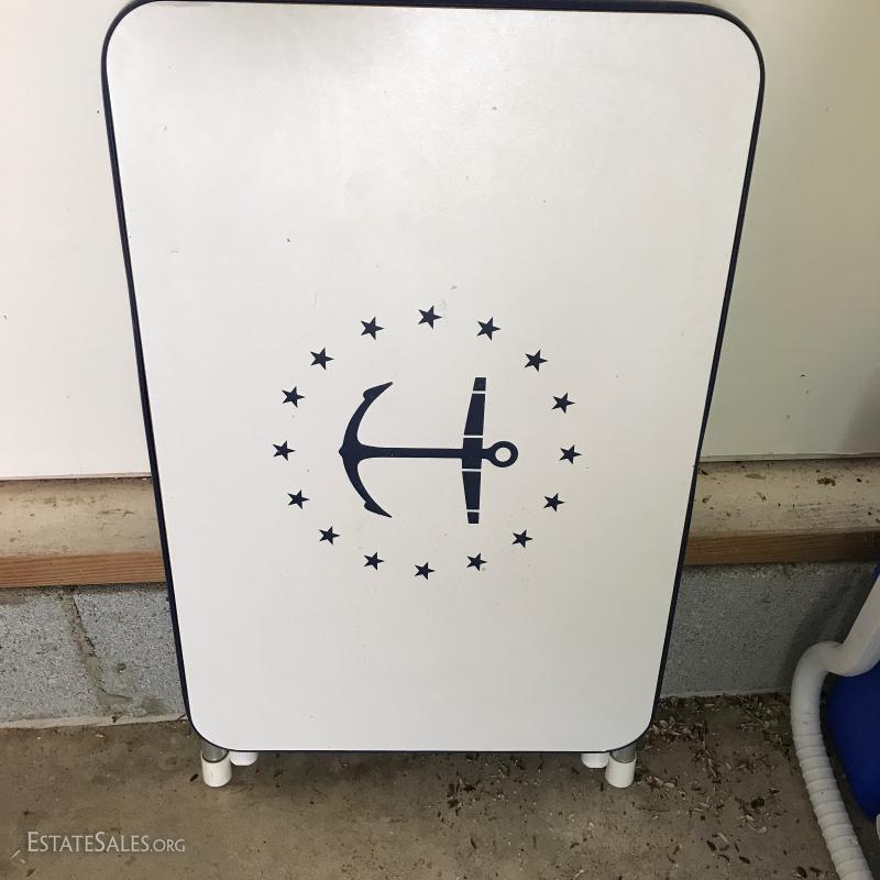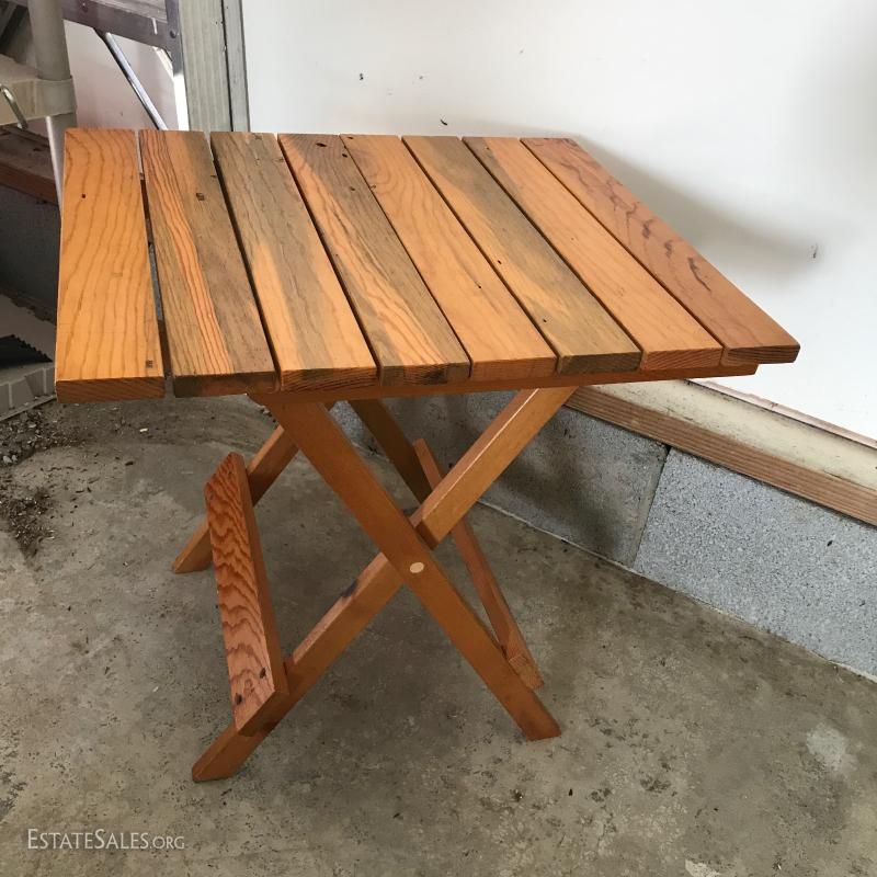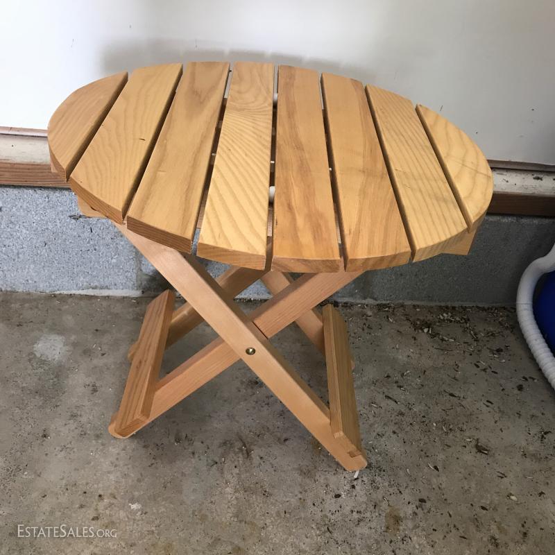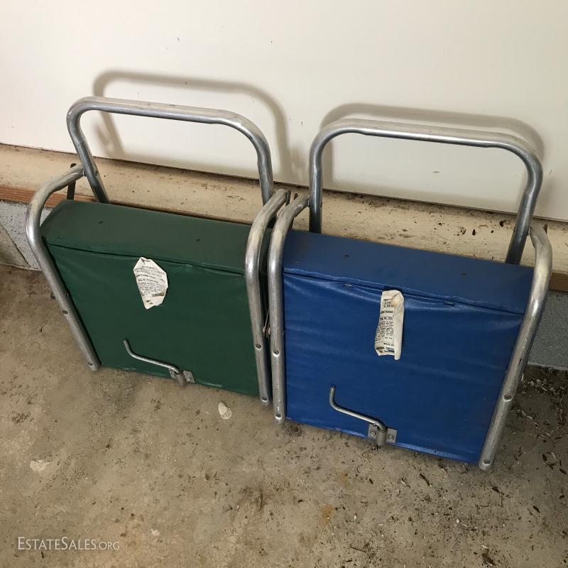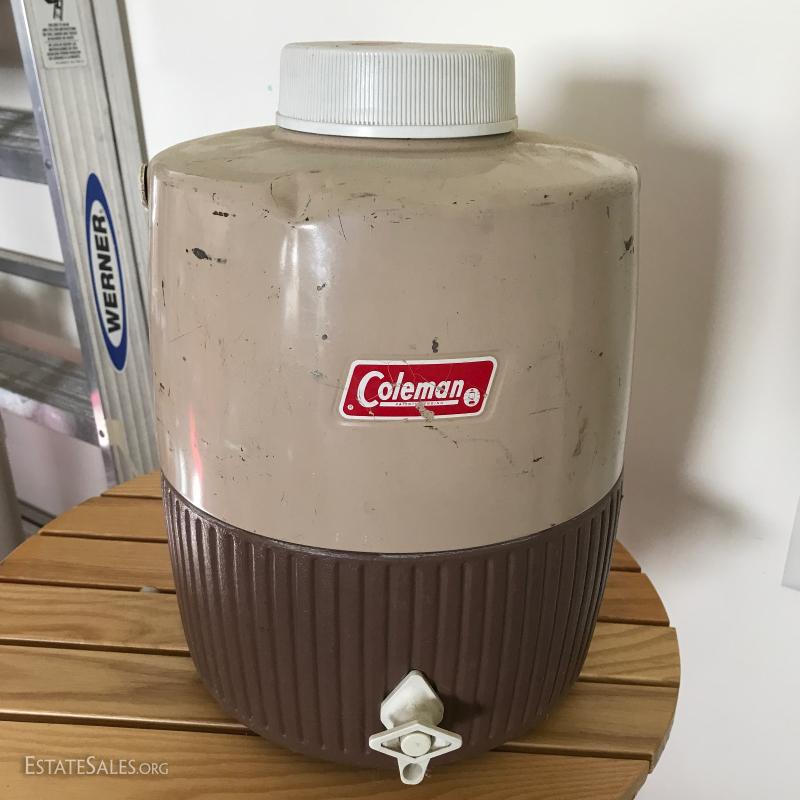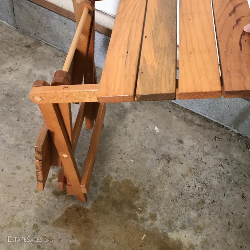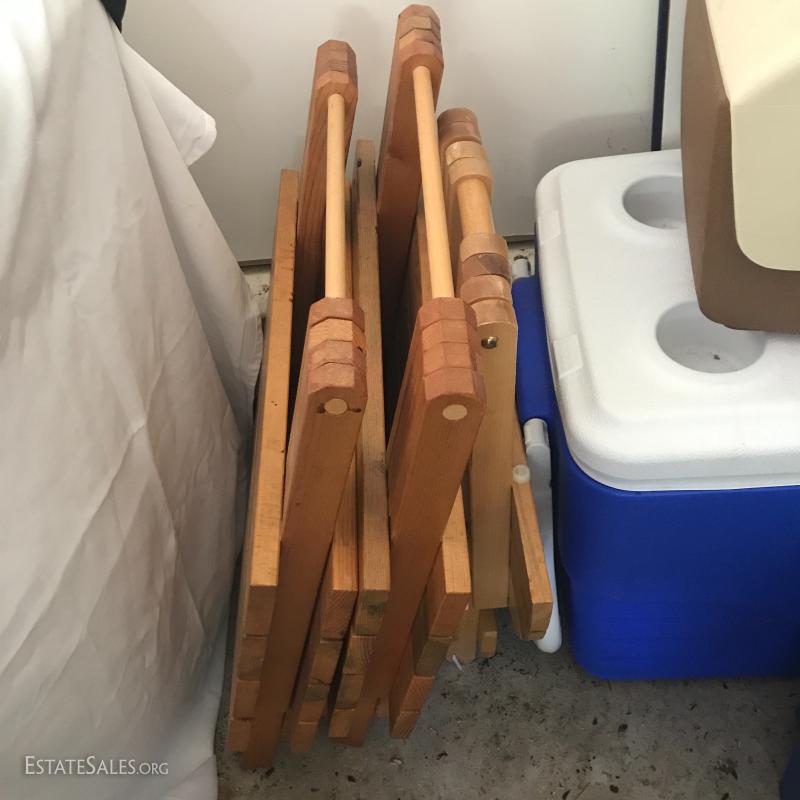 Small vintage playmate lunch cooler in brown and tan (still has the food tray), vintage Coleman large thermos (brown and tan metal and plastic), larger Coleman blue roller cooler (like new), two stadium chairs, spring-close folding chair with canvas seat, three folding wood tables (one round), one metal and one Formica folding nautical table. This lot is available for local pick up in Mills River, NC only.