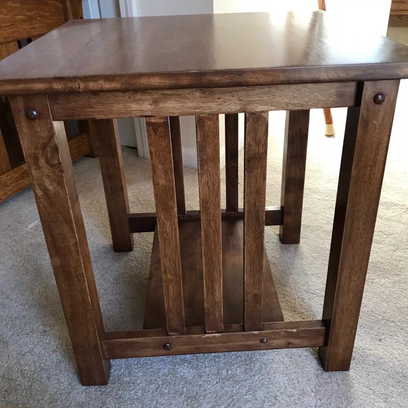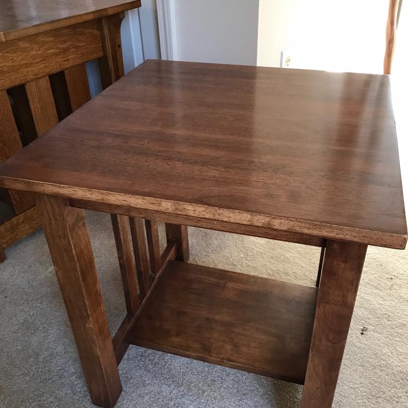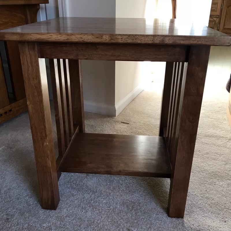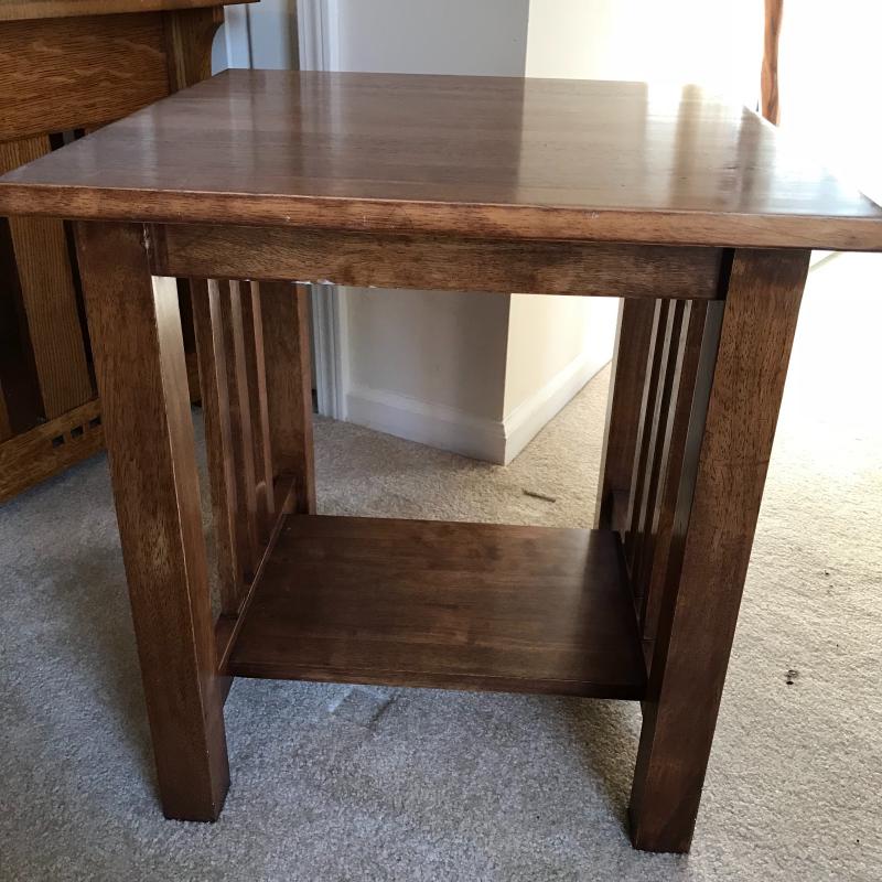 This wooden Mission Style end table is sturdy, compact, and a nice size for a small space. Approx. 20.5”l x 20”w x 21”h.