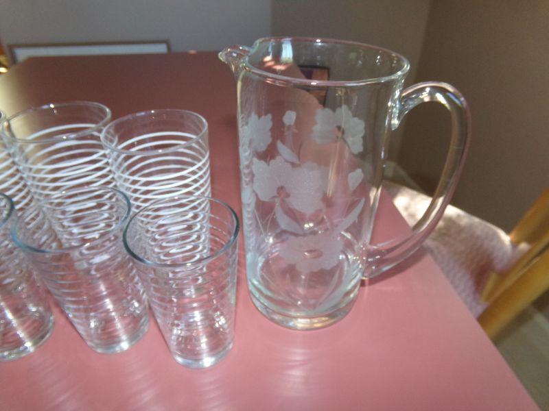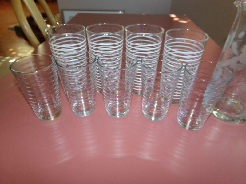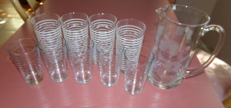 ETCHED GLASS WATER PITCHER, 4 STRIPED TUMBLERS AND 5 RINGED TUMBLERS