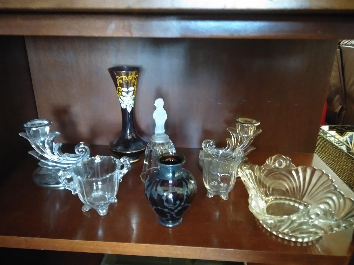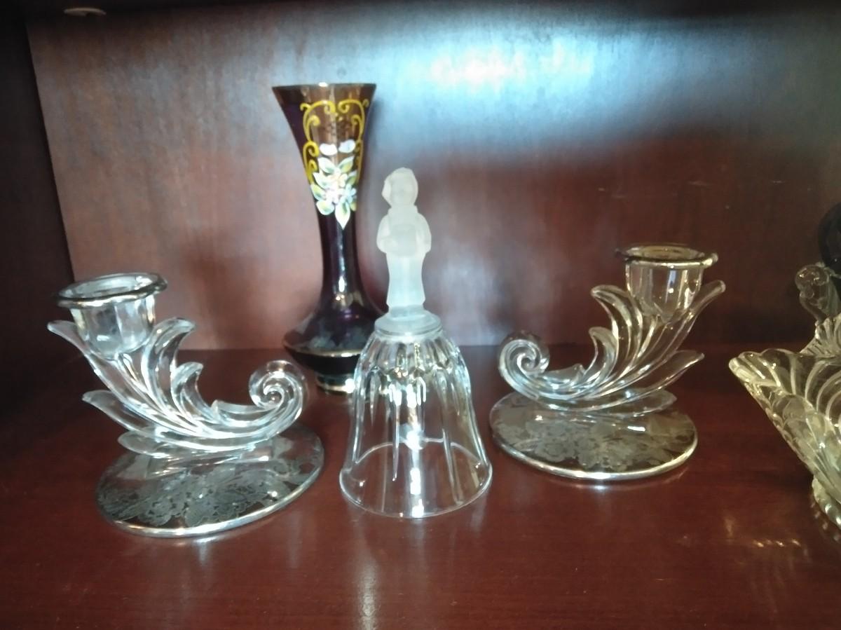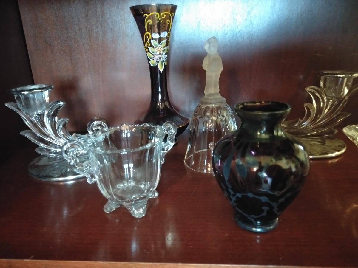 HUMMEL BELL, ASSORTMENT OF VINTAGE GLASSWARE AND A BEAUTIFUL PURPLE GLASS HAND PAINTED VASE