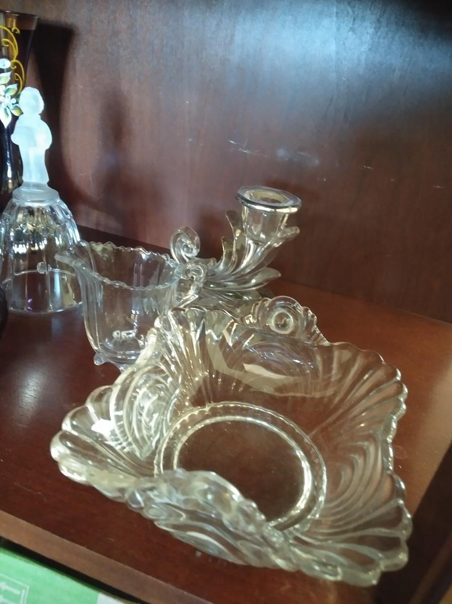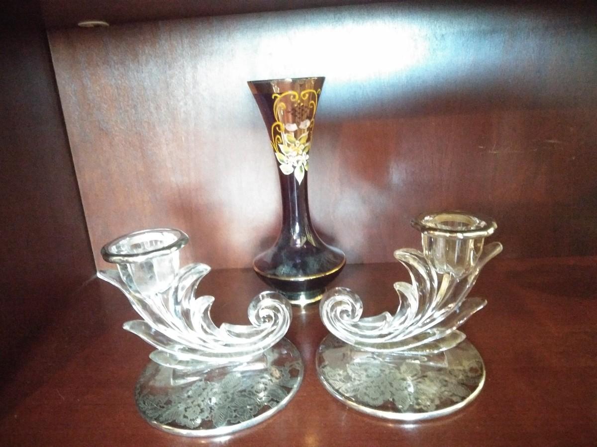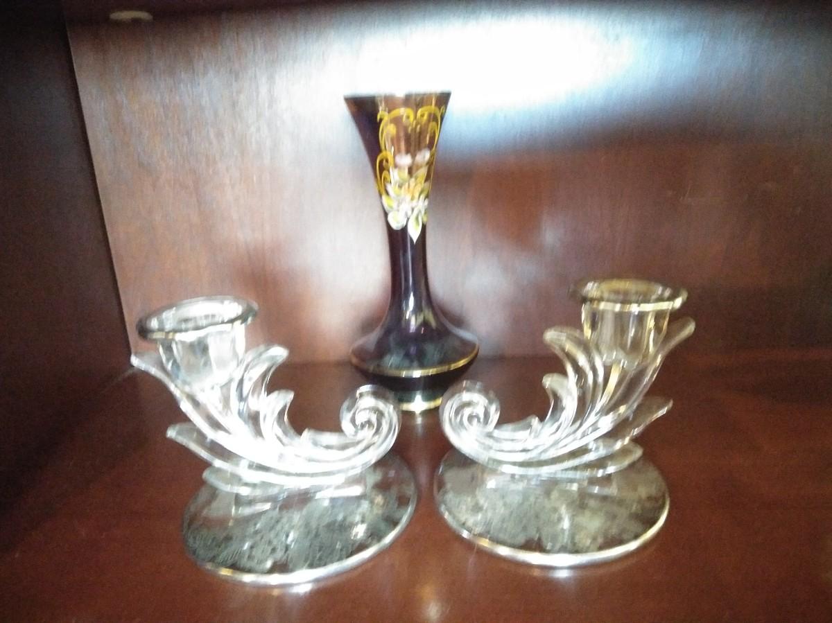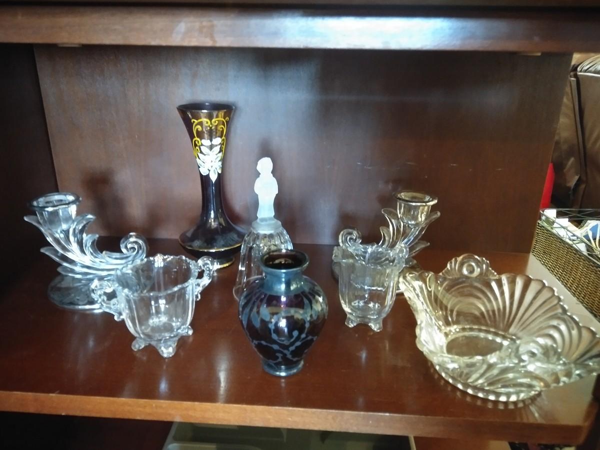 HUMMEL BELL, ASSORTMENT OF VINTAGE GLASSWARE AND A BEAUTIFUL PURPLE GLASS HAND PAINTED VASE