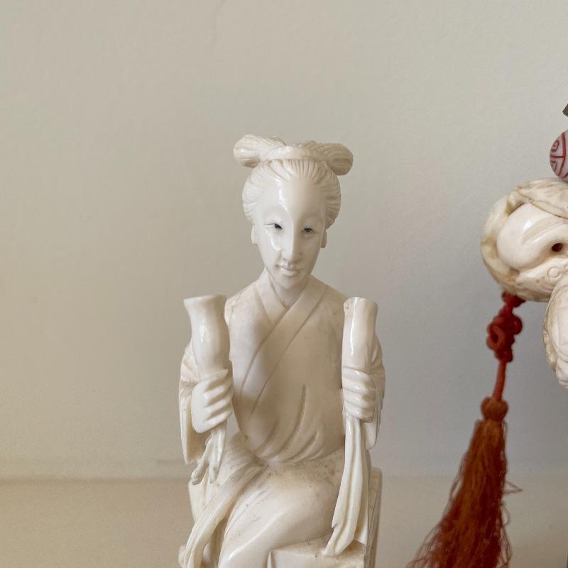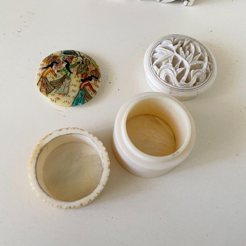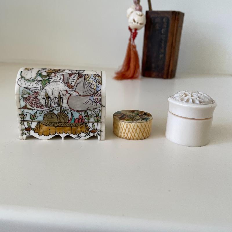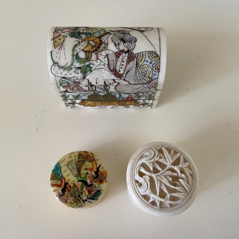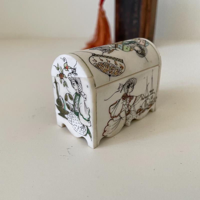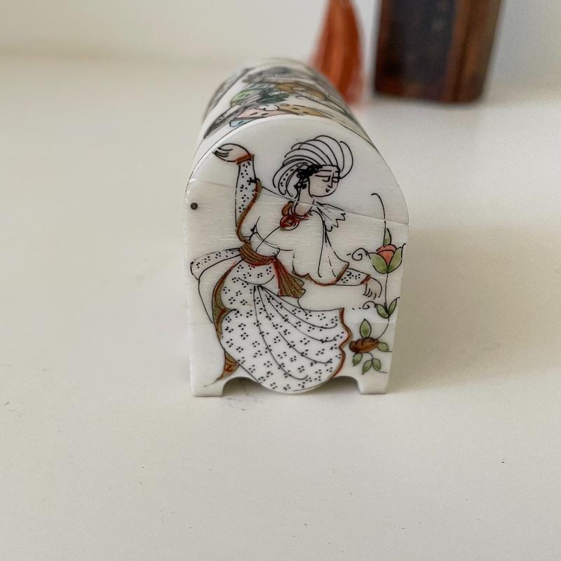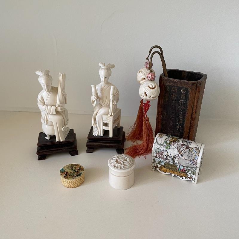 Seven fascinating figurines and boxes believed to be all from East Asian countries with the exception of the Turkish box. Two sitting women are attached to their stands with metal. Lot features a lovely hand painted box, two small boxes and two book marks with an old wooden tumbler. The women sit about 5” tall with their wooden stands. We are not able to determine materials like bone or resin. Make an appointment for the preview and come check these neat trinkets out! See photos. Shipping available.