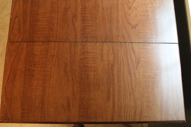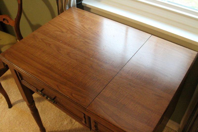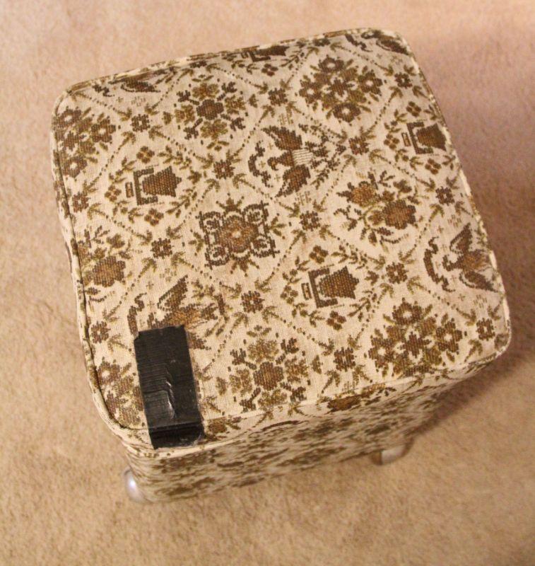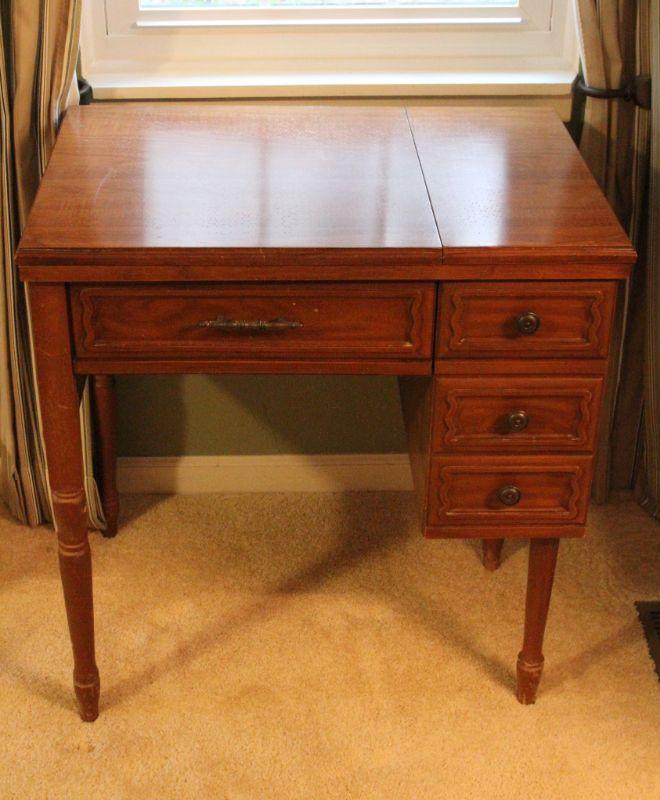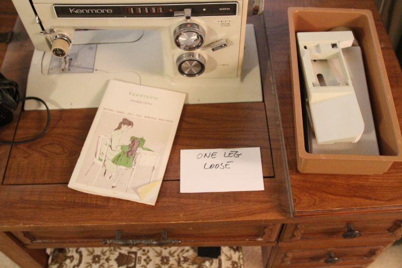 Vintage Kenmore 1660 Zig Zag sewing machine with metal housing in sewing cabinet table. Machine turns on, but may need service. Dimensions 21" d x 29" h x 30" w. Nice solid wood constuction. Manual and parts included. Foot control also included. Cabinet has storage area full of sewing notions and metal tims. Comes with a square 19 x 16 x 16 storage bench with fabric and notions. Bench has a hole that has been patched with black tape. Back right leg is broken off where it mounts to base, and needs repair.