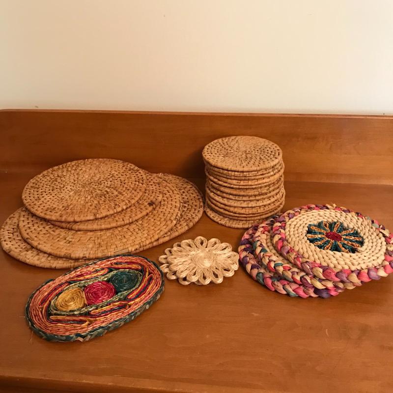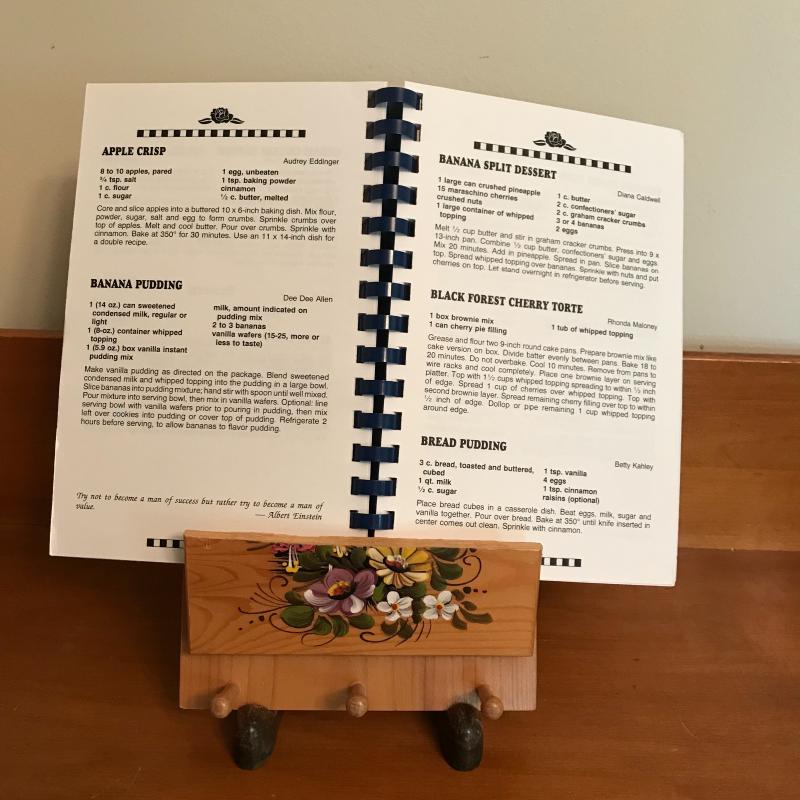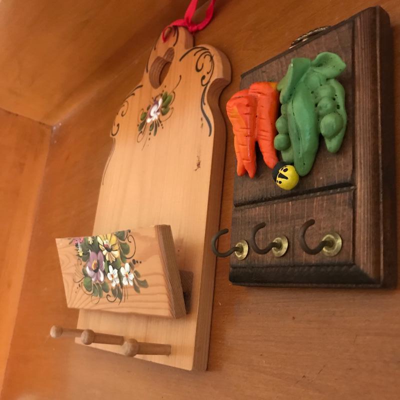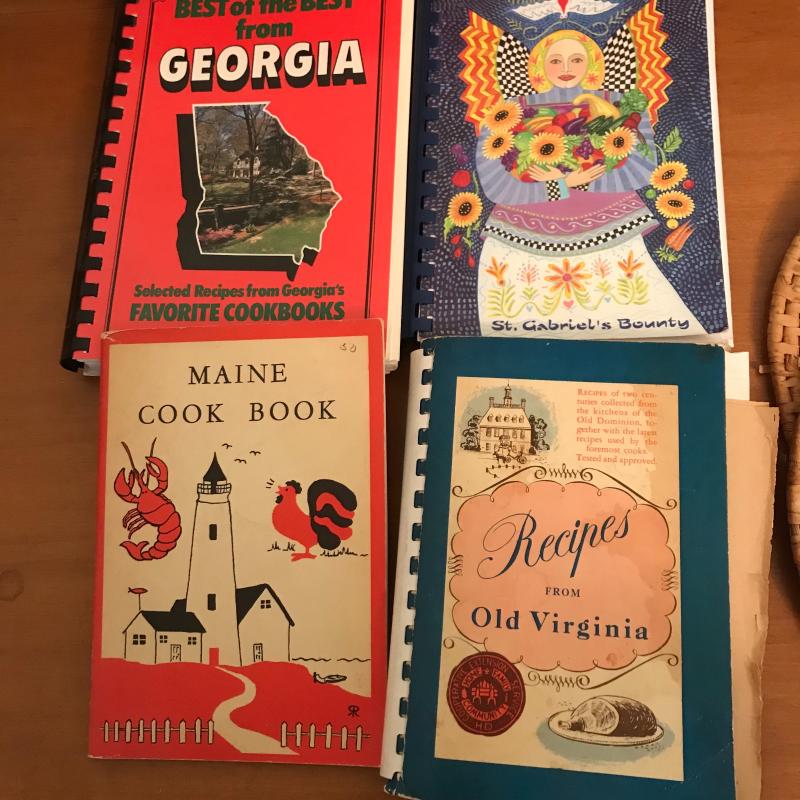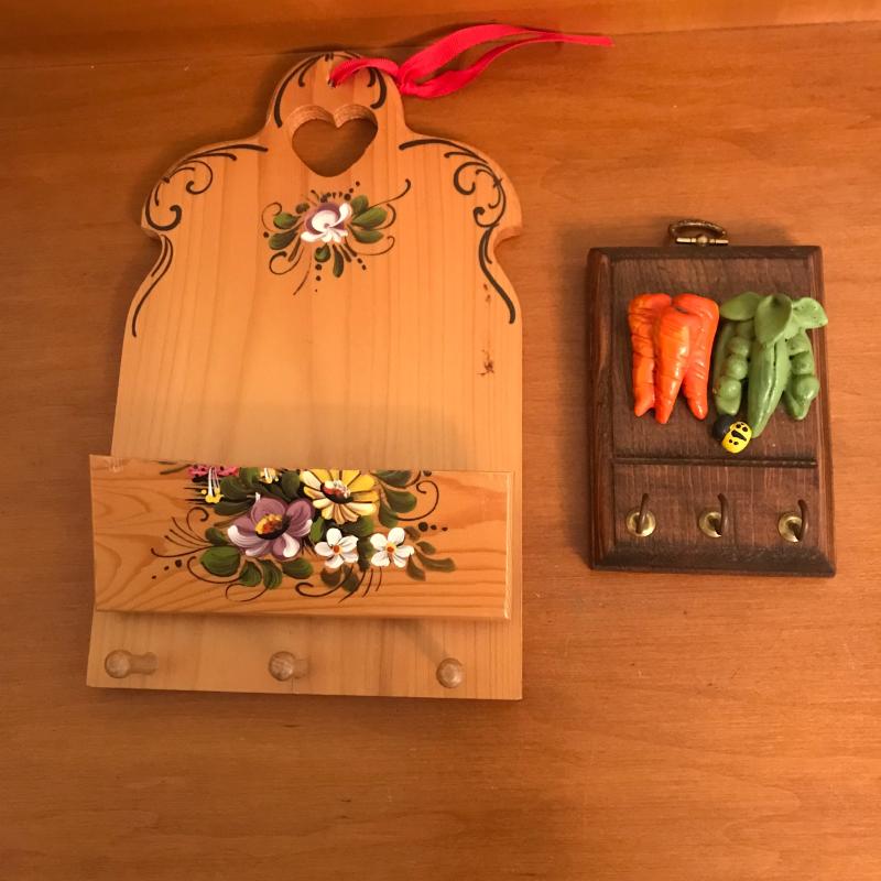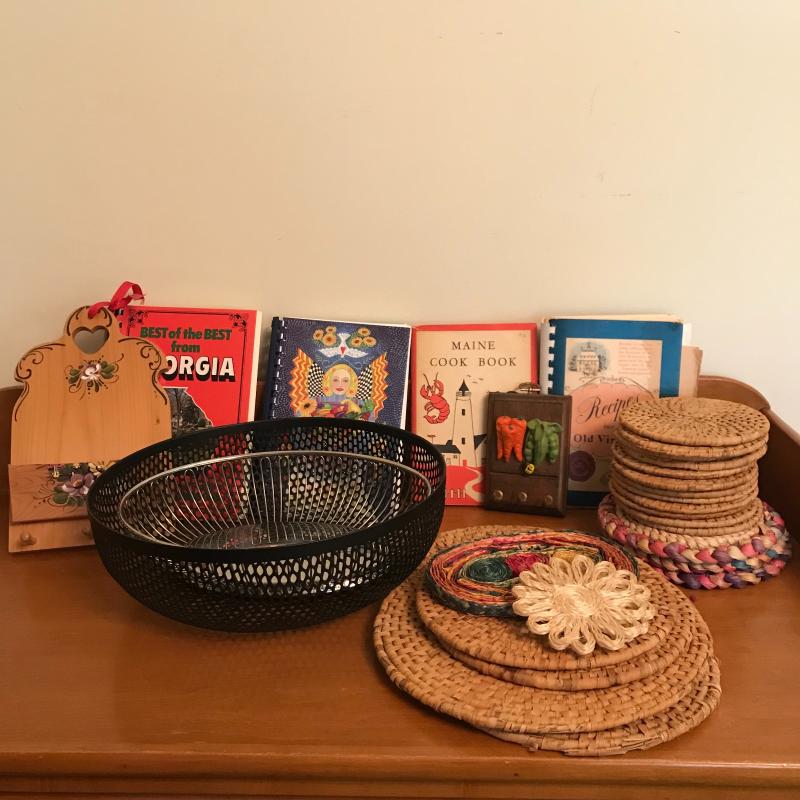 This kitchen lot includes a collection of trivets in great shape with two metal wire produce bowls, four cookbooks from Eastern United States and two small wooden wall decorations with hooks. The flowered hook is approx. 11”x6” and has a nook to display a small cookbook or something else. Local pick up only.