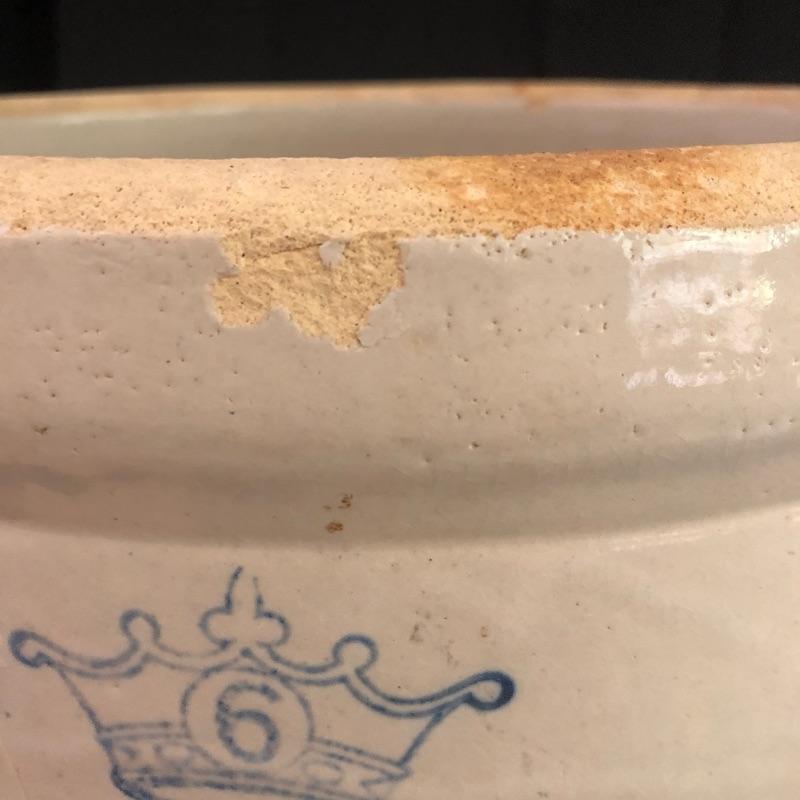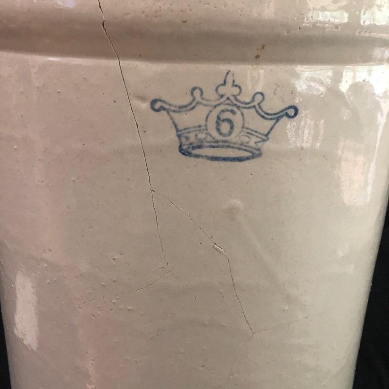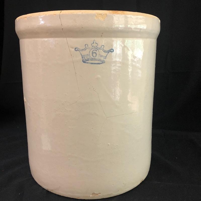 Yet another vintage treasure! This Number 6 crock measures approximately 13”d x 15” tall. The small crown logo shows very little wear. There are some minor cracks and nicks around the rim, but piece is structurally sound. Shipping Available.