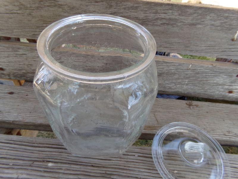 IT'S HARD TO SEE BUT THE WORDS, "PLANTERS PEANUTS" IS ON THE CONTAINER IN RAISED LETTERING AND ITS LID HAS A PEANUT HANDLE