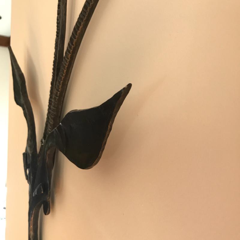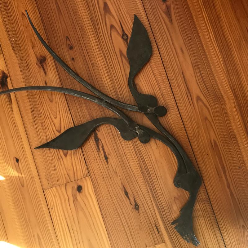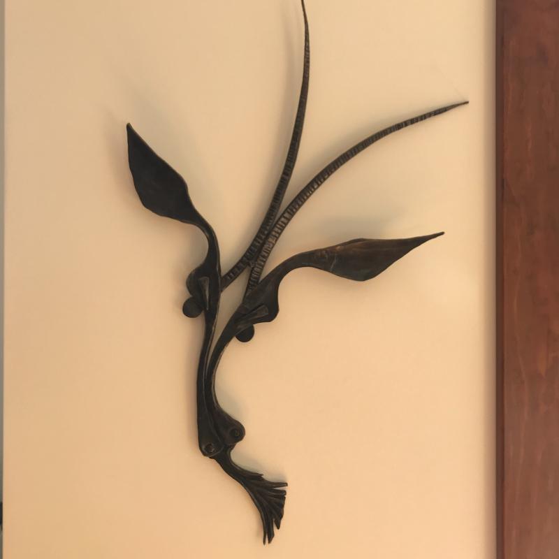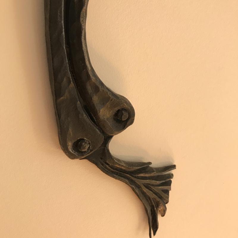 Beautiful metal piece is in the shape of a goat head. Look closely and you will see its horns. It hangs nicely on your wall and makes a great talking piece. Measures 28”l x 16.5”w. Shipping or local pick up in Asheville. Please note that this piece is heavy metal. Would likely be costly to ship. Call your local UPS store to get an estimate.