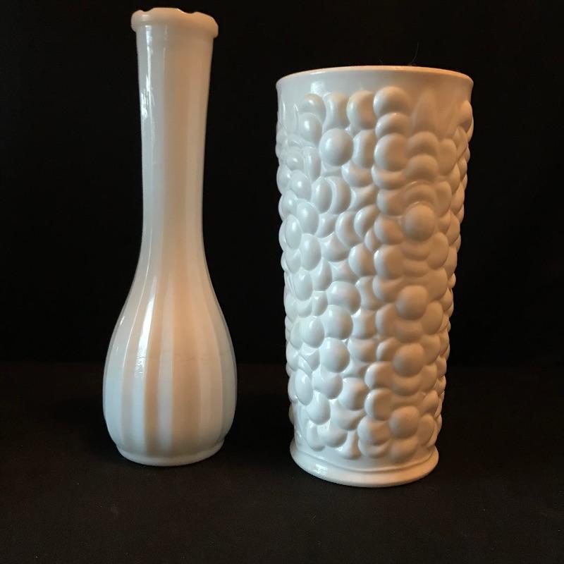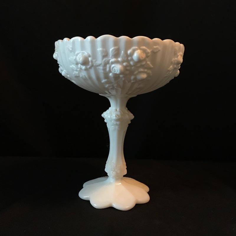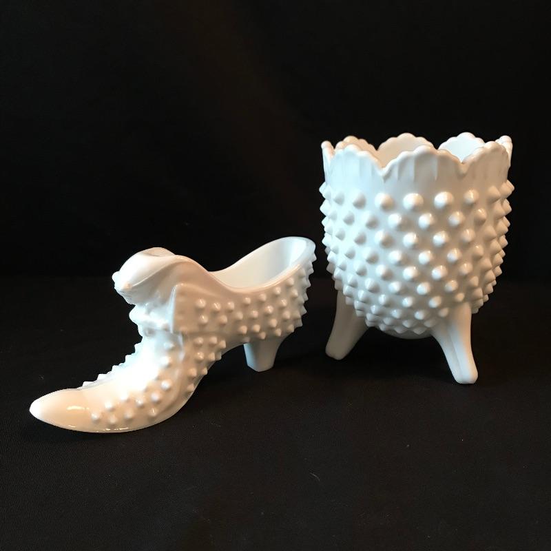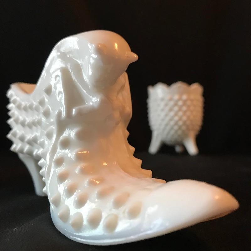Six piece collection all appearing like Milk Glass including an electric globe lamp. Lamp stands about 19” tall and has three separate light settings- top, bottom and both top and bottom. Lot also features a couple vases, a 7.5” tall stemmed candy dish. Don’t miss out on the two knobbed vanity pieces, including a cat adorned boot. See photos. No shipping.