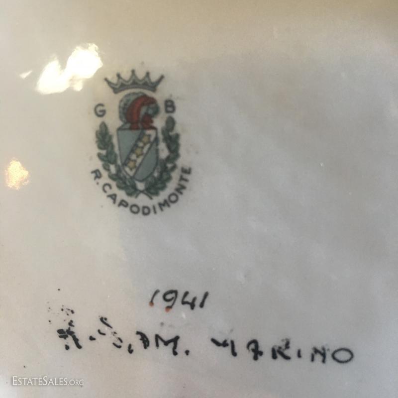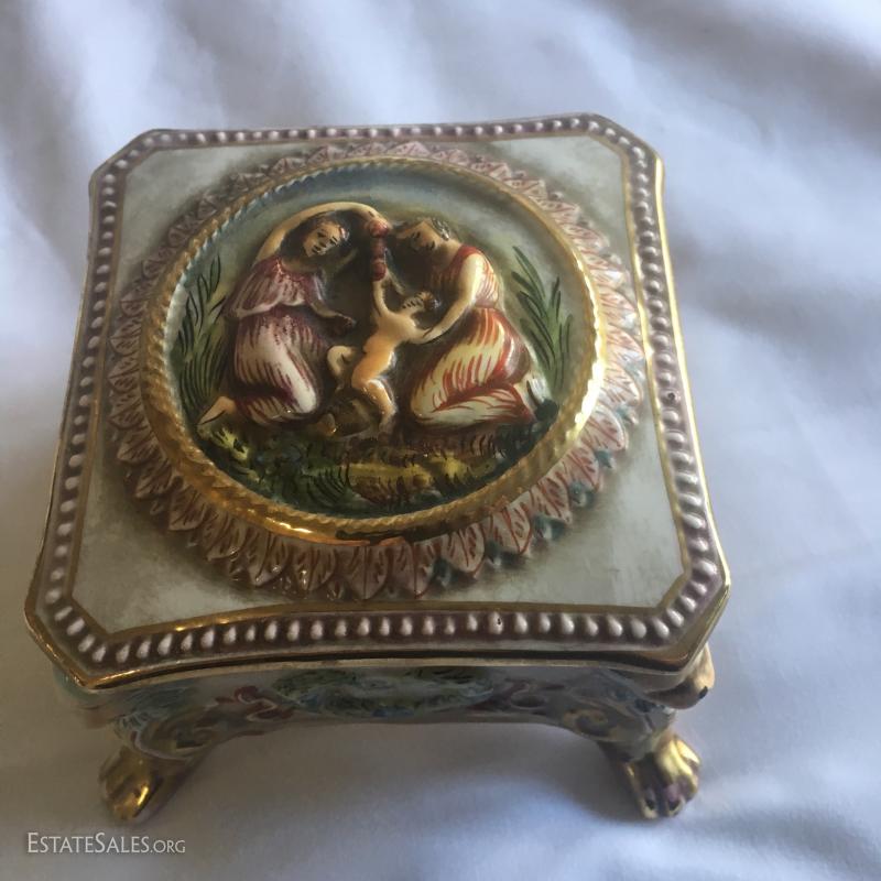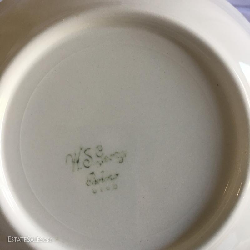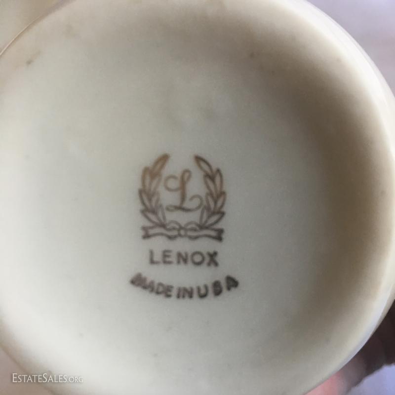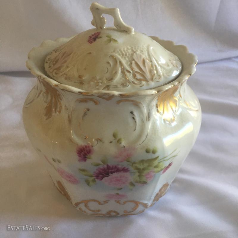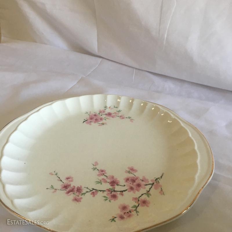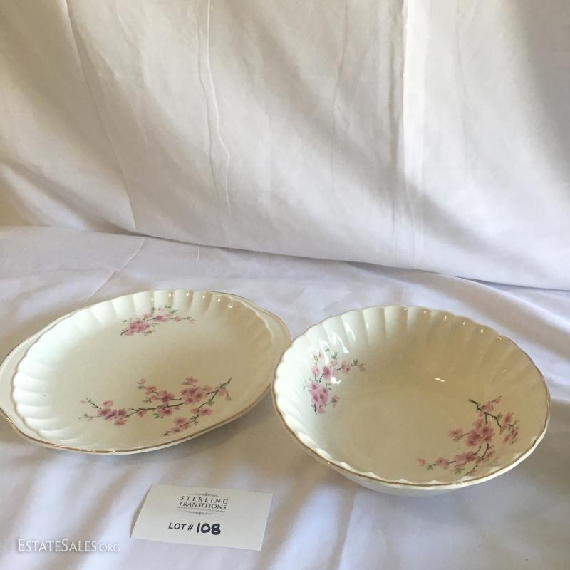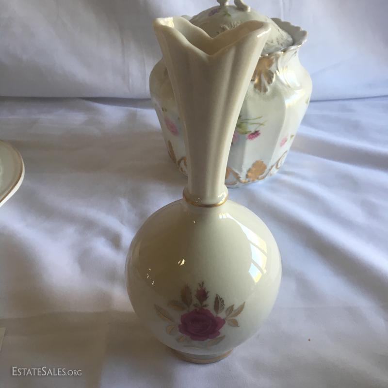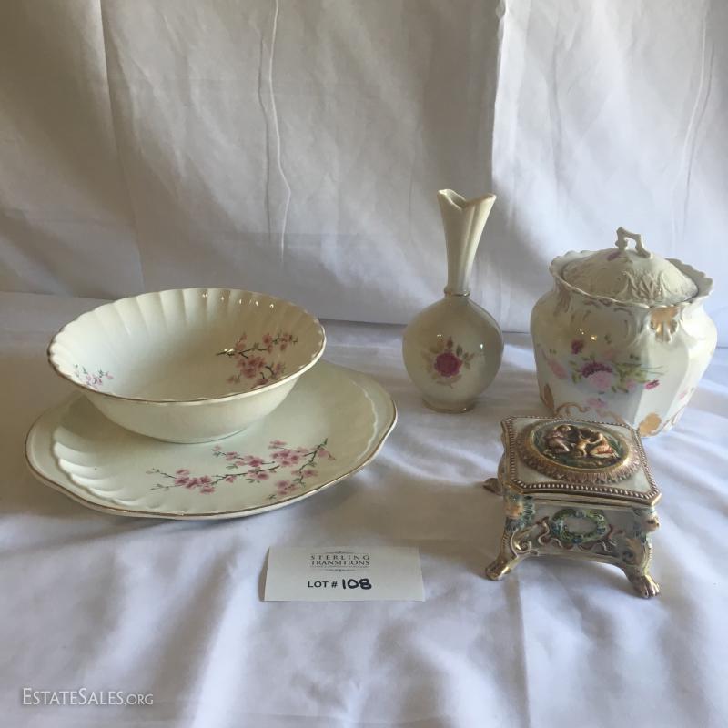 Cherry Blossom bowl and platter set by W.S. George, Vanity box with lid and gold trim by R. Capodimonte dated 1941, Biscuit Jar with lid and a Lenox bud vase.