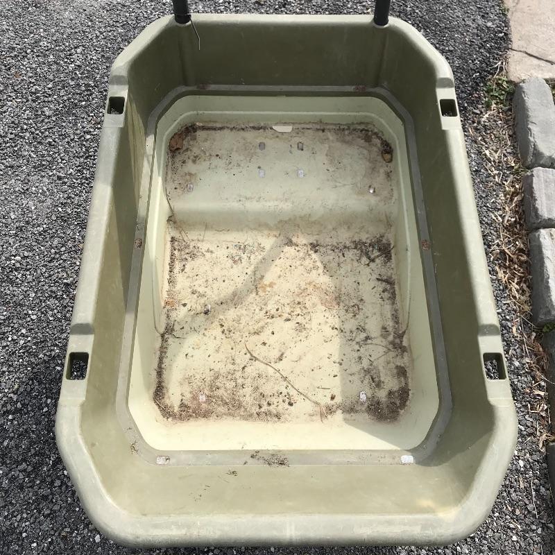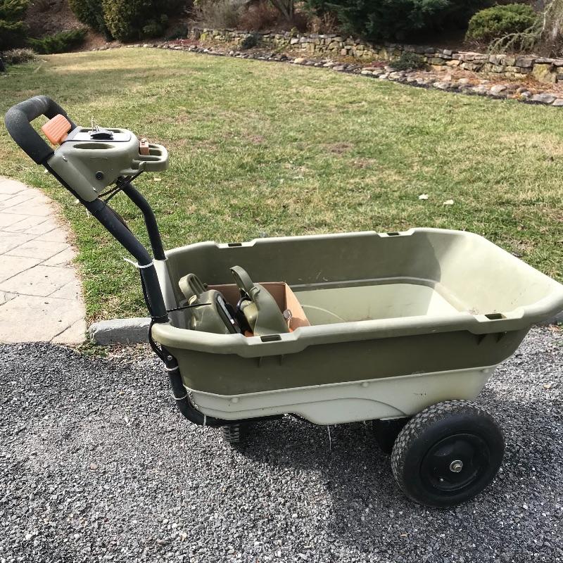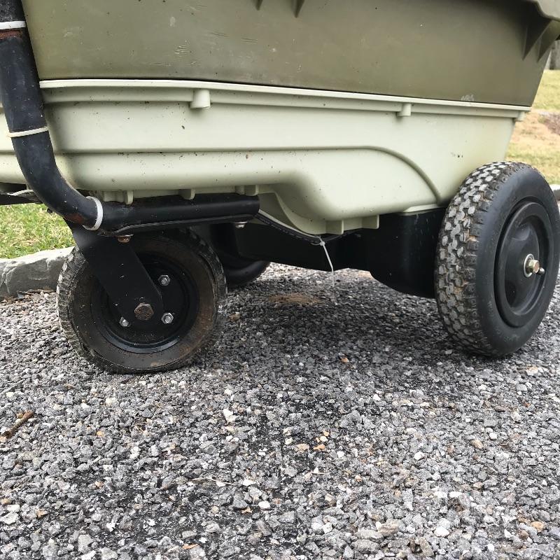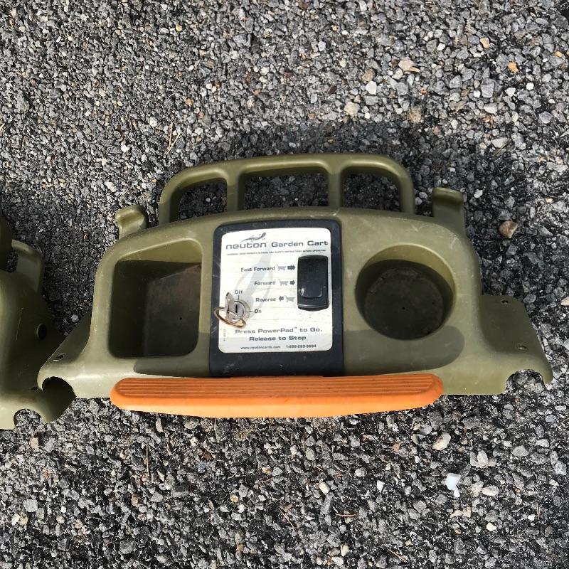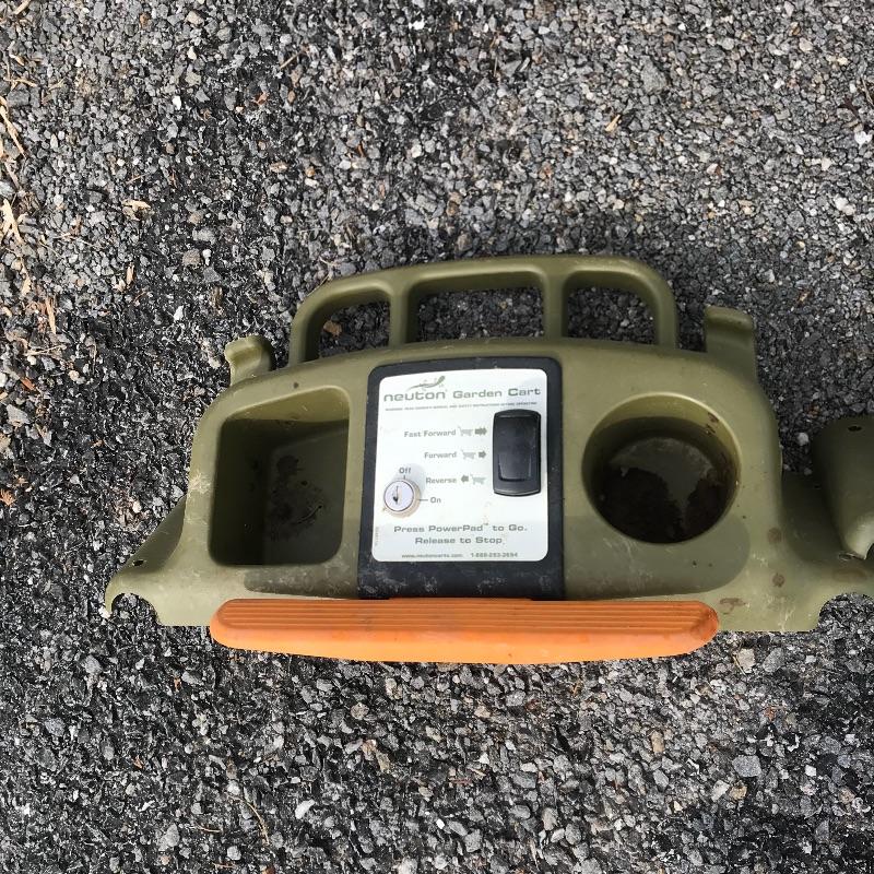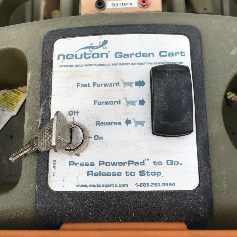 Neutron Garden Cart with three control caddies (one currently attached). Works when turned on, but overall condition, including extra caddies, is unknown. One wheel is in need of replacement, although cart still rolls well while empty. see photos. No shipping.