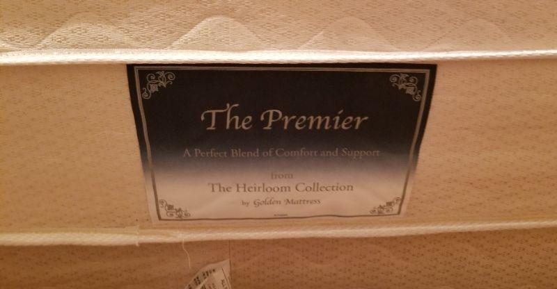 Vintage pair of twin beds - solid wood - with super clean mattress sets by the Golden Meadows company. Very comfy. You also get the matching Matelasse bedspread and pillow sham for each - in avocado green. The headboards are each 42" wide. Note: this set is upstairs - you have to be prepared to move them yourselves. You are bidding on the pair.