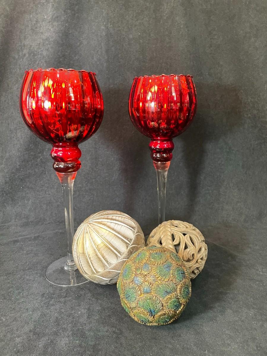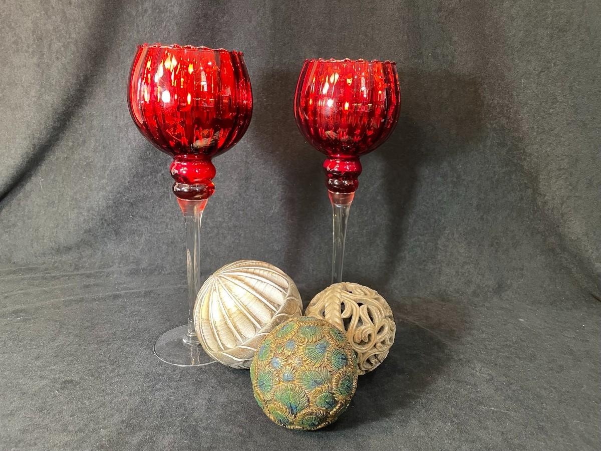 Lot 108 Pair of Glass Candle Stands & 3 Orbs