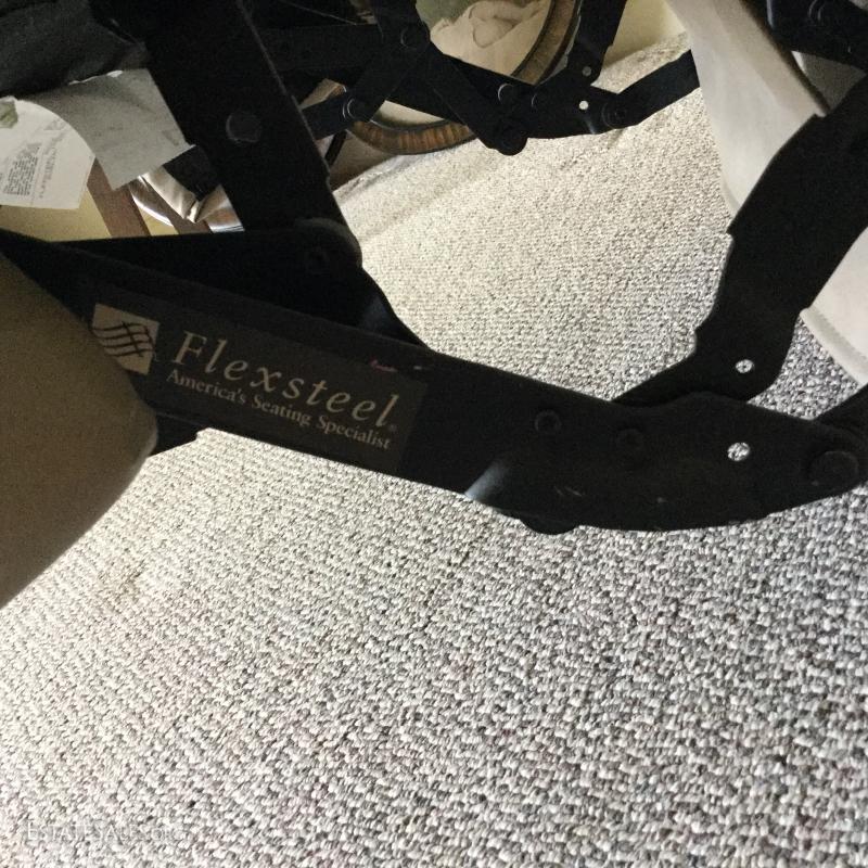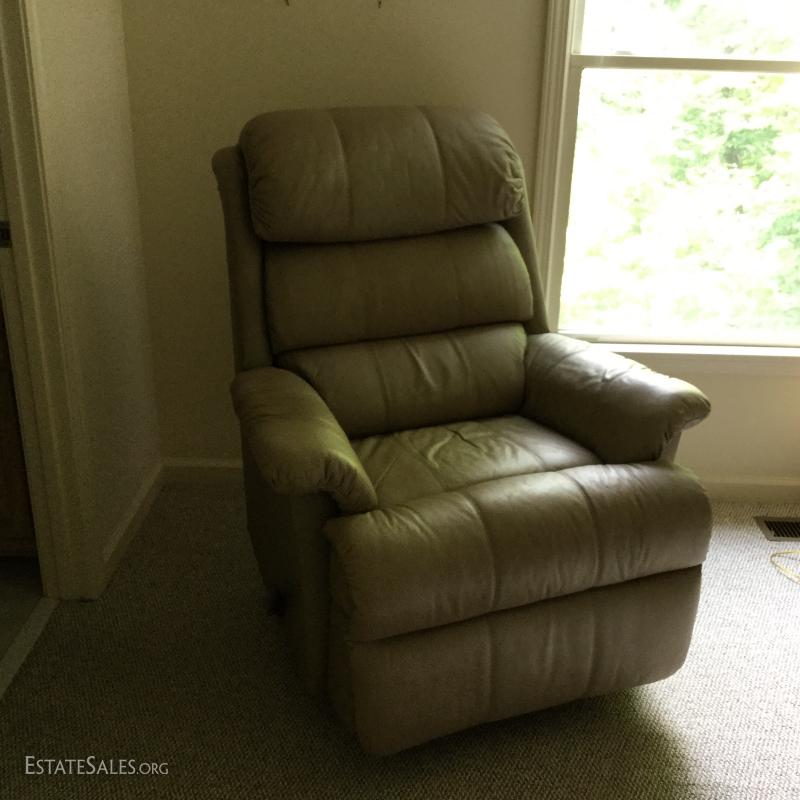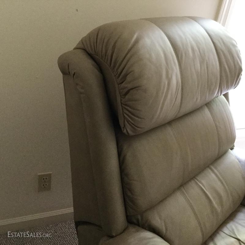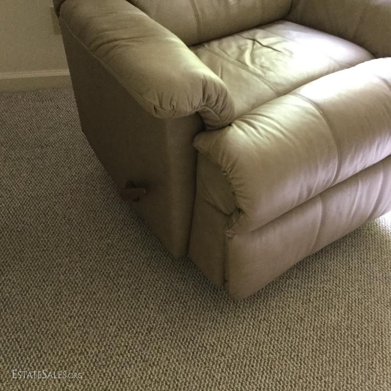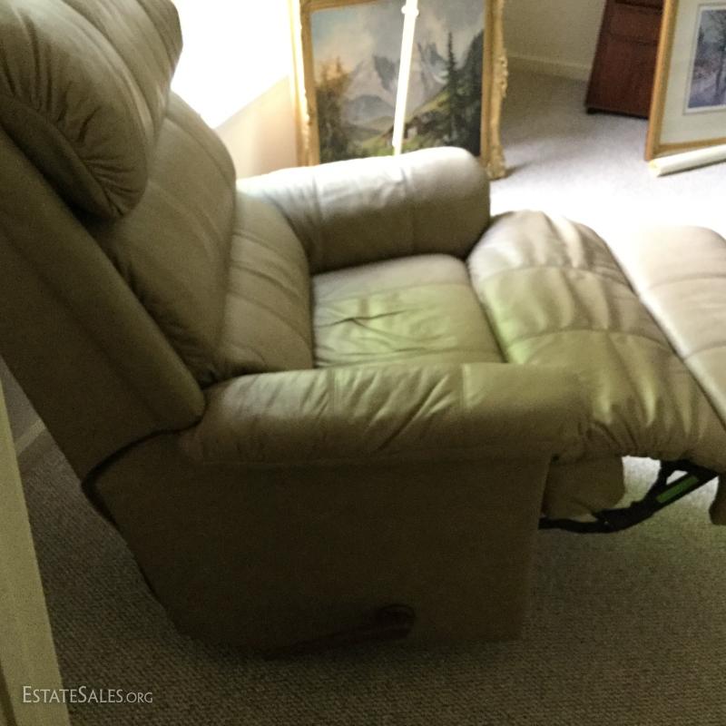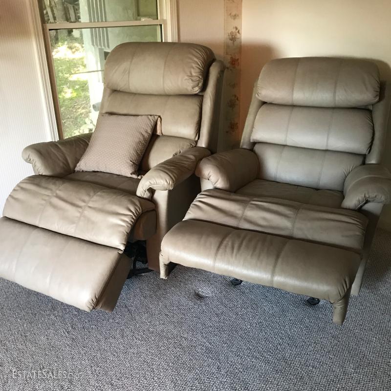 Beige adjustable leather recliners in excellent condition. One luxurious recliner Is rocking and the second is a swivel action recliner that spins all the way around. Super comfortable. Made by FlexSteel.