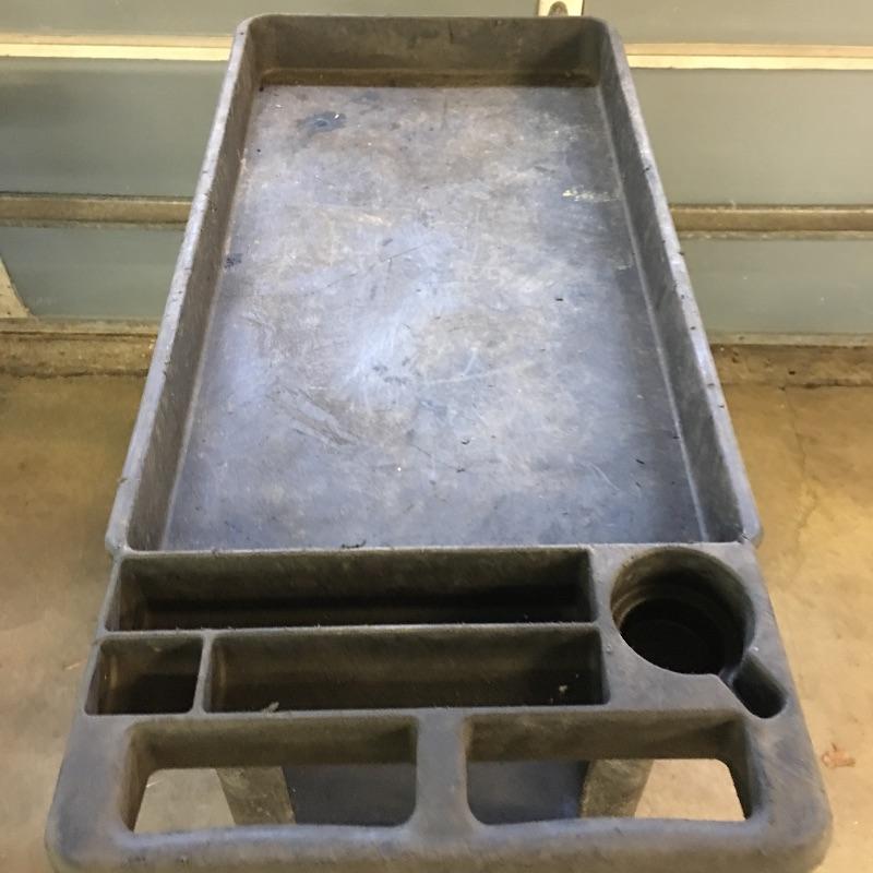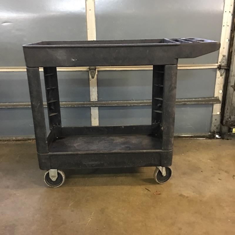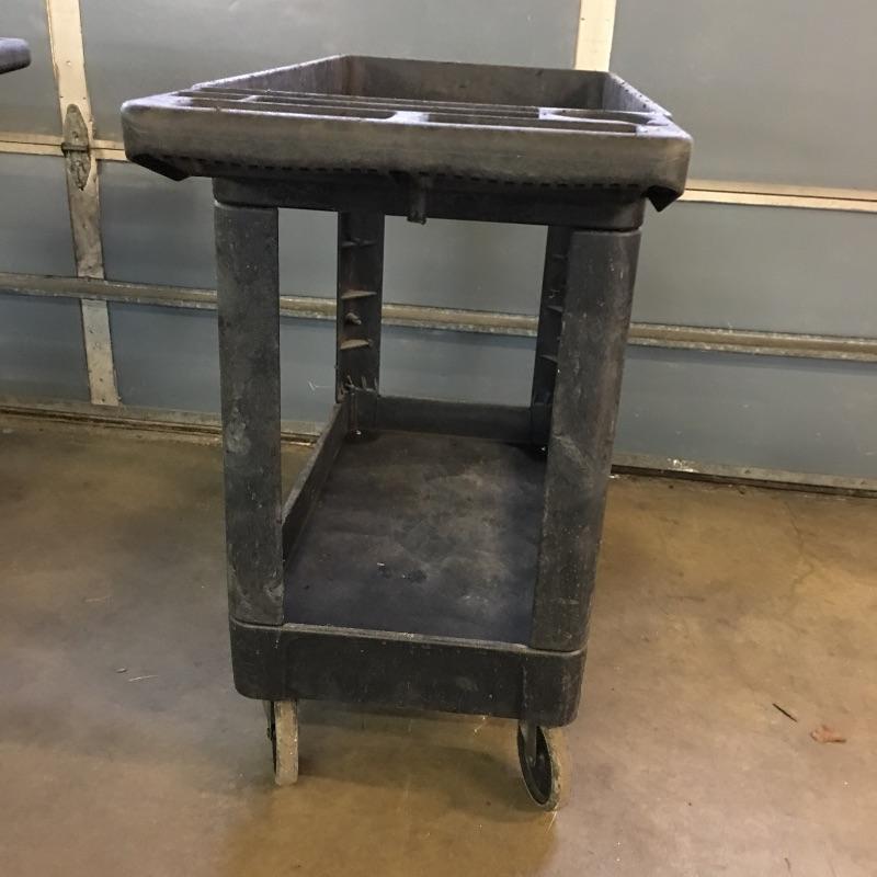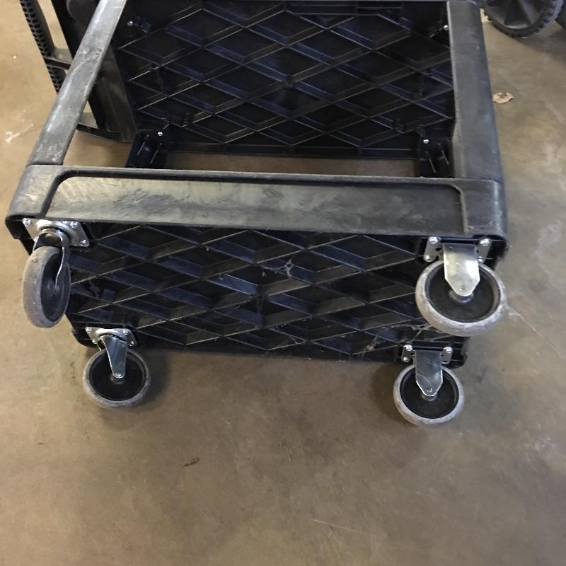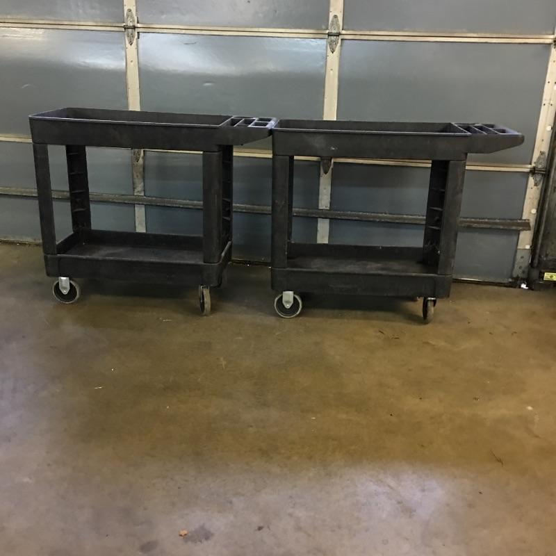 Pair of composite Tool carts. Carts have two inline wheels and two casters with two shelves and small compartments in handle. You will wonder how you got along with out these handy carts.