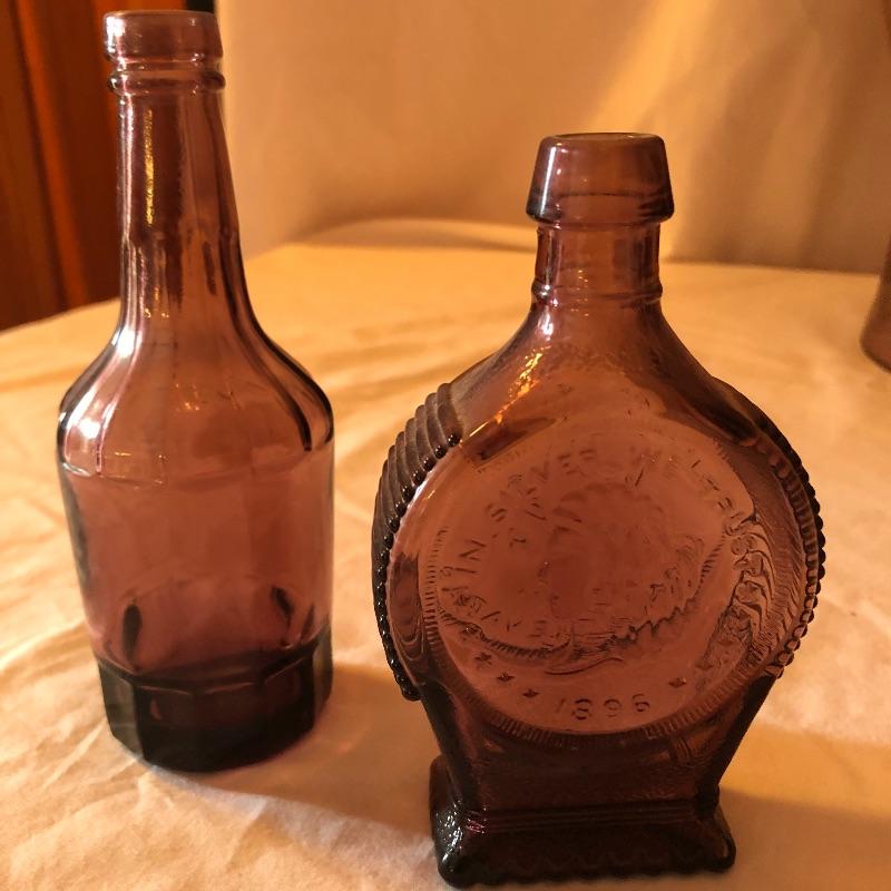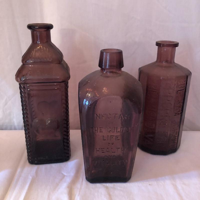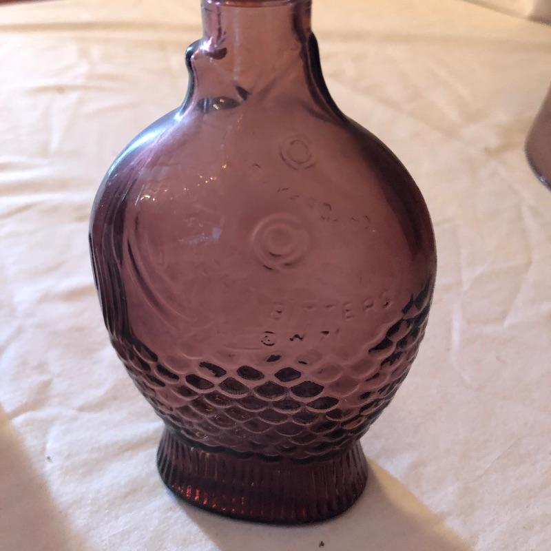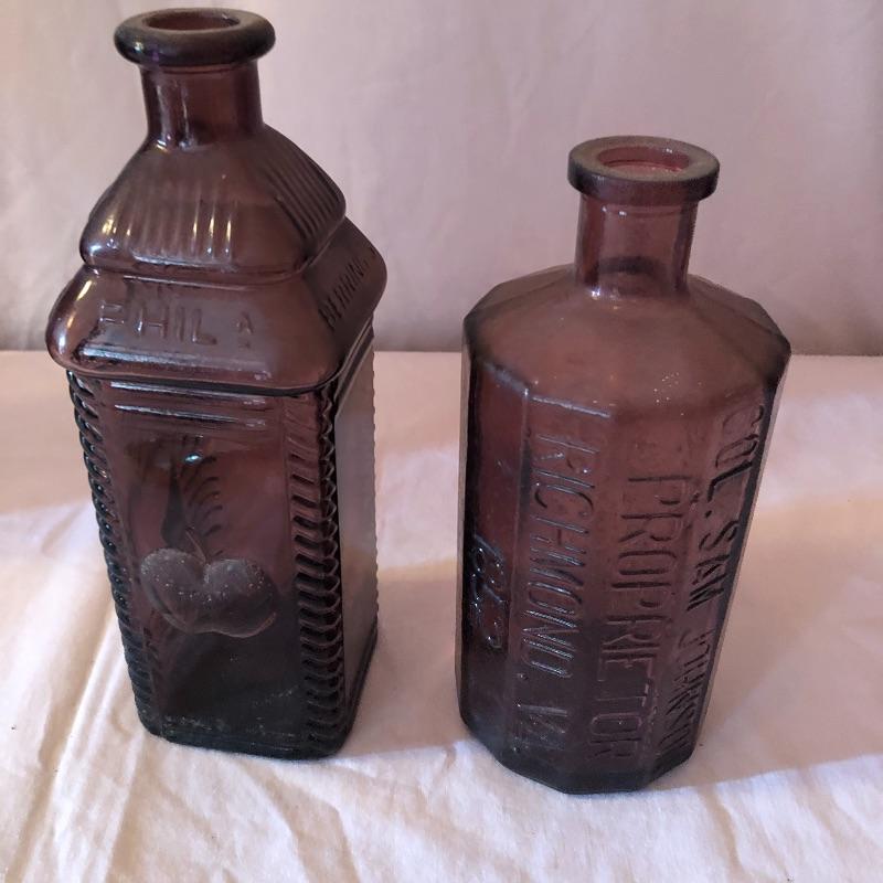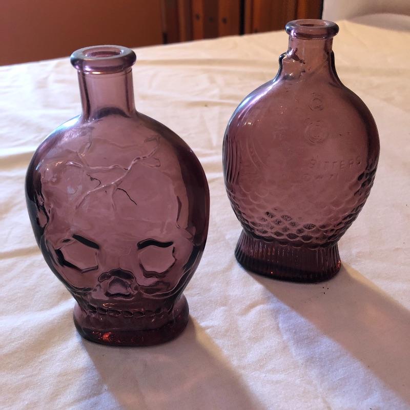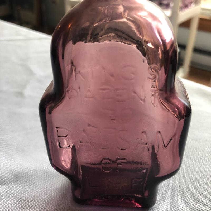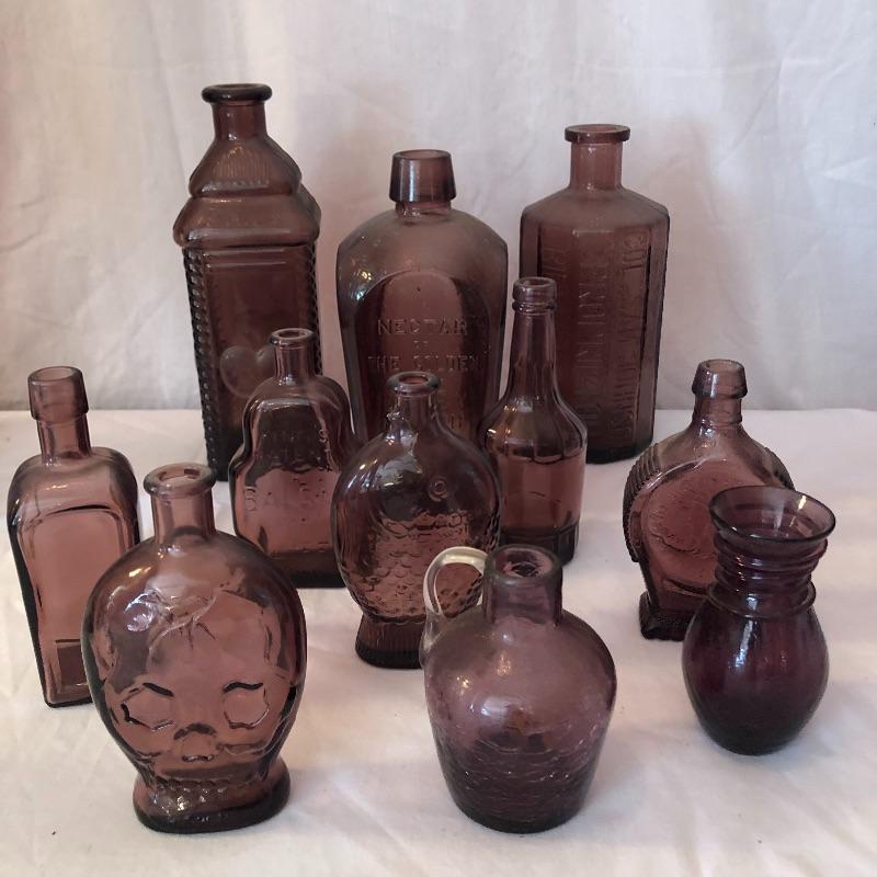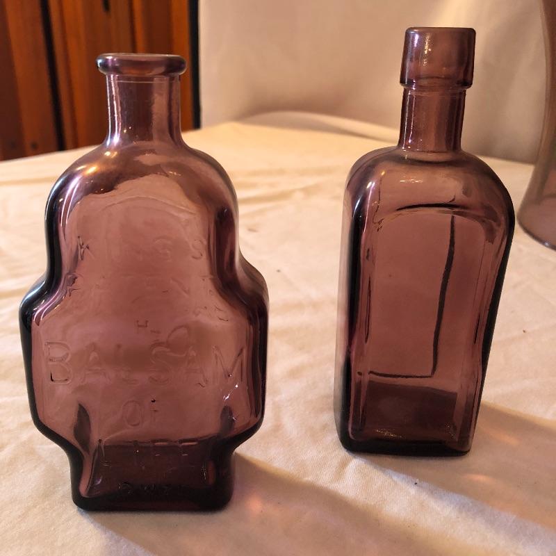 This lot includes two hurricane shades, two narrow flower vases, two purple containers with lids and eleven purple bottles. The fish shaped bottle reads, “Children’s Delight.” The skull bottle appears to read, “H O W 71 and “W Heaton NJ” on the bottom. Next photographed bottle reads, “King’s Patent Balsam of Life.” Oval bottle reads, “In Sliver We Trust 1896.” The larger bottle reads, “Nectar of The Golden Life of Health And Vitality.” The last two bottles read, “Herring’s Bitters and “Col. Sam Johnson Proprietor Richmond, Va 1852.” Shipping Available!